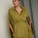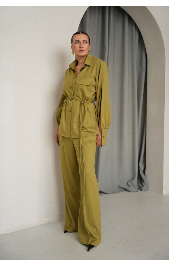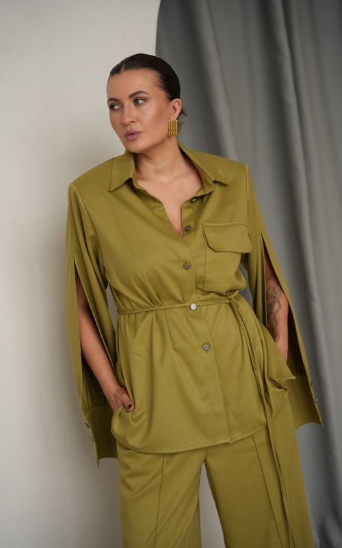 Тонкий пояс в комплекте позволяет менять характер изделия: носить рубашку свободно или подчёркивать талию, создавая более женственный силуэт.