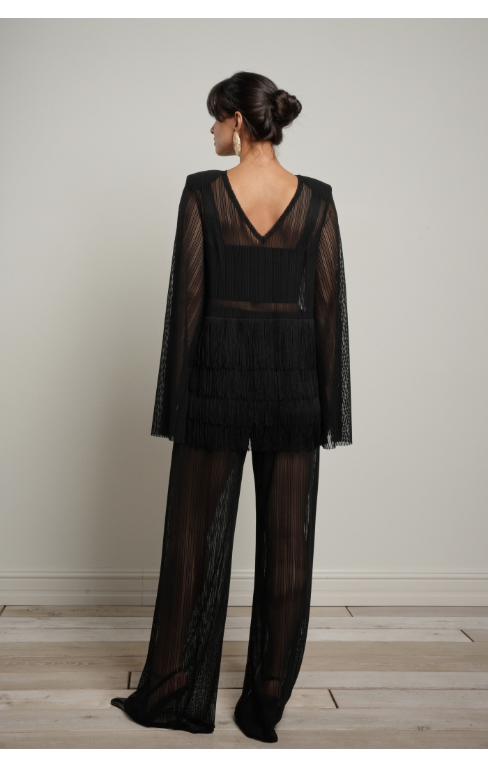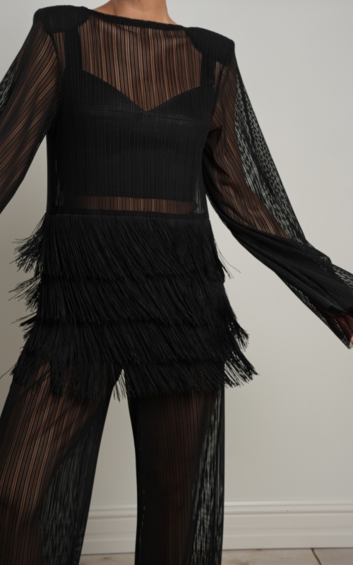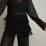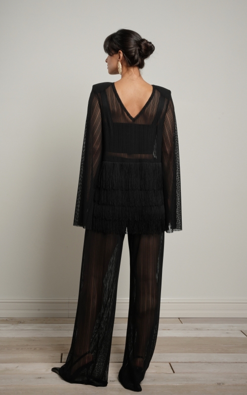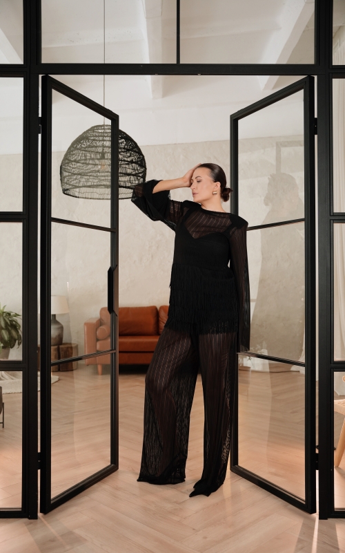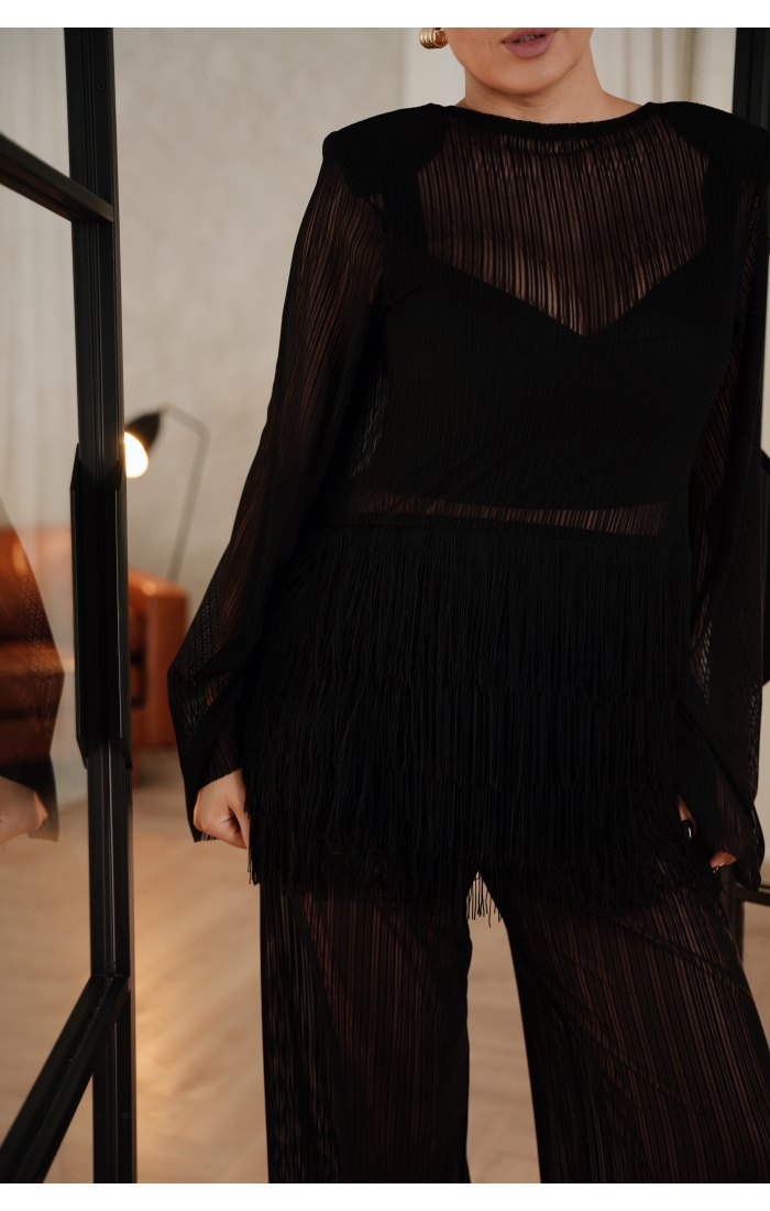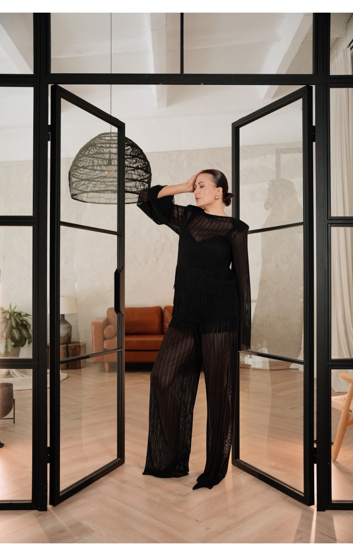 Особый акцент — декоративная бахрома. Четыре ряда бахромы расположены на уровне талии и мягко двигаются при ходьбе, создавая эффект живой динамики. Бахрома закреплена на атласной основе: это позволяет сохранить полупрозрачность ткани, но при этом деликатно прикрыть важные зоны — паховую область и линию бёдер.