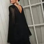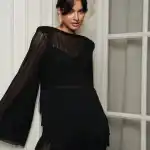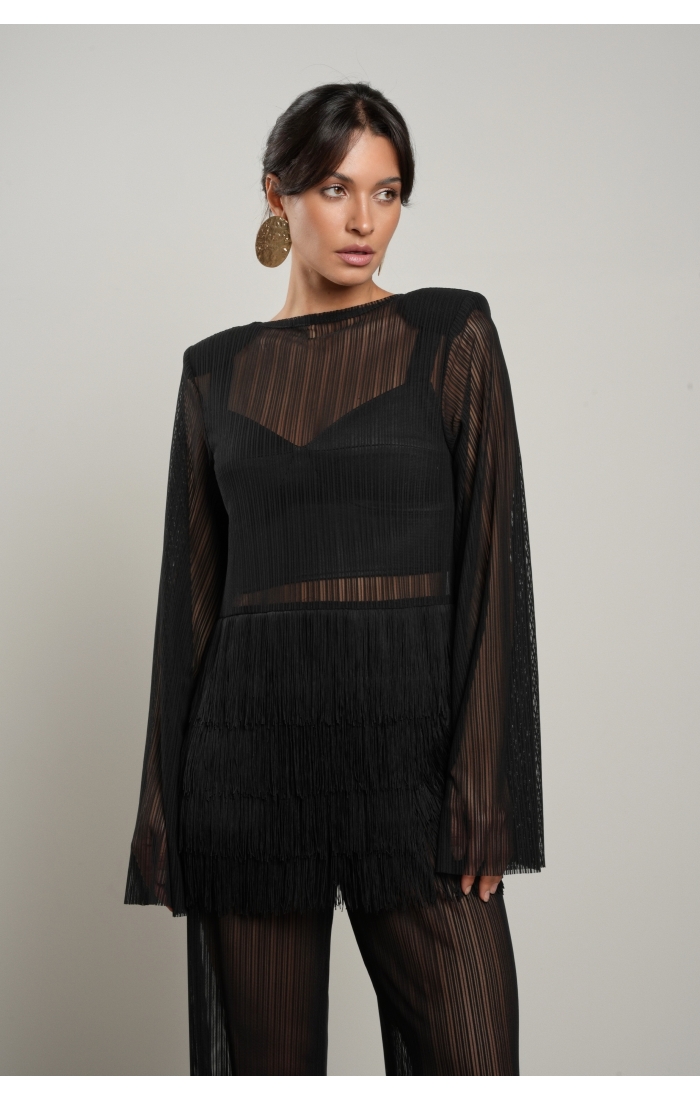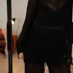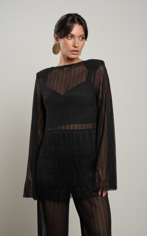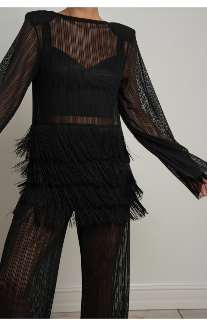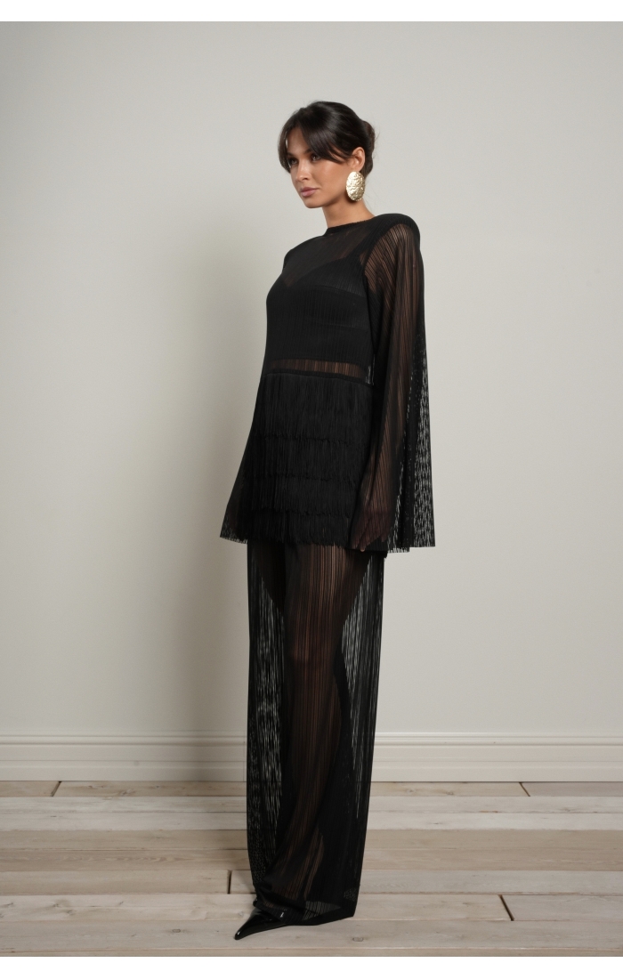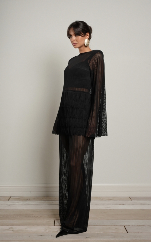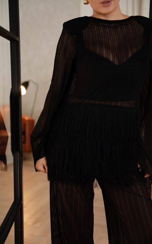 Особый акцент — декоративная бахрома. Четыре ряда бахромы расположены на уровне талии и мягко двигаются при ходьбе, создавая эффект живой динамики. Бахрома закреплена на атласной основе: это позволяет сохранить полупрозрачность ткани, но при этом деликатно прикрыть важные зоны — паховую область и линию бёдер.