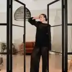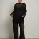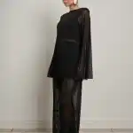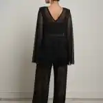 Комплект состоит из свободных брюк на резинке и туники с V-образным вырезом. Благодаря отсутствию вытачек тунику можно носить двумя способами — V-образным вырезом вперёд или на спину, каждый раз создавая новое настроение образа.