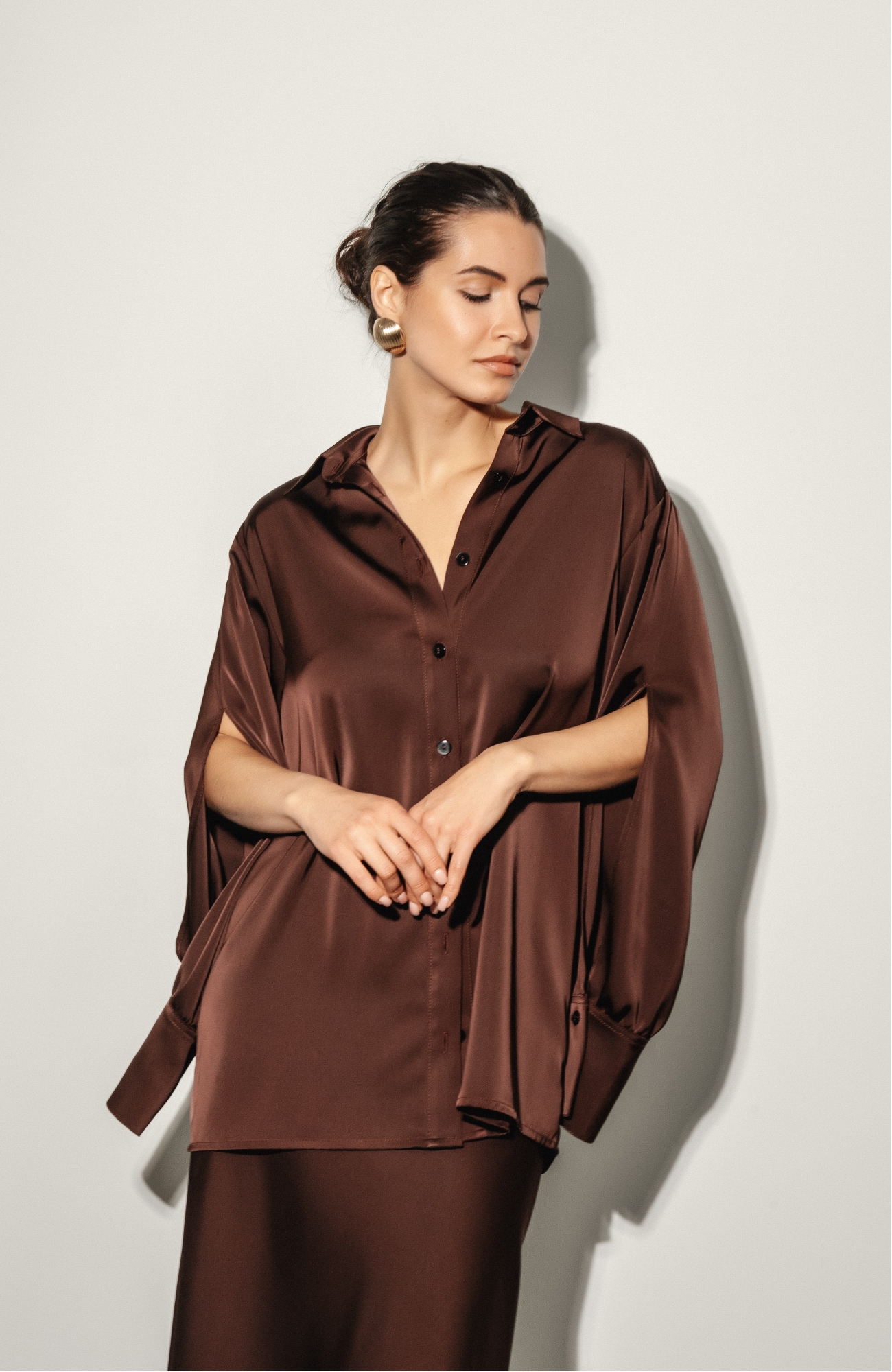 Рубашка свободного кроя, комфортной длины, с глубокими разрезами на рукавах. Выполнена из шелка.