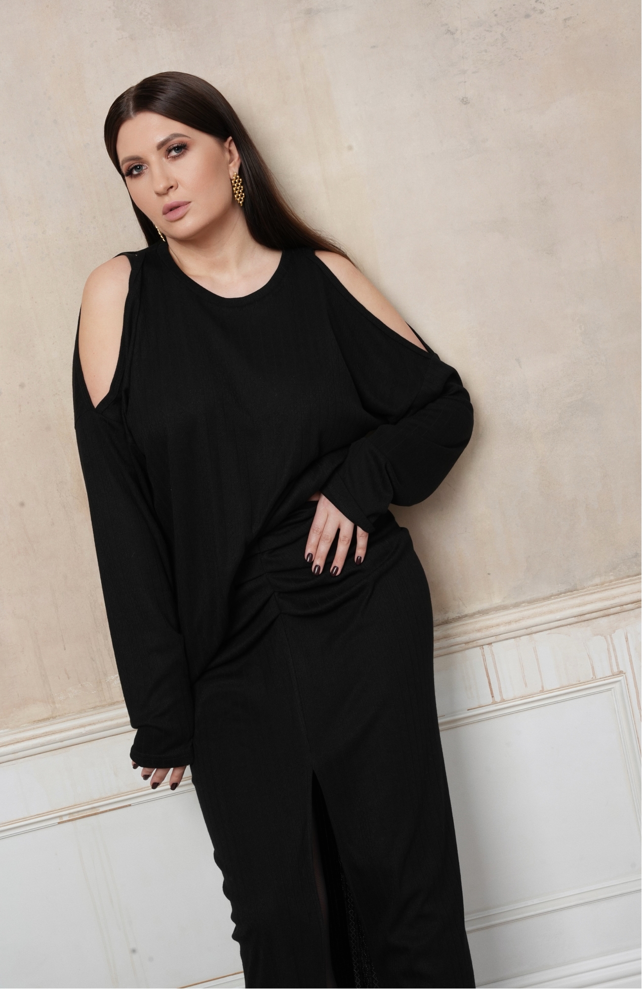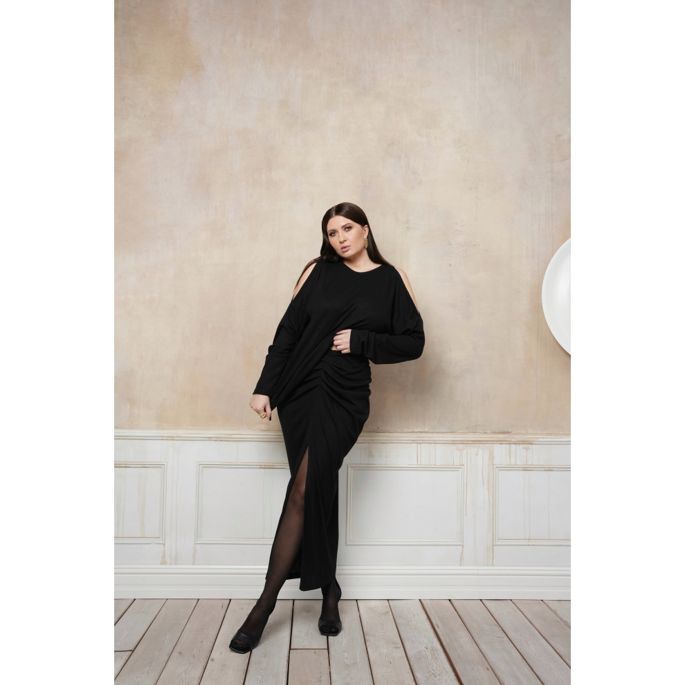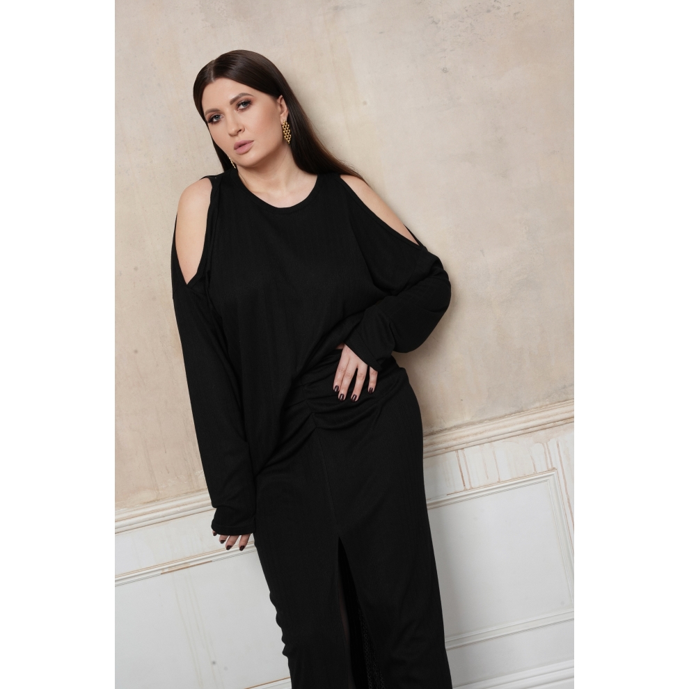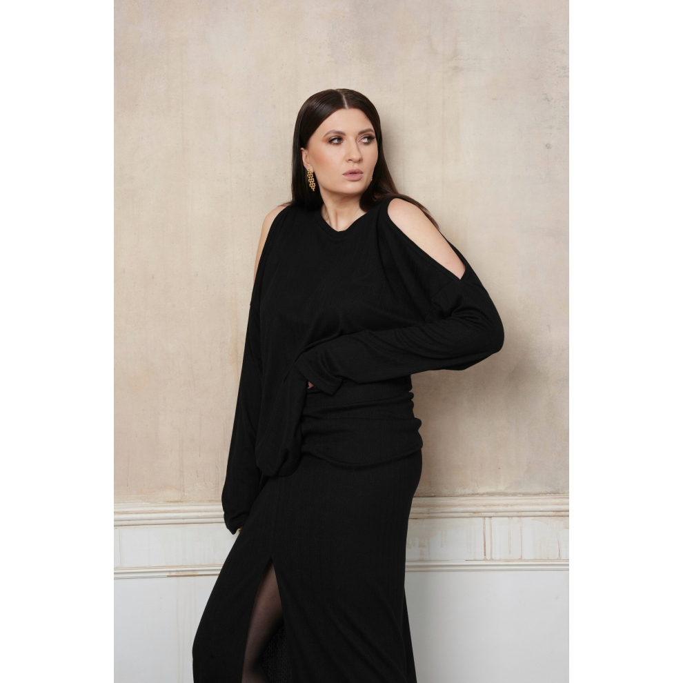 Лонгслив с открытыми плечами. Оверсайз крой, длина до середины бедра позволяет носить его на выпуск, частично заправлять либо драпировать любым удобным способом. Изделие выполнено из мягкого, вискозного, перфорированного трикотажа приятного к телу.