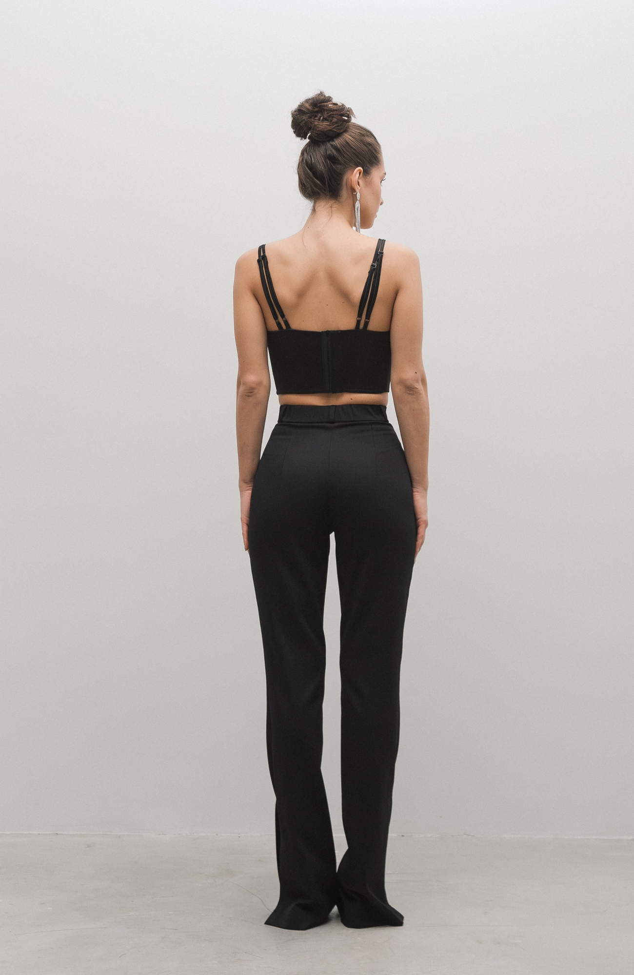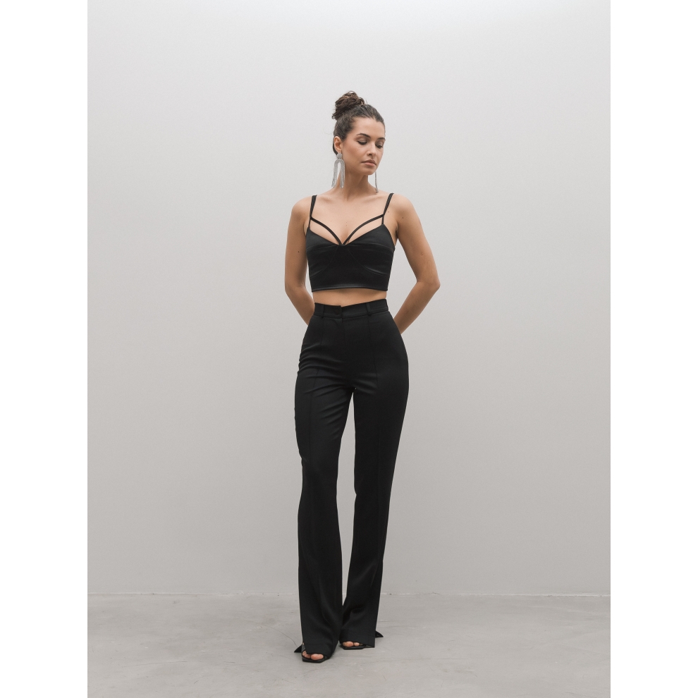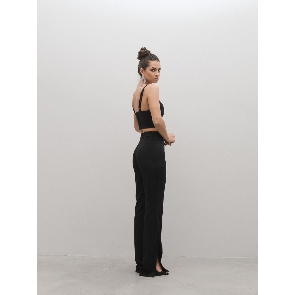 Брюки клеш выполнены из поливискозной мягкой костюмной ткани. Акцентом являются разрезы снизу по бокам. Застегиваются на молнию и пуговицу. Сзади на линии талии расположена резинка для комфортной посадки.