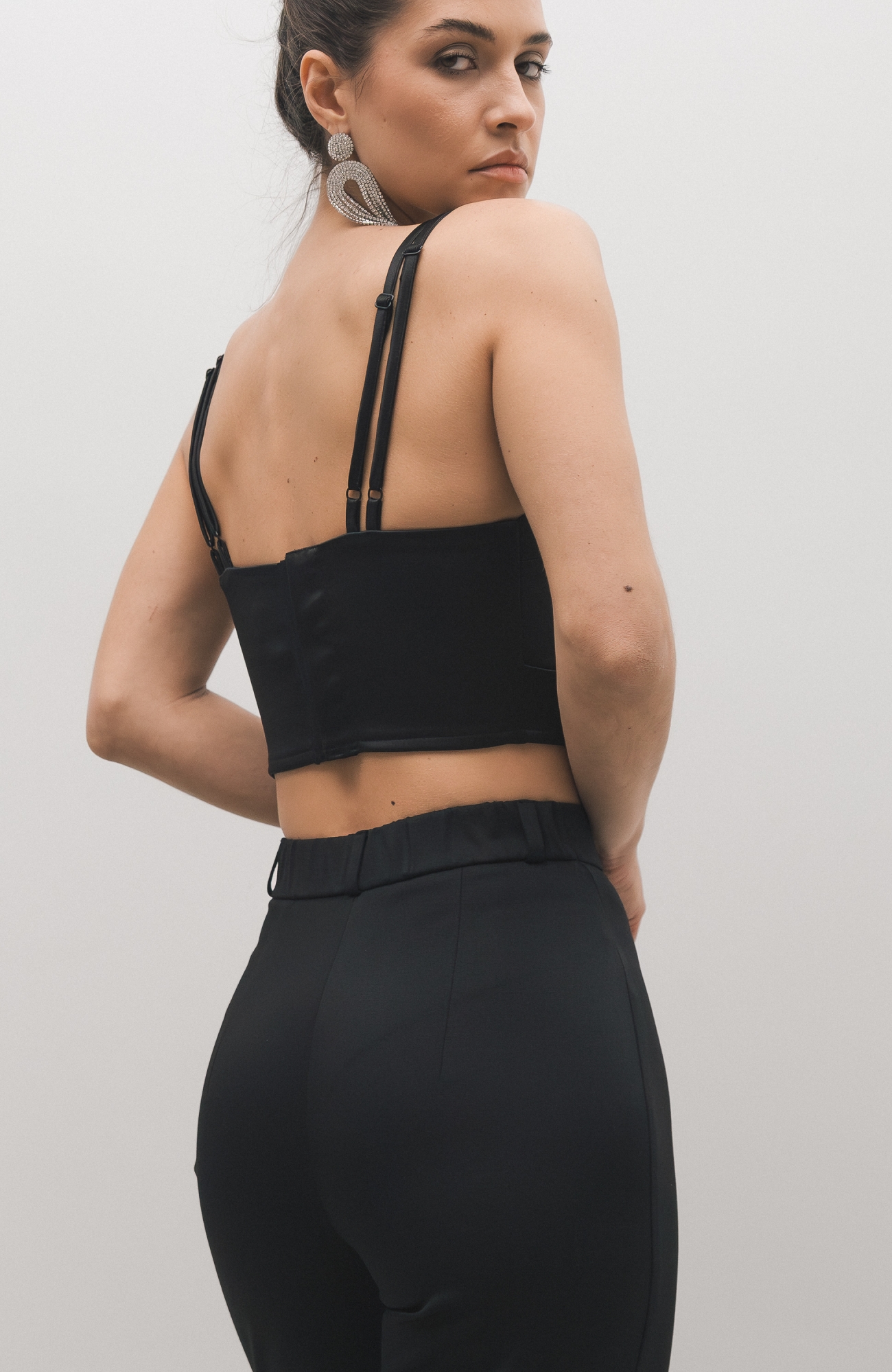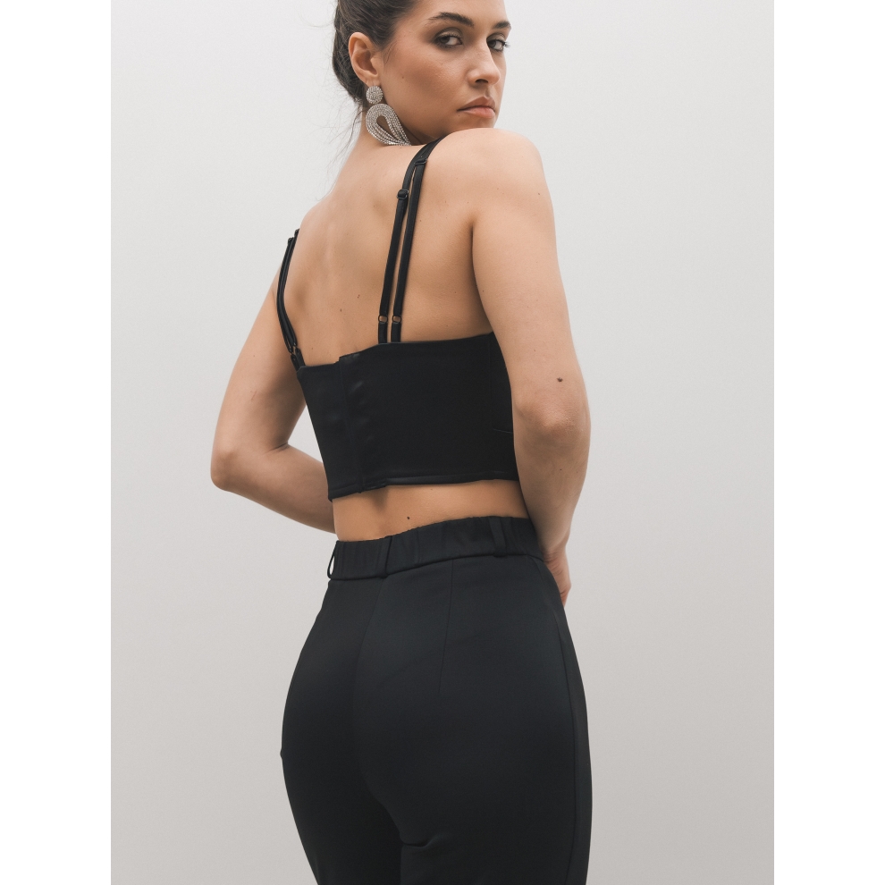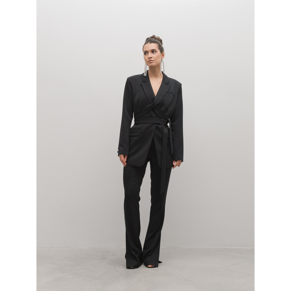 Брюки клеш выполнены из поливискозной мягкой костюмной ткани. Акцентом являются разрезы снизу по бокам. Застегиваются на молнию и пуговицу. Сзади на линии талии расположена резинка для комфортной посадки.