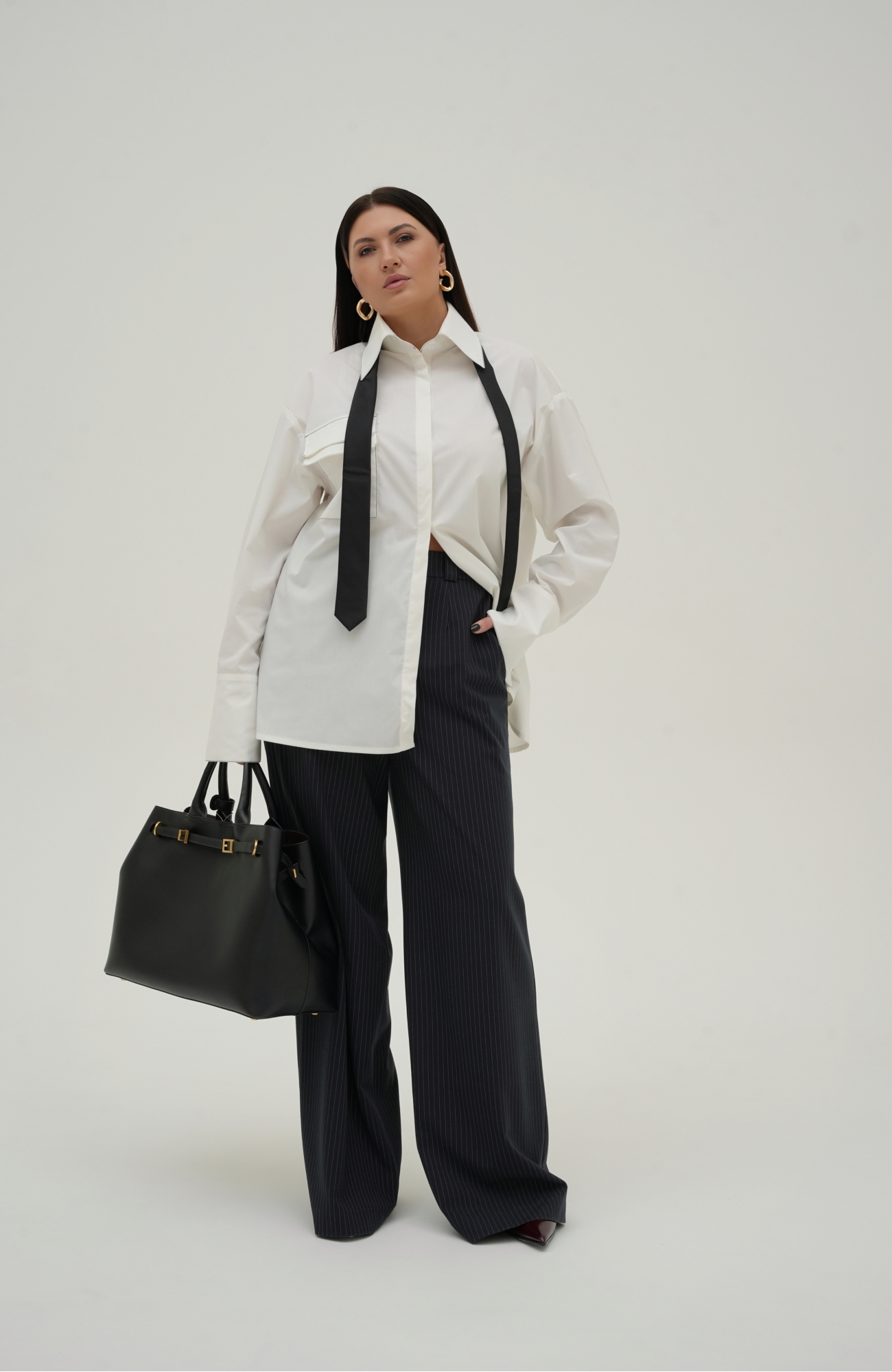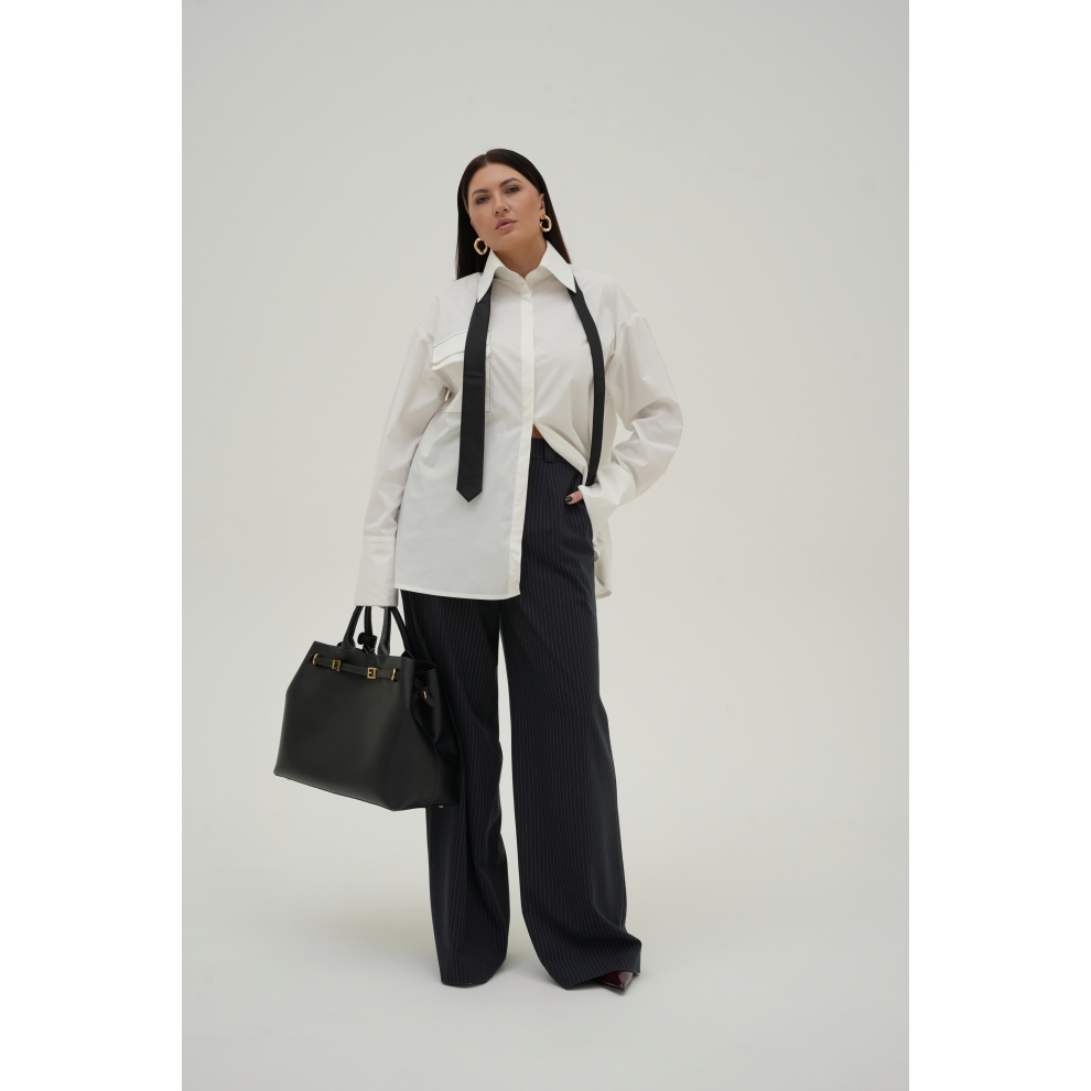 Брюки палаццо выполнены из вискозной костюмной ткани в полоску. Застегиваются на молнию и пуговицу. Сзади на линии талии расположена резинка для комфортной посадки. В боковых швах имеют два глубоких боковых кармана и два декоративных кармана-обманки на спинке изделия.