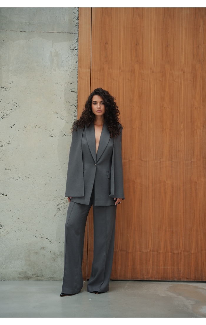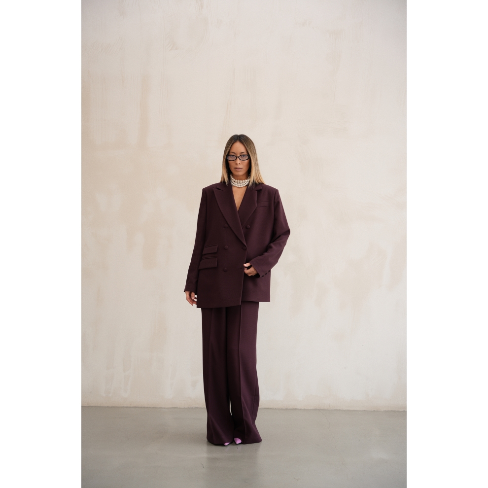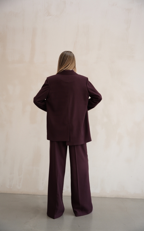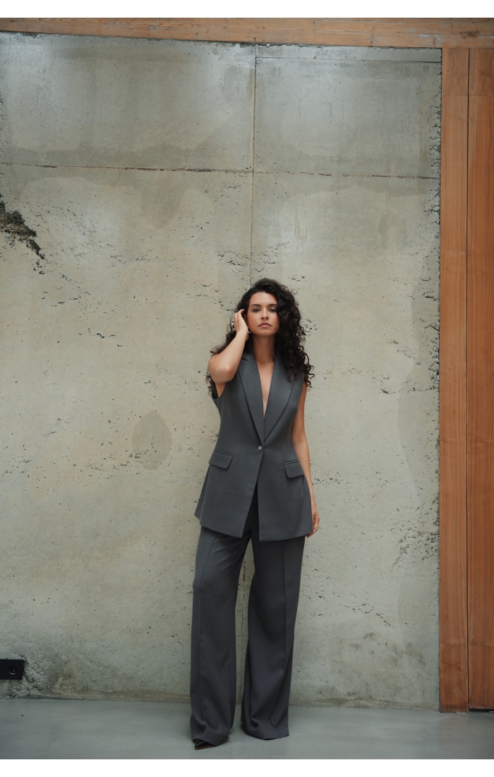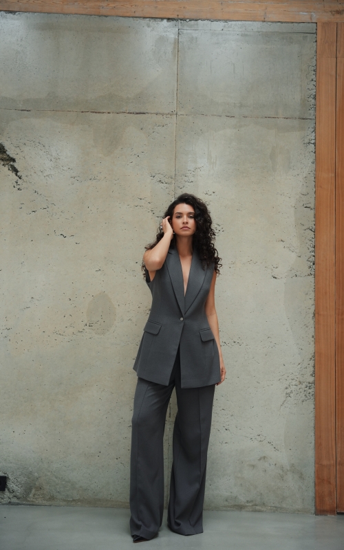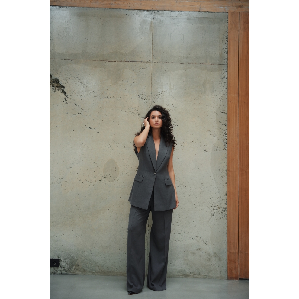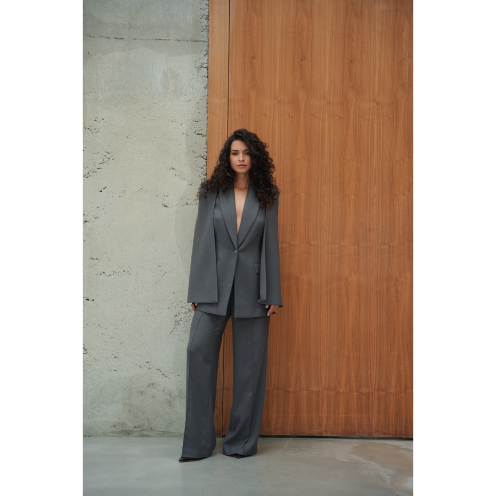 Брюки палаццо выполнены из поливискозной мягкой костюмной ткани. Модель имеет застроченную стрелку. Застегиваются на молнию и пуговицу. Сзади на линии талии расположена резинка для комфортной посадки. В боковых швах имеют два глубоких боковых кармана и два декоративных кармана-обманки на спинке изделия.