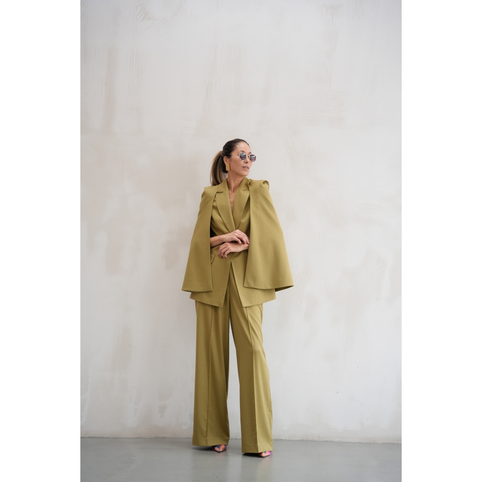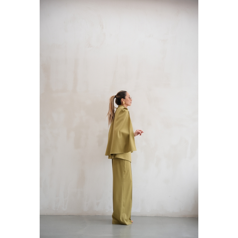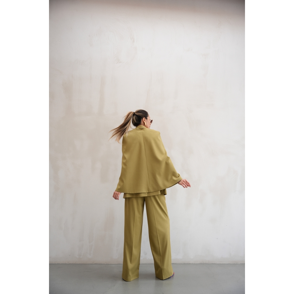 Брюки палаццо выполнены из поливискозной мягкой костюмной ткани. Модель имеет застроченную стрелку. Застегиваются на молнию и пуговицу. Сзади на линии талии расположена резинка для комфортной посадки. В боковых швах имеют два глубоких боковых кармана и два декоративных кармана-обманки на спинке изделия.