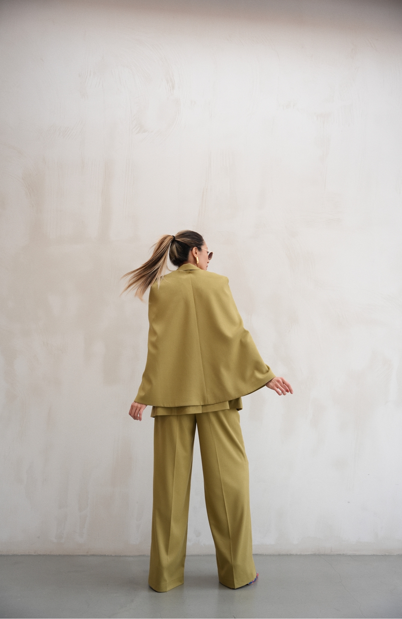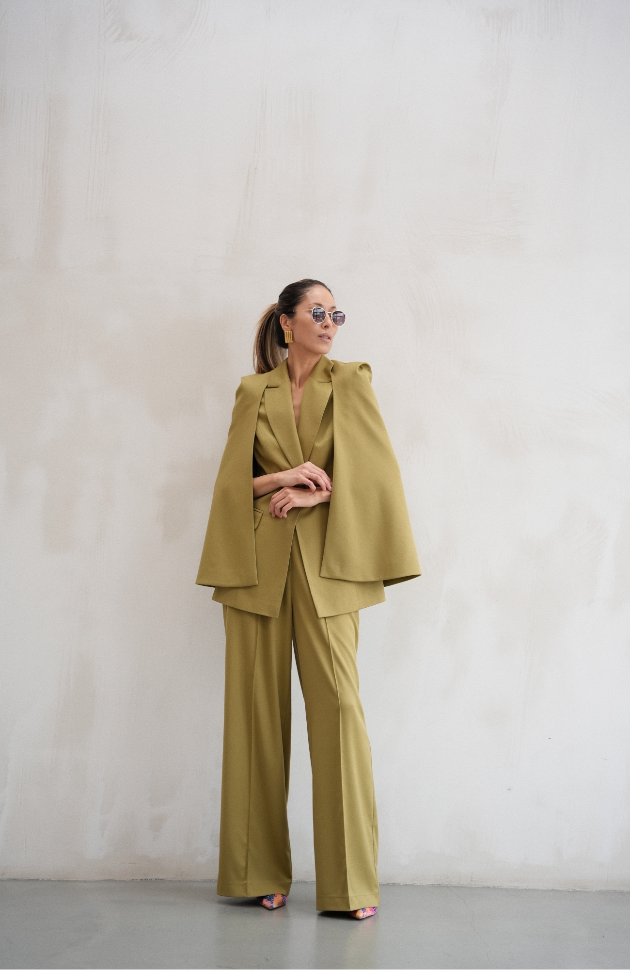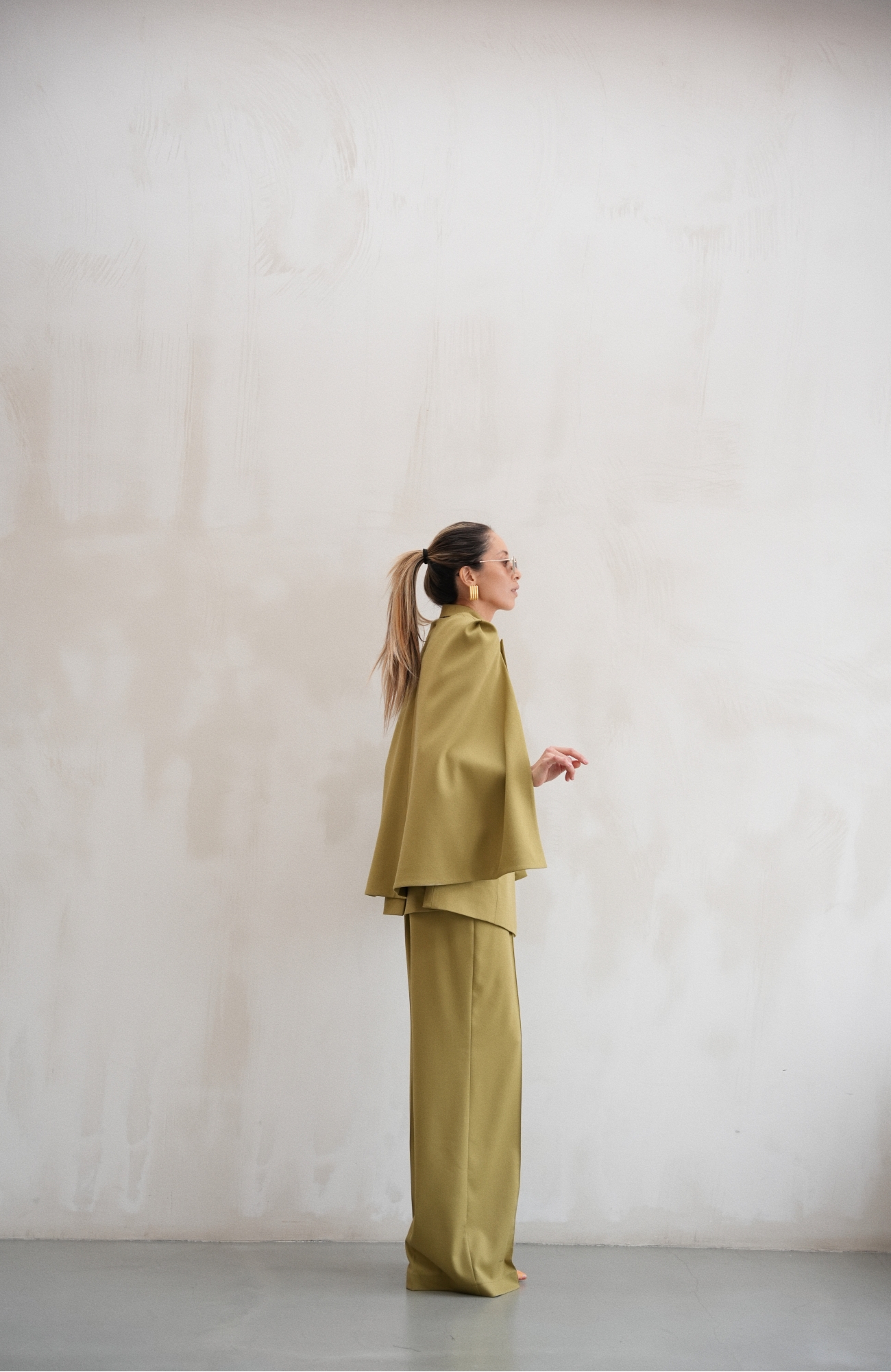 Брюки палаццо выполнены из поливискозной мягкой костюмной ткани. Модель имеет застроченную стрелку. Застегиваются на молнию и пуговицу. Сзади на линии талии расположена резинка для комфортной посадки. В боковых швах имеют два глубоких боковых кармана и два декоративных кармана-обманки на спинке изделия.