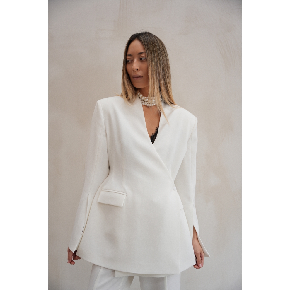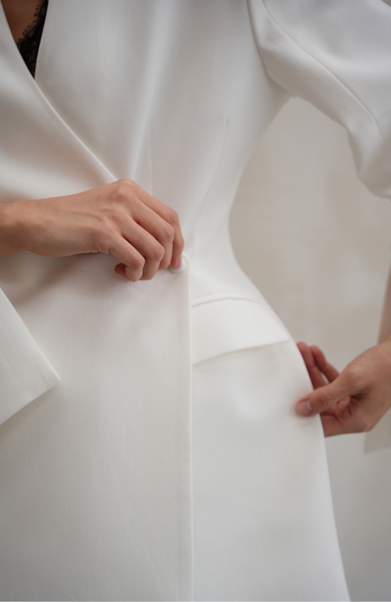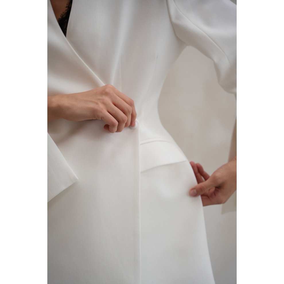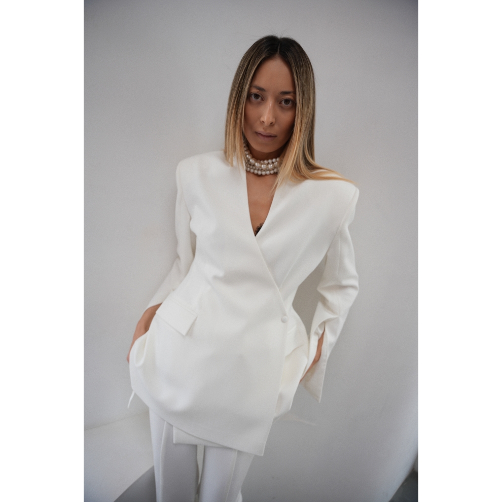 Жакет выполнен из поливискозной костюмной ткани. Жакет имеет акцентные плечи и выраженную талию, тем самым создает силуэт песочных часов. На жакете расположены кнопки, которыми можно регулировать объем талии. Дополните образ брюками клеш с разрезами снизу из весенней коллекции.