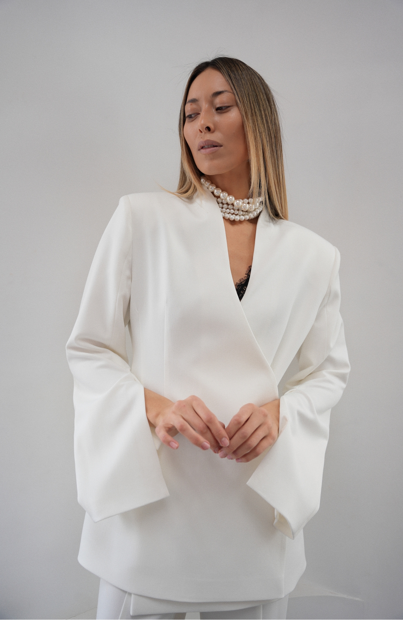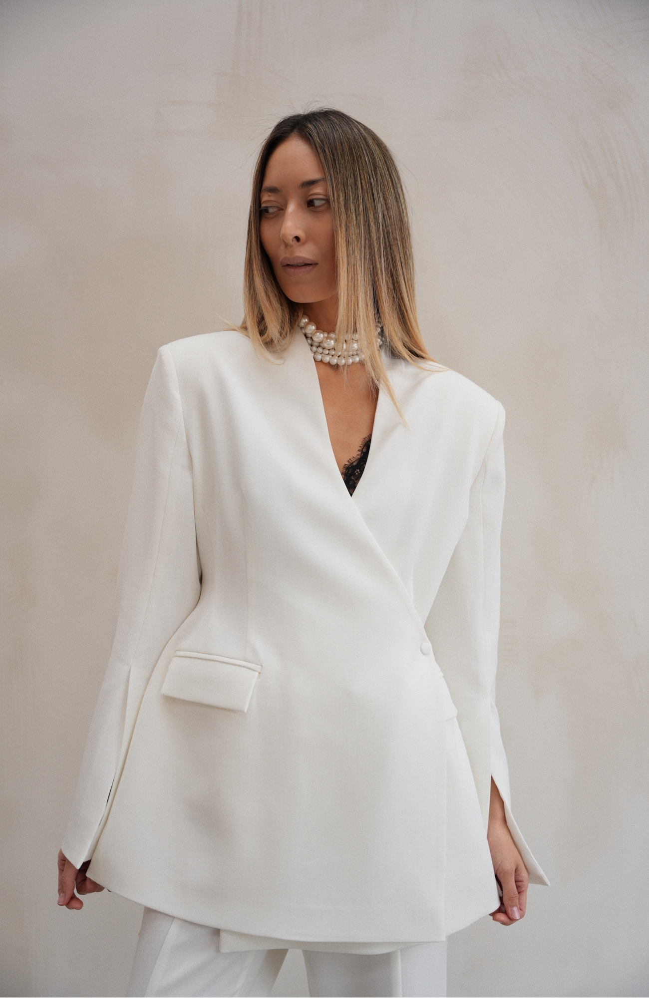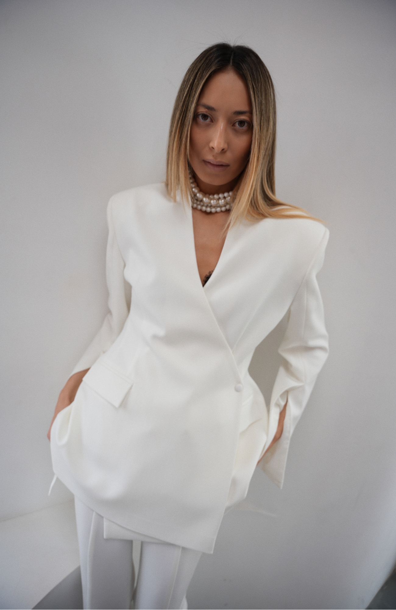 Жакет выполнен из поливискозной костюмной ткани. Жакет имеет акцентные плечи и выраженную талию, тем самым создает силуэт песочных часов. На жакете расположены кнопки, которыми можно регулировать объем талии. Дополните образ брюками клеш с разрезами снизу из весенней коллекции.