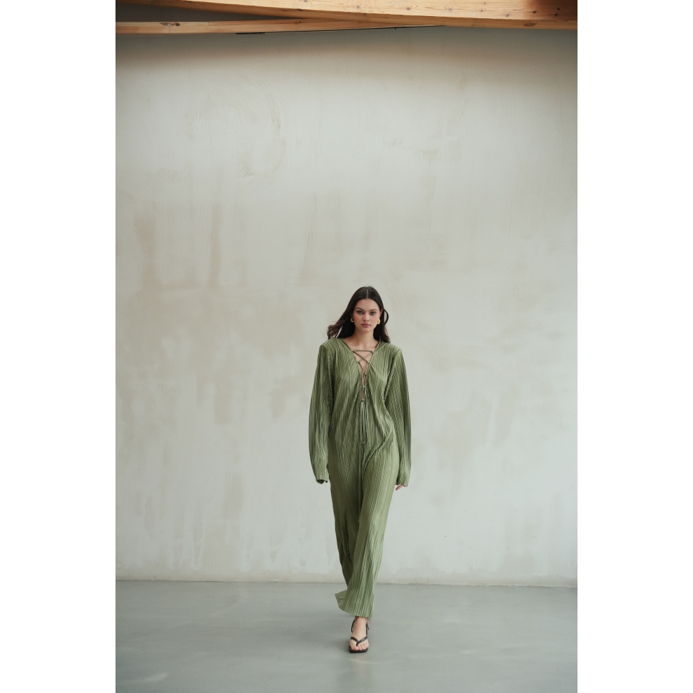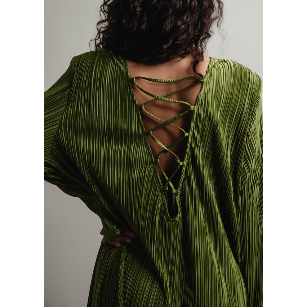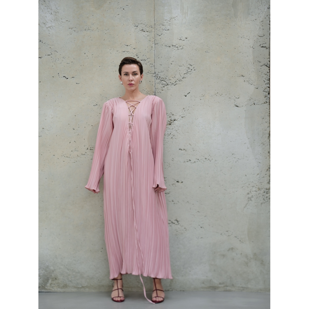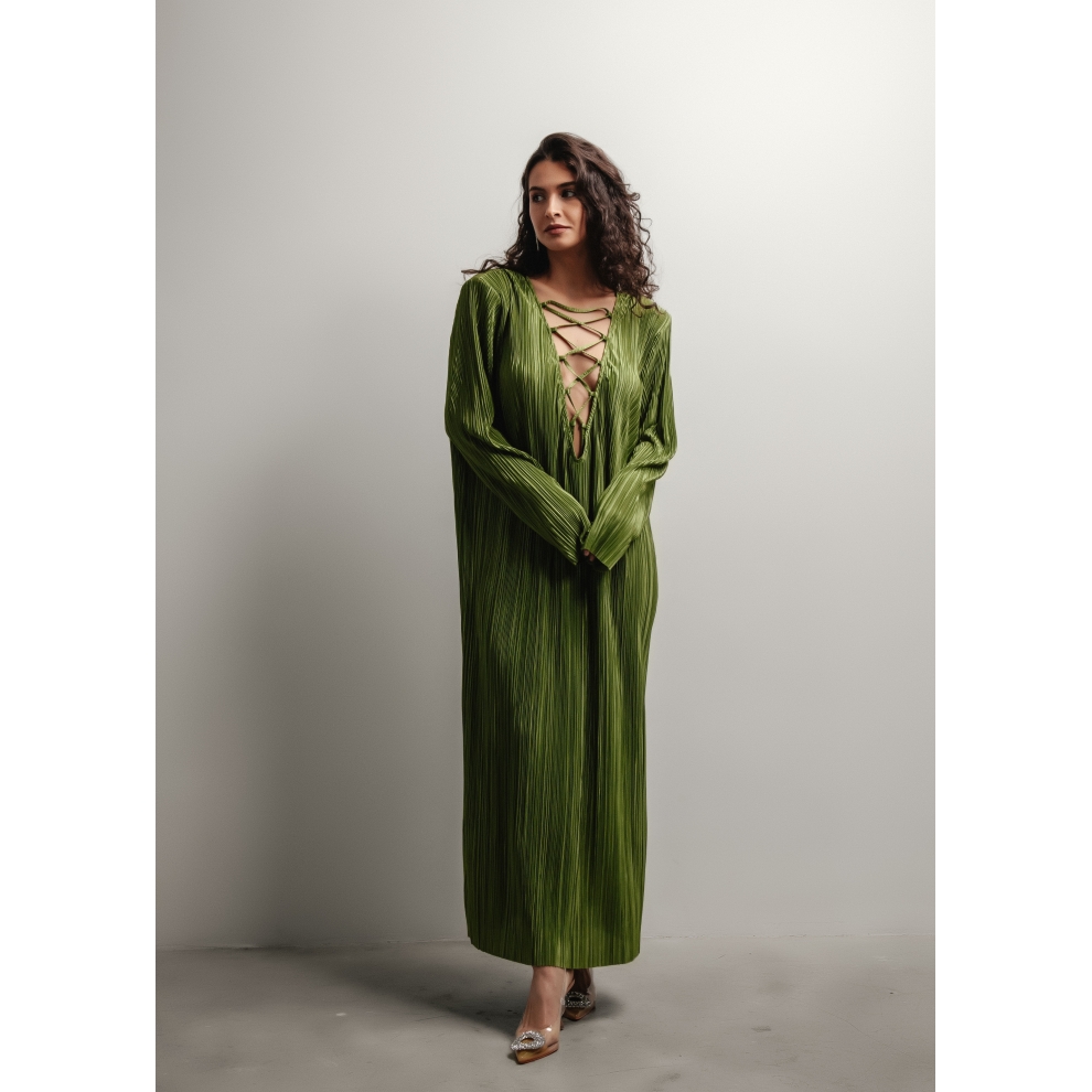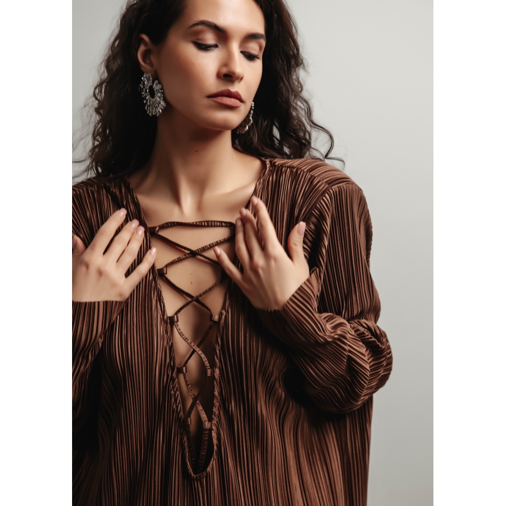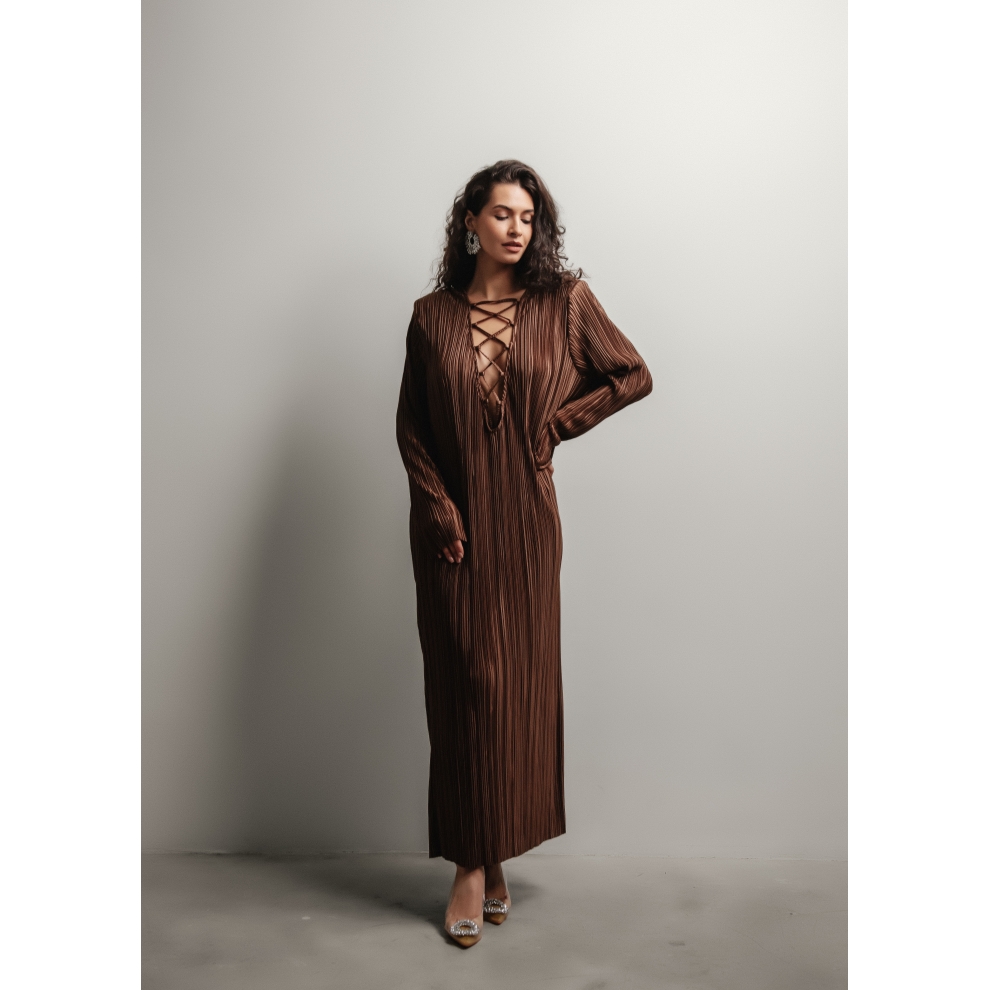 Платье со шнуровкой на груди выполнено из легкой гофрированной ткани. Модель свободного кроя, что позволяет посадить его на разные фигуры и размеры. Основным преимуществом является то, что платье можно носить шнуровкой вперед и назад, а также за счет длинных шнурков его можно приталить.