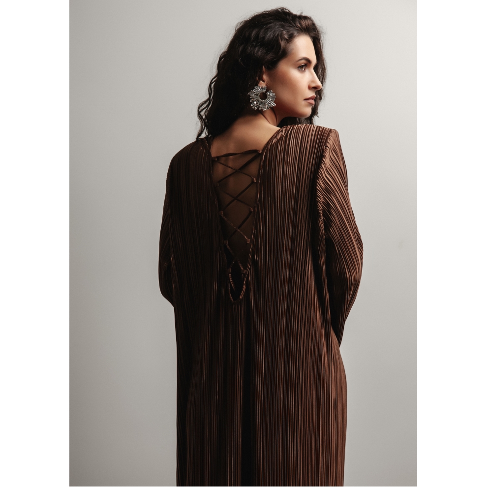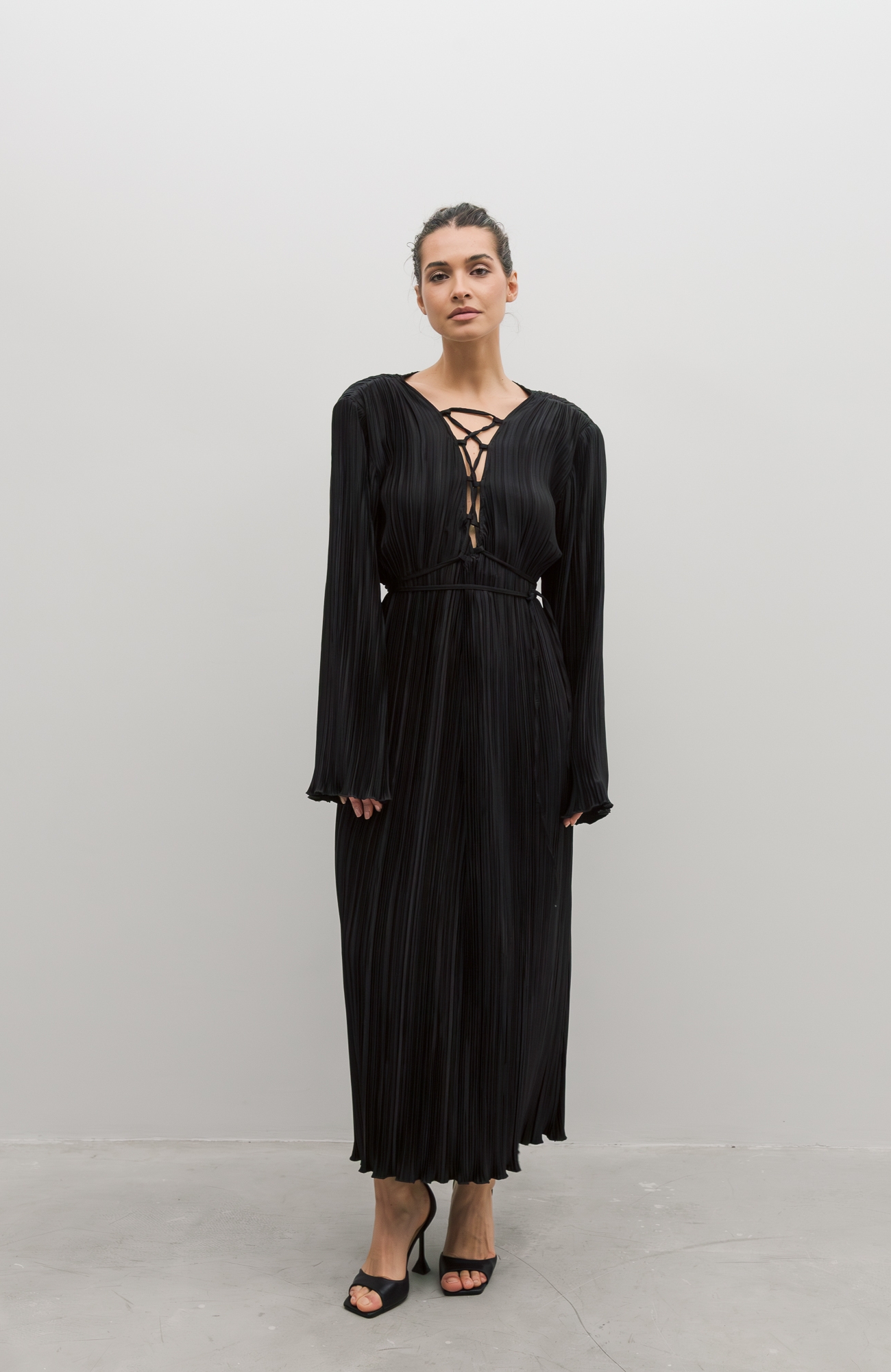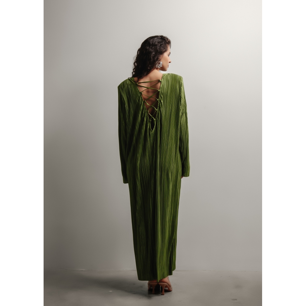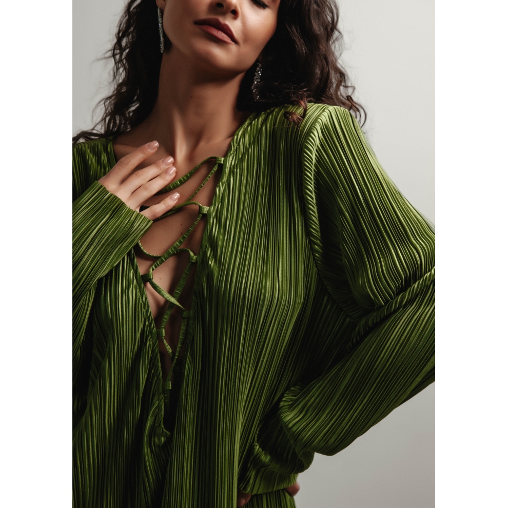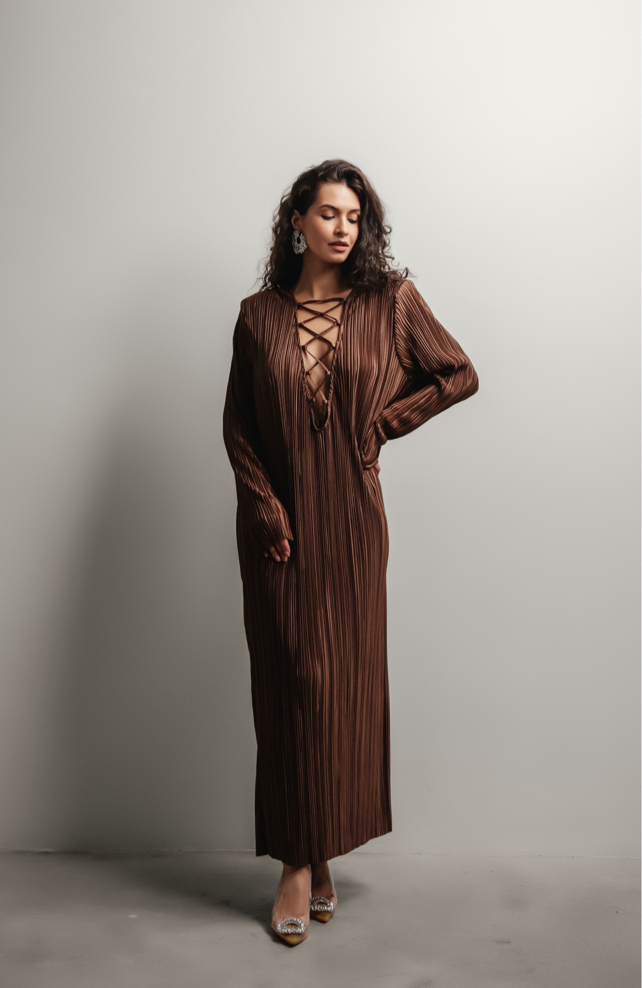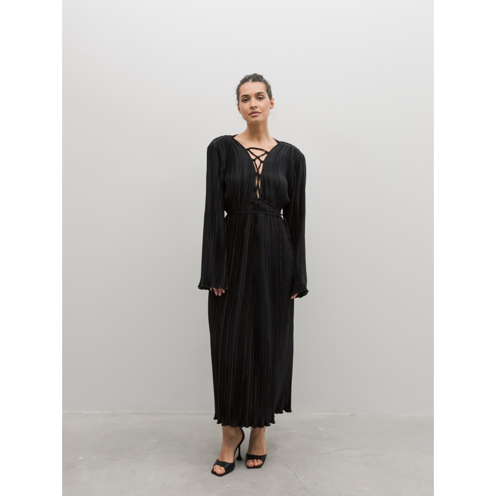 Платье со шнуровкой на груди выполнено из легкой гофрированной ткани. Модель свободного кроя, что позволяет посадить его на разные фигуры и размеры. Основным преимуществом является то, что платье можно носить шнуровкой вперед и назад, а также за счет длинных шнурков его можно приталить.