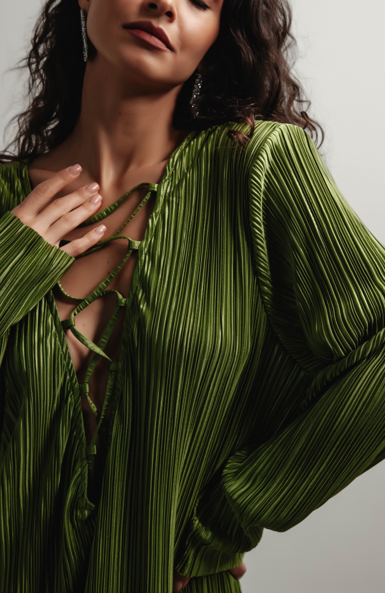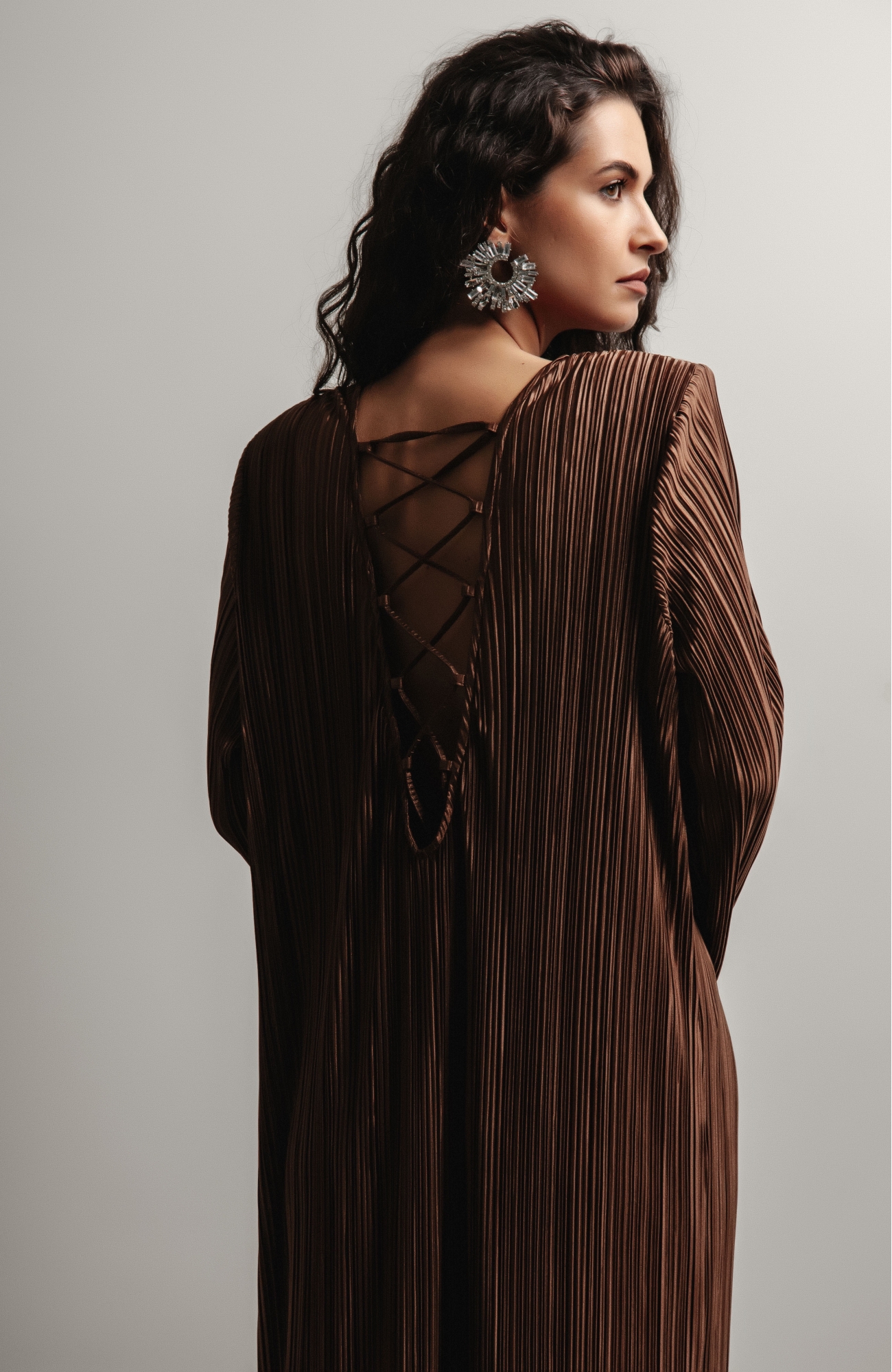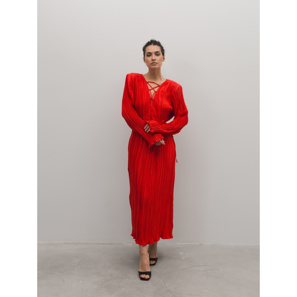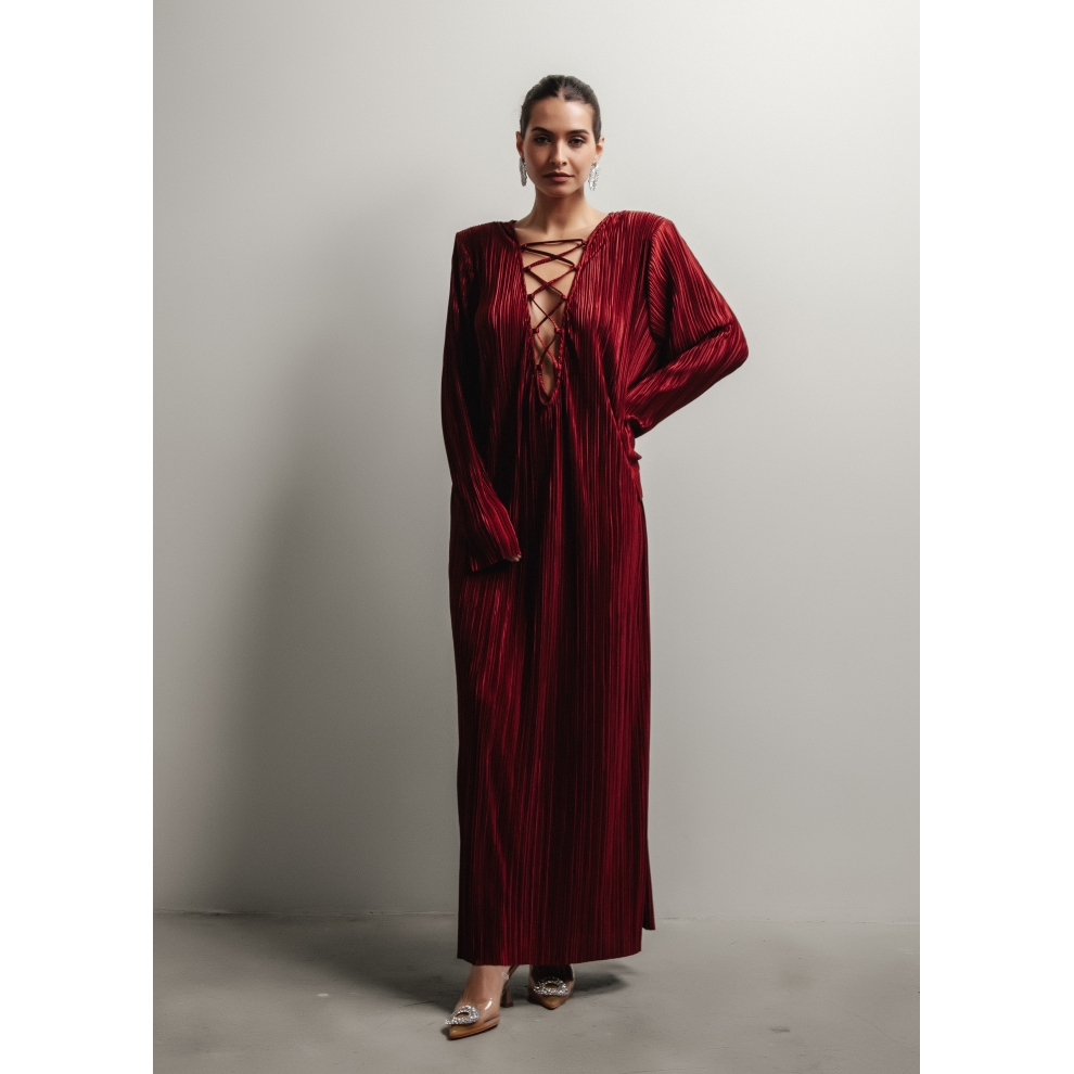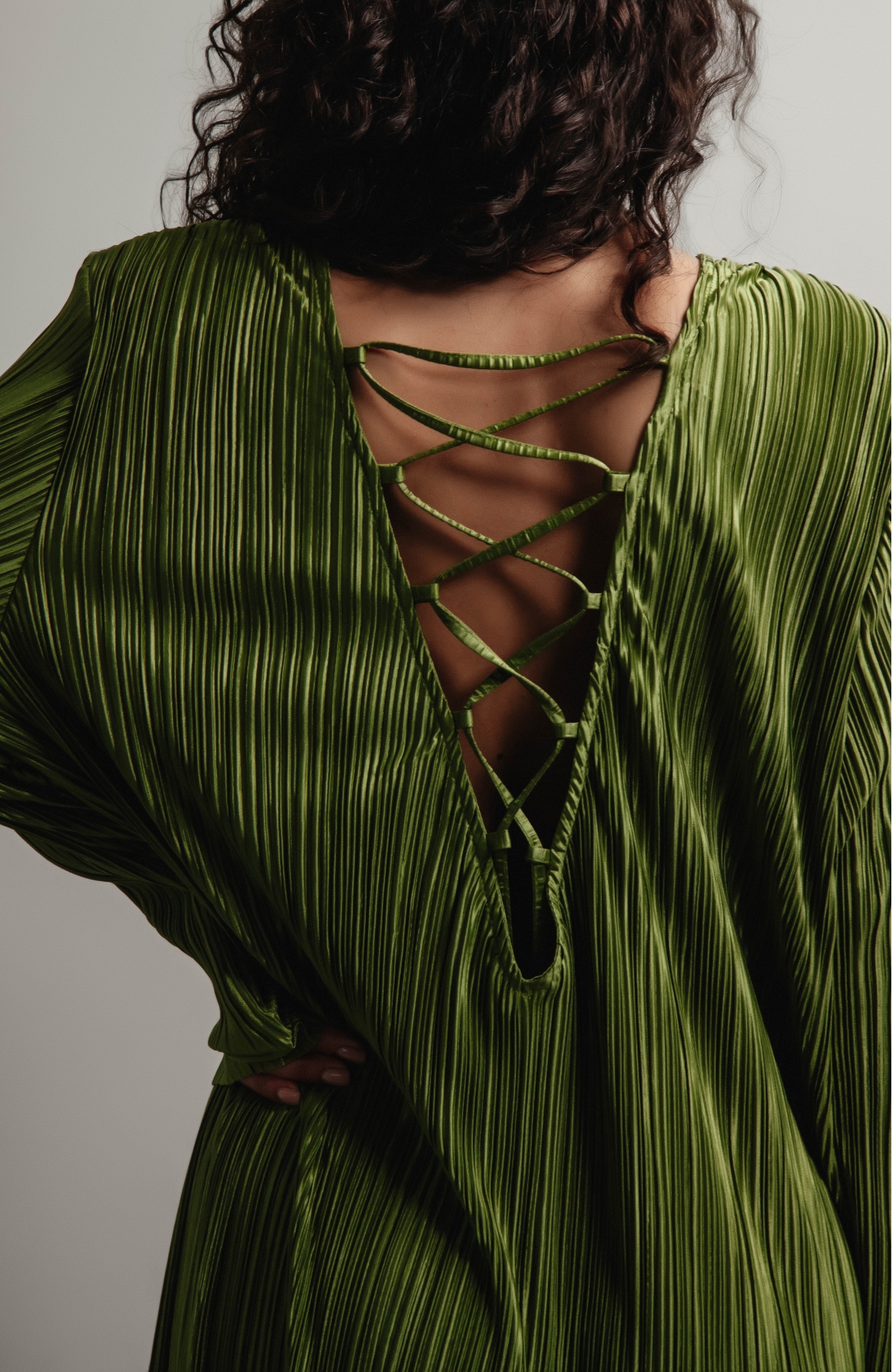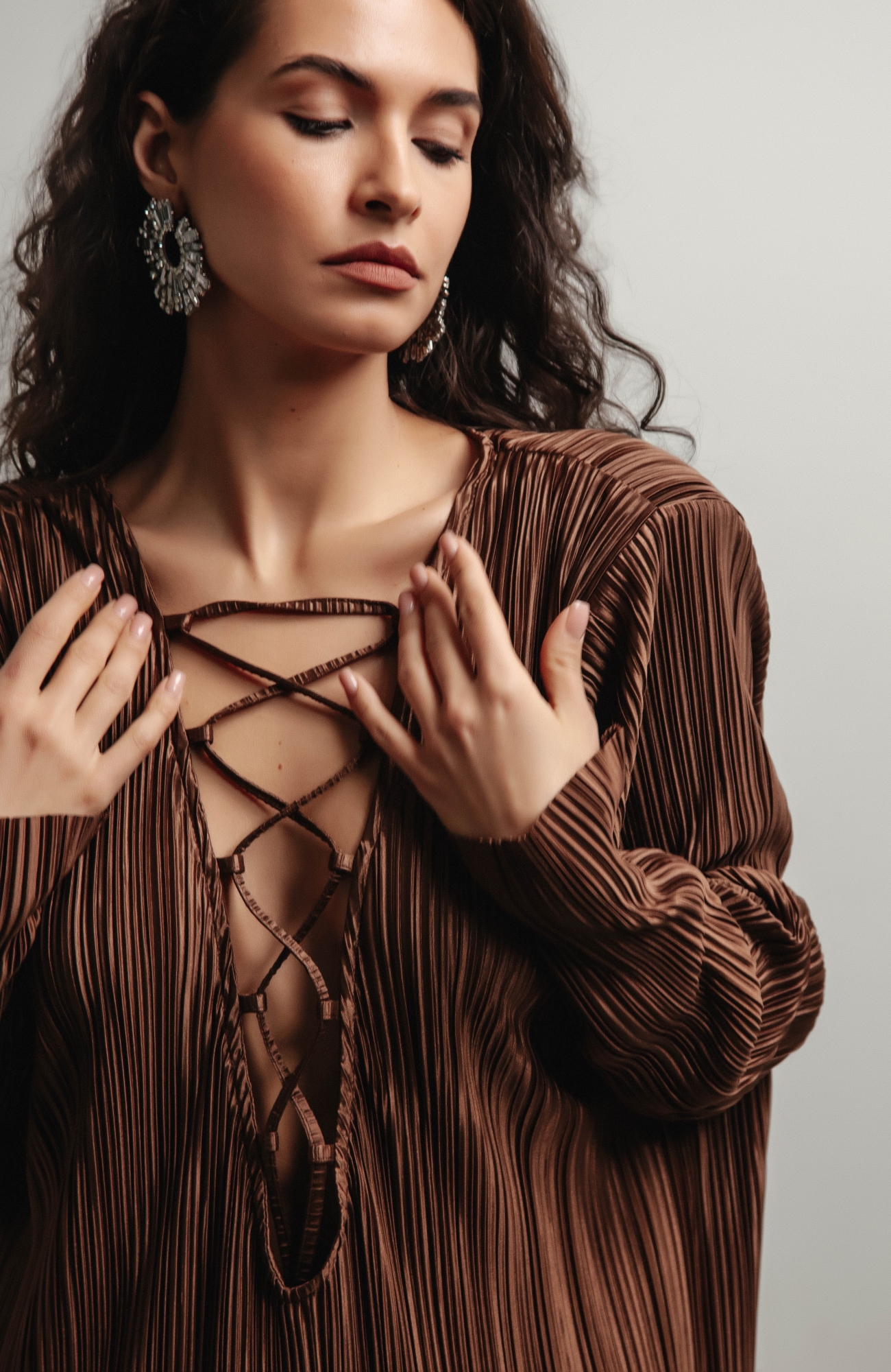 Платье со шнуровкой на груди выполнено из легкой гофрированной ткани. Модель свободного кроя, что позволяет посадить его на разные фигуры и размеры. Основным преимуществом является то, что платье можно носить шнуровкой вперед и назад, а также за счет длинных шнурков его можно приталить.