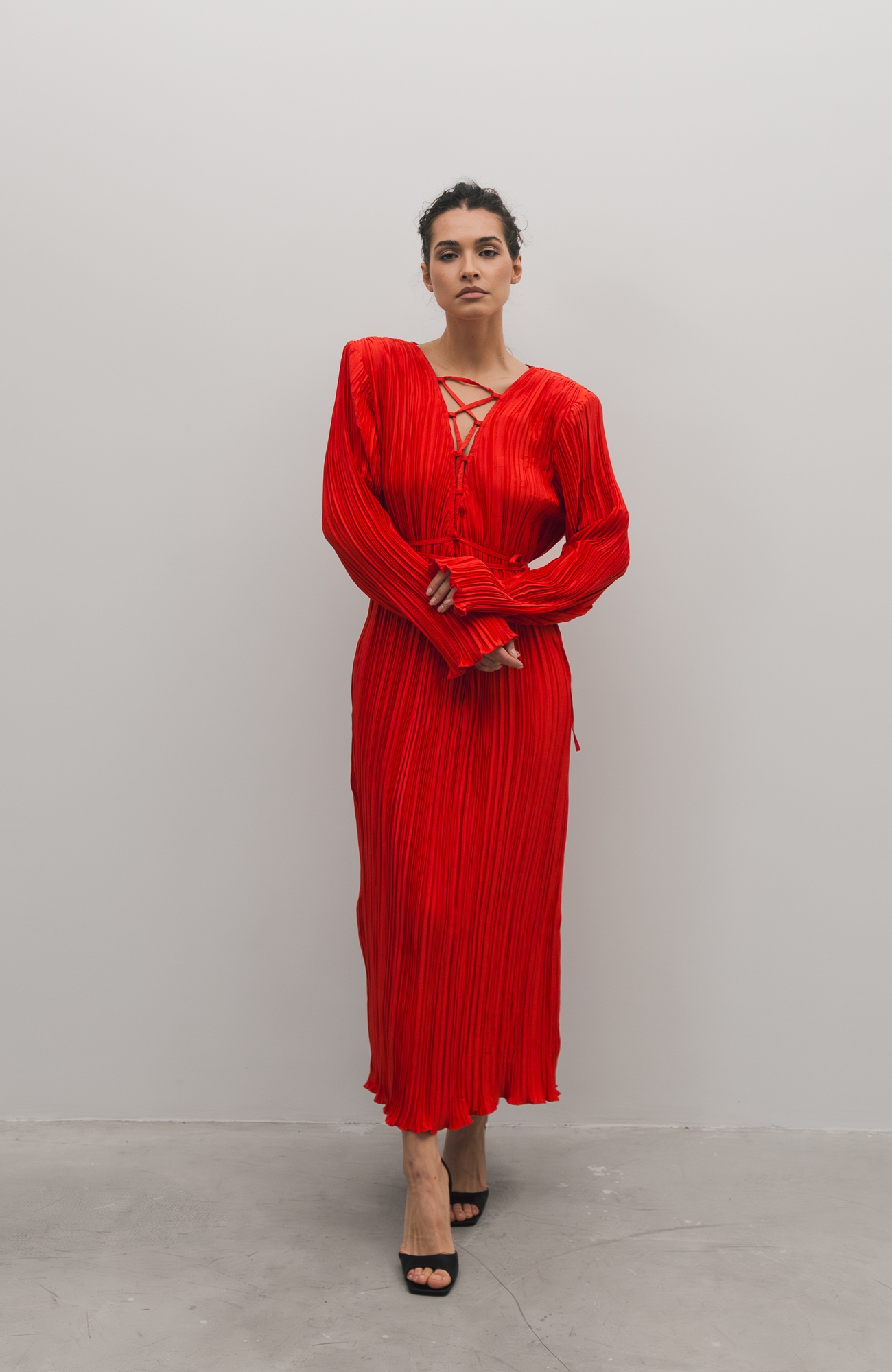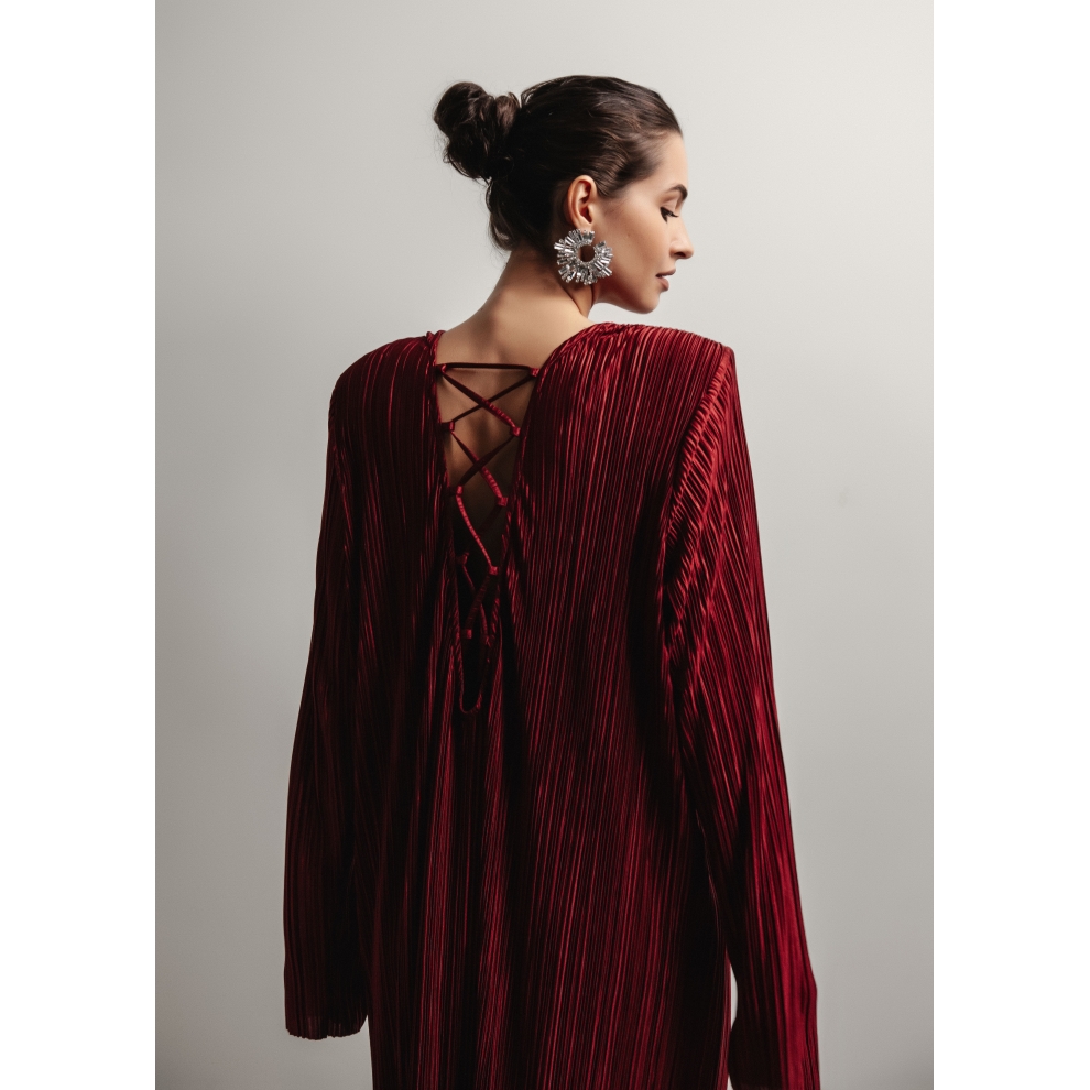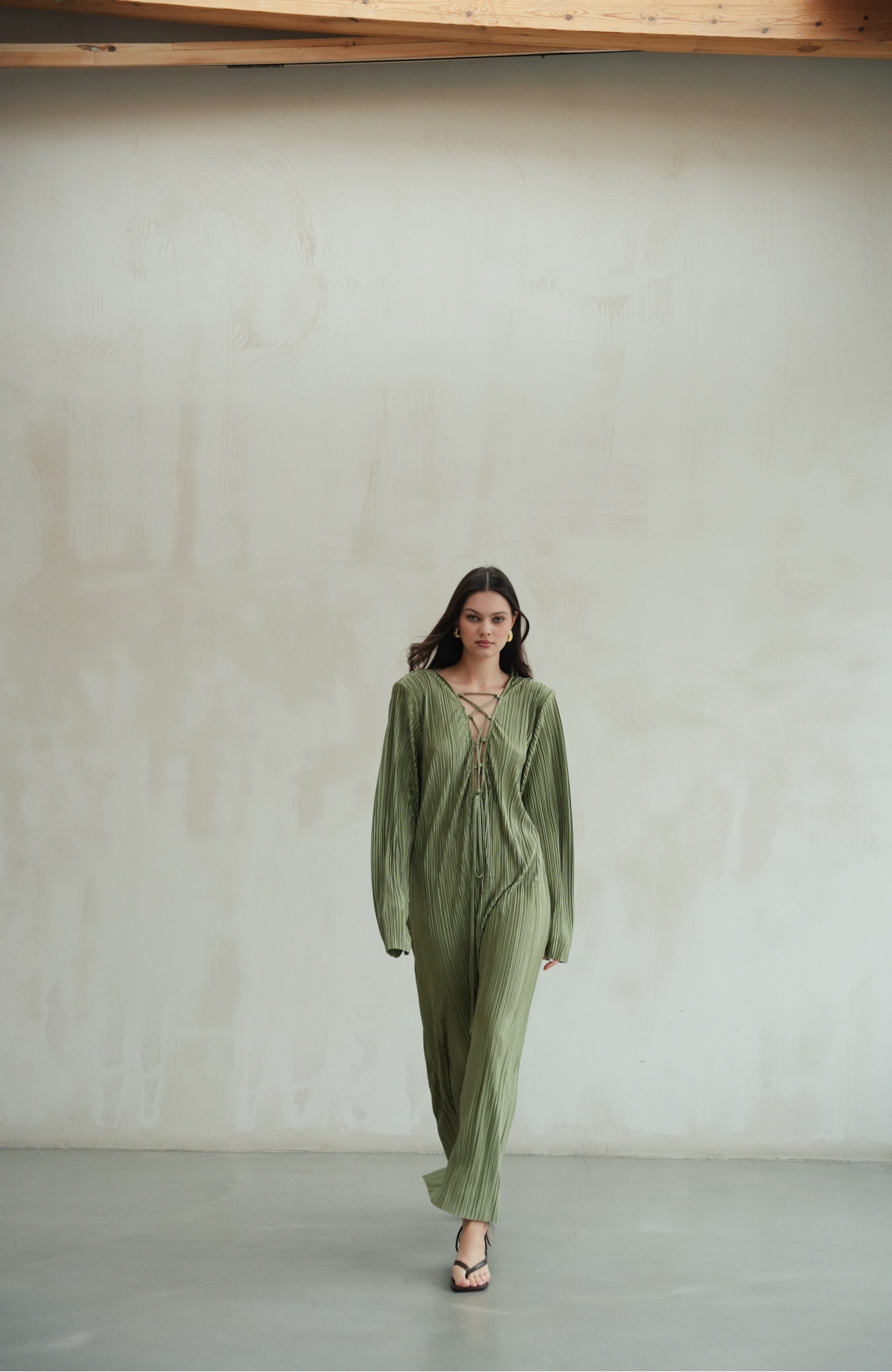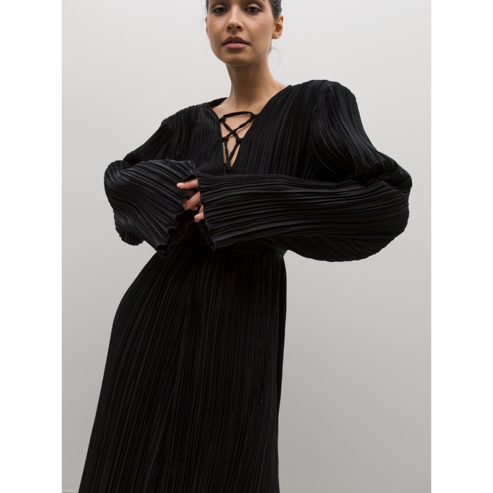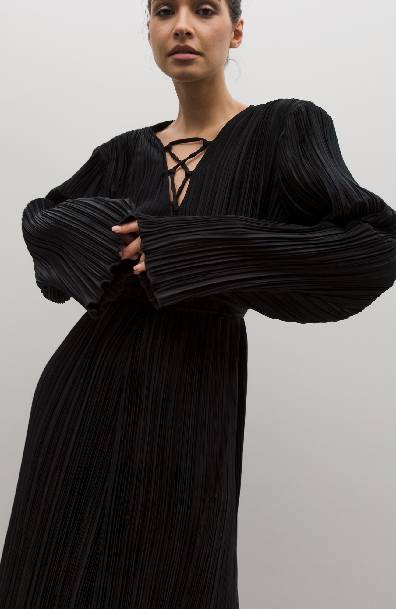 Платье со шнуровкой на груди выполнено из легкой гофрированной ткани. Модель свободного кроя, что позволяет посадить его на разные фигуры и размеры. Основным преимуществом является то, что платье можно носить шнуровкой вперед и назад, а также за счет длинных шнурков его можно приталить.