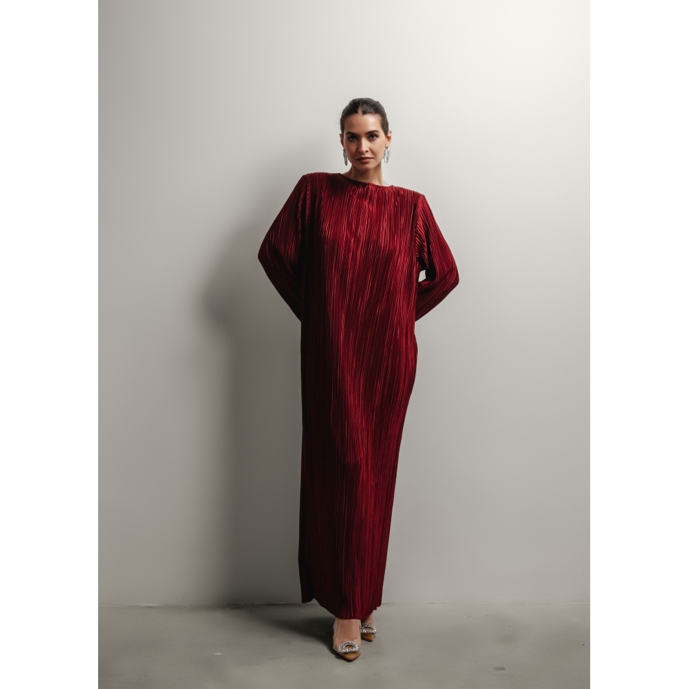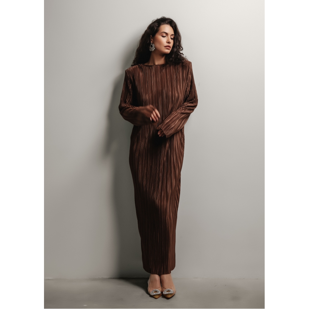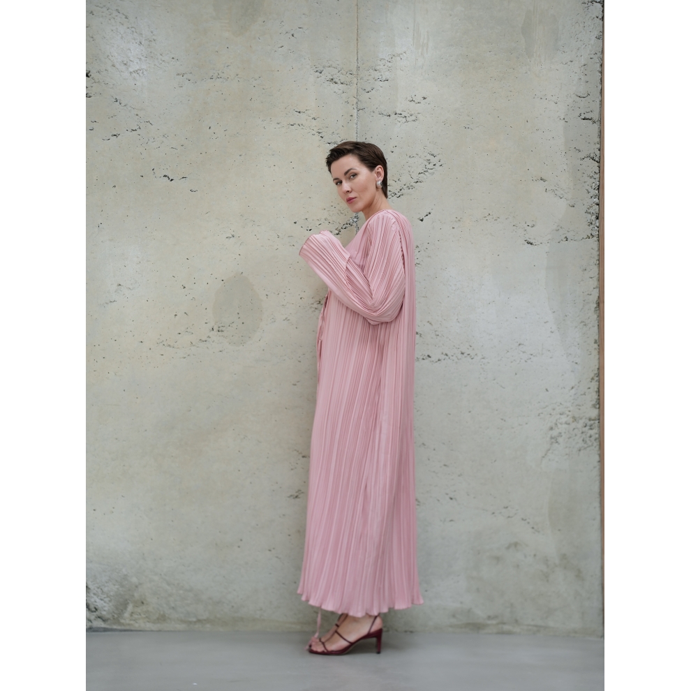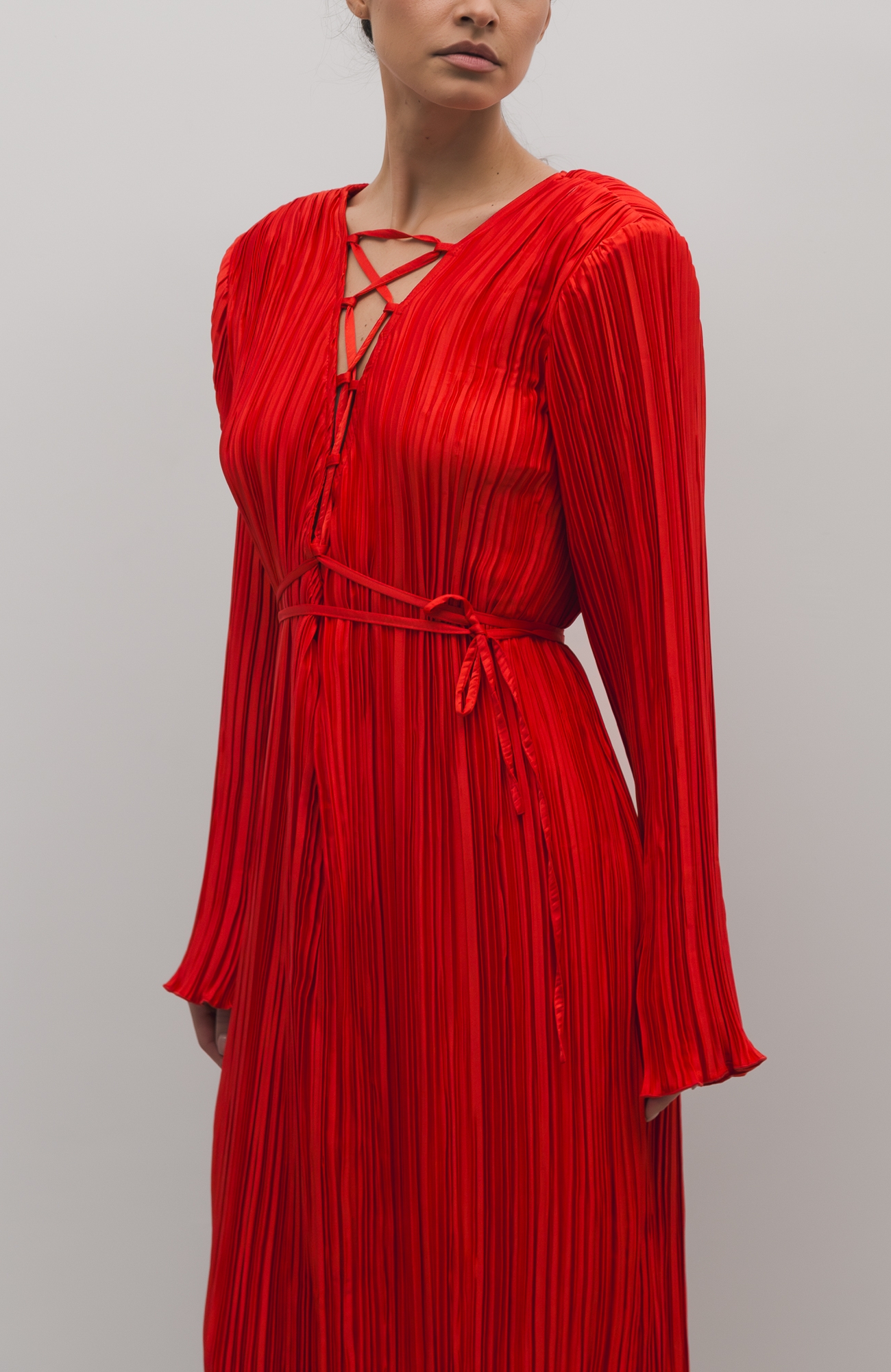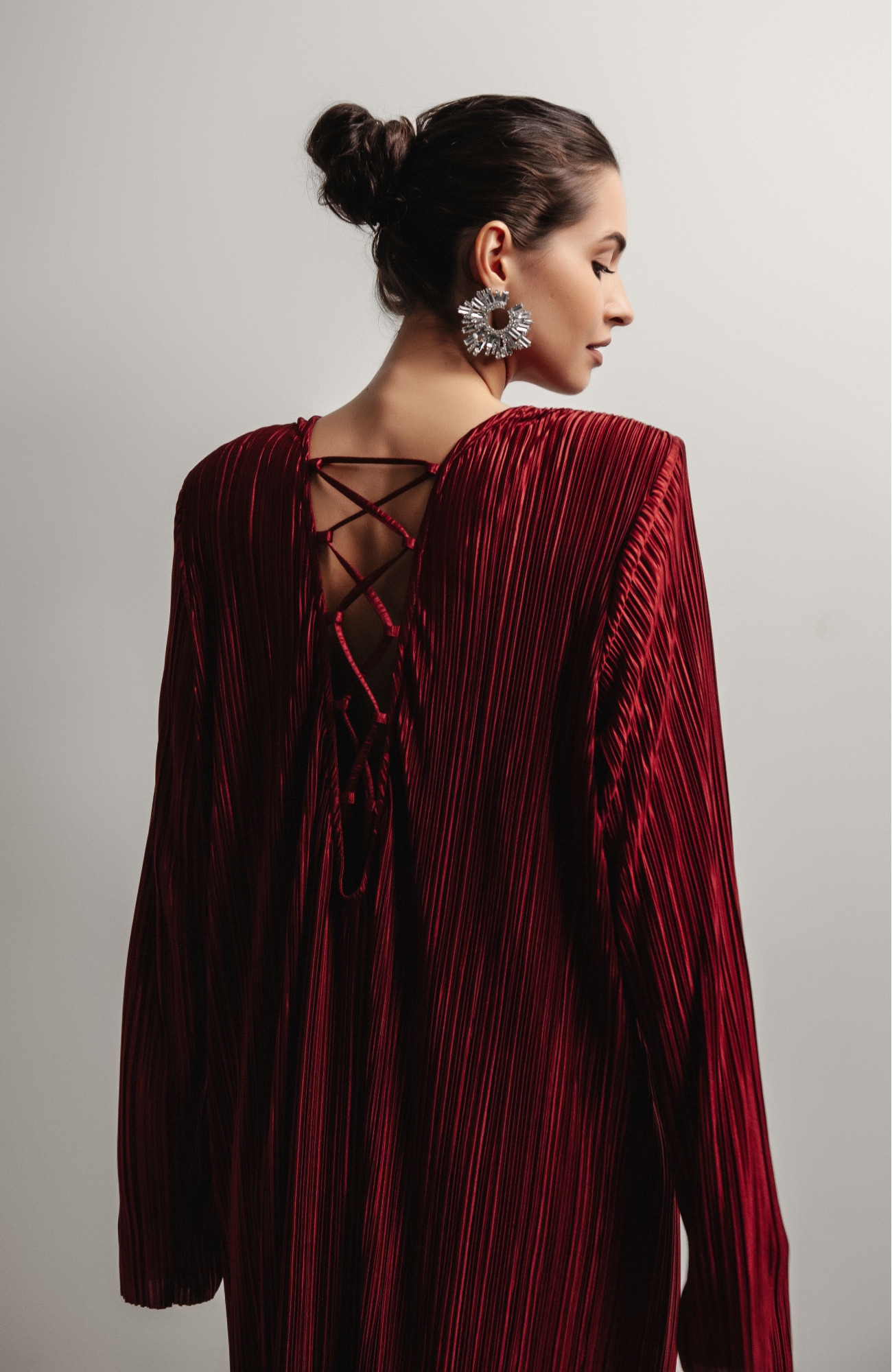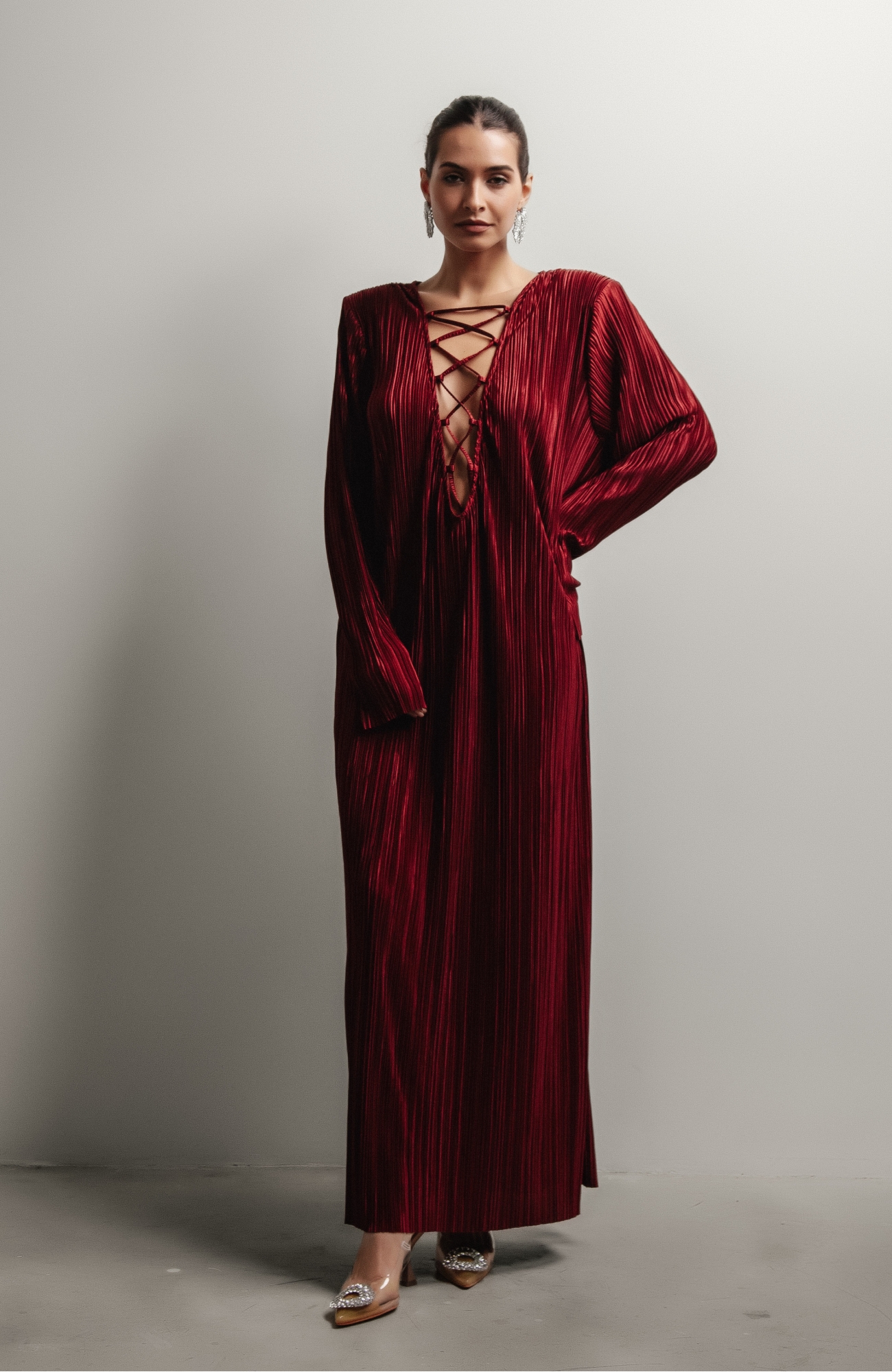 Платье со шнуровкой на груди выполнено из легкой гофрированной ткани. Модель свободного кроя, что позволяет посадить его на разные фигуры и размеры. Основным преимуществом является то, что платье можно носить шнуровкой вперед и назад, а также за счет длинных шнурков его можно приталить.