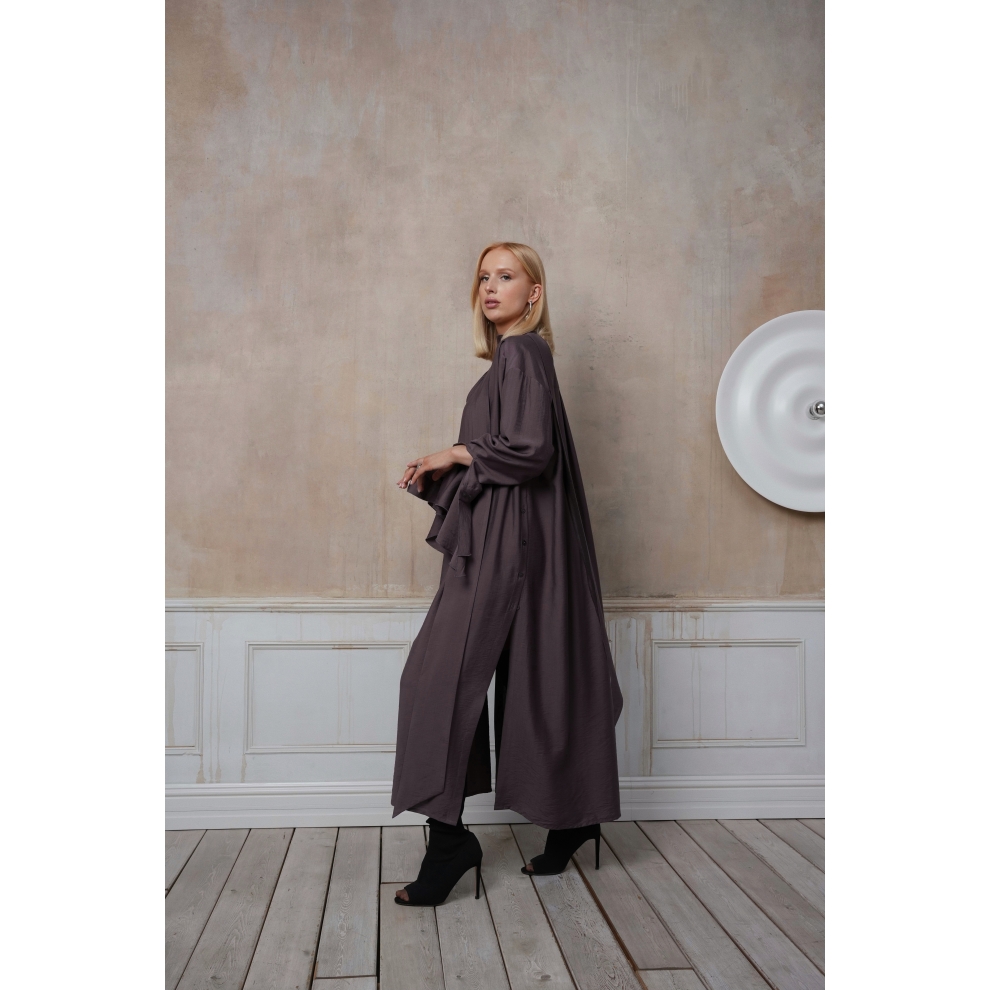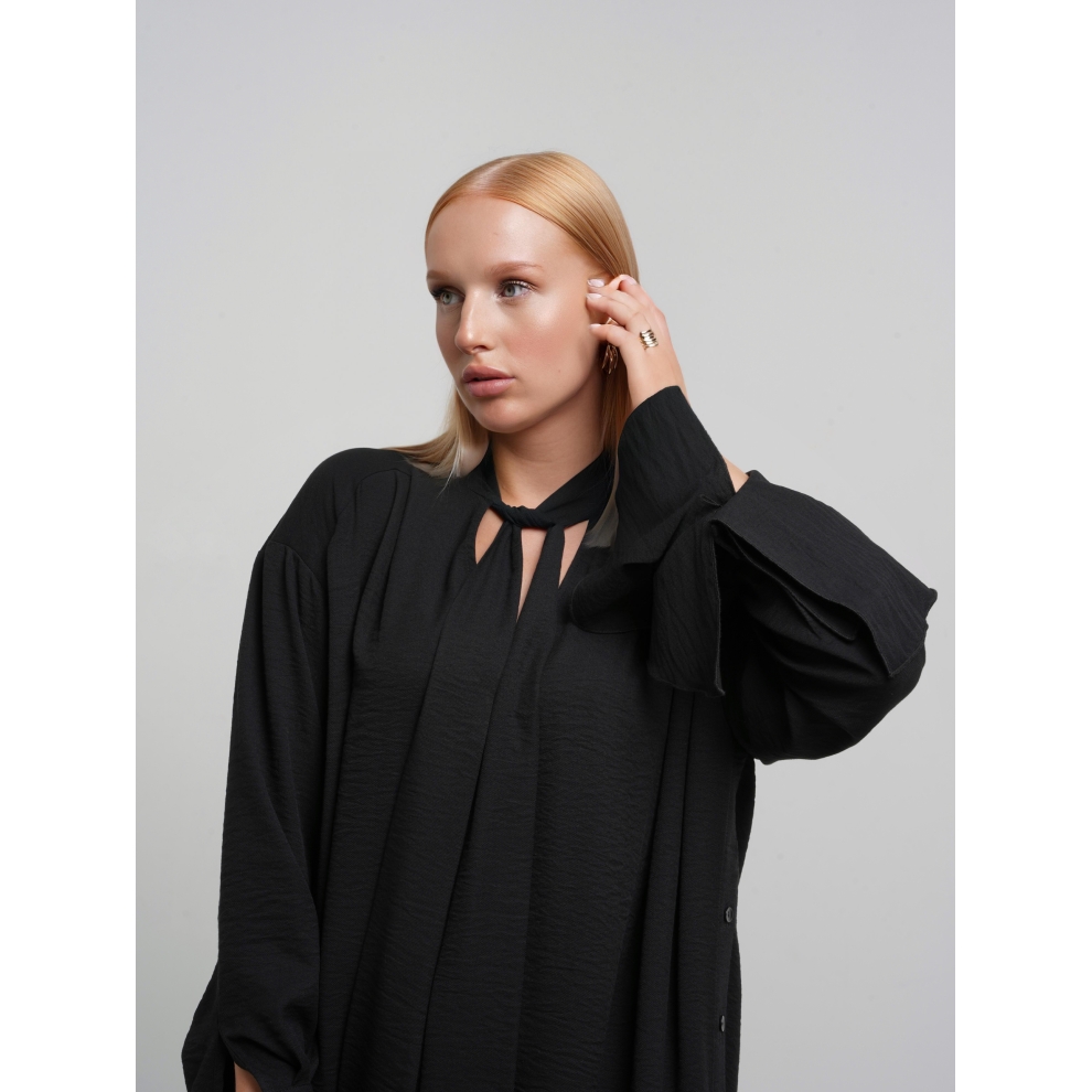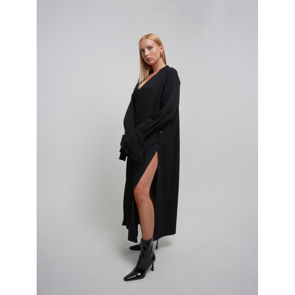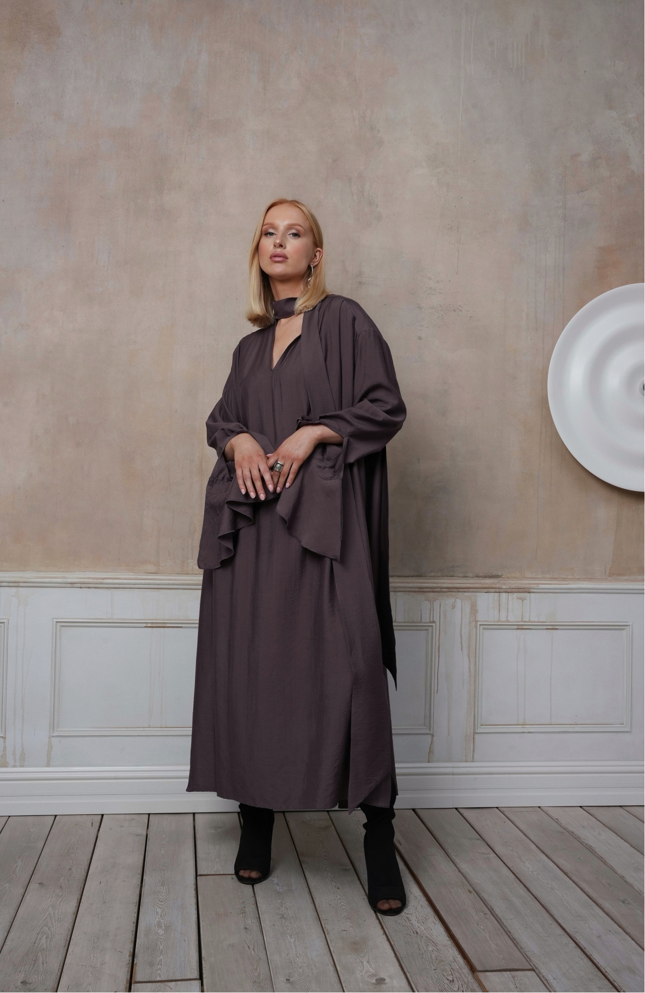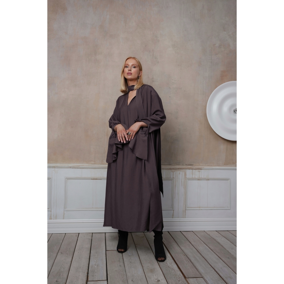 Платье свободного кроя в длине макси из "мятой" вискозы. Отличительными деталями являются длинные ленты, которые можно завязывать в бант или галстук. Также по бокам у платья расположена планка с расстегивающимися пуговицами, с помощью которых можно регулировать высоту разреза. В комплекте есть шнурок, которым можно приталить платье.