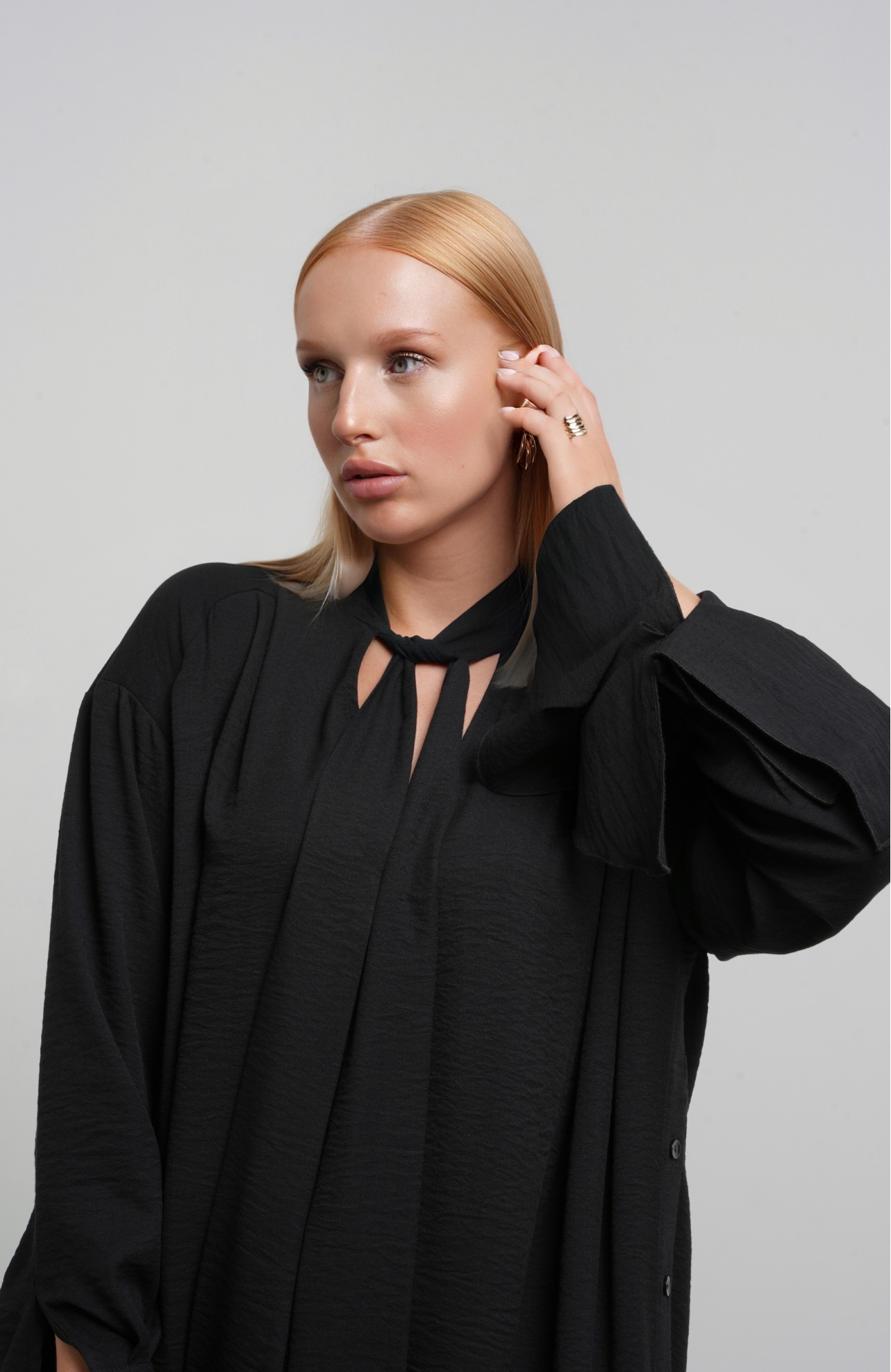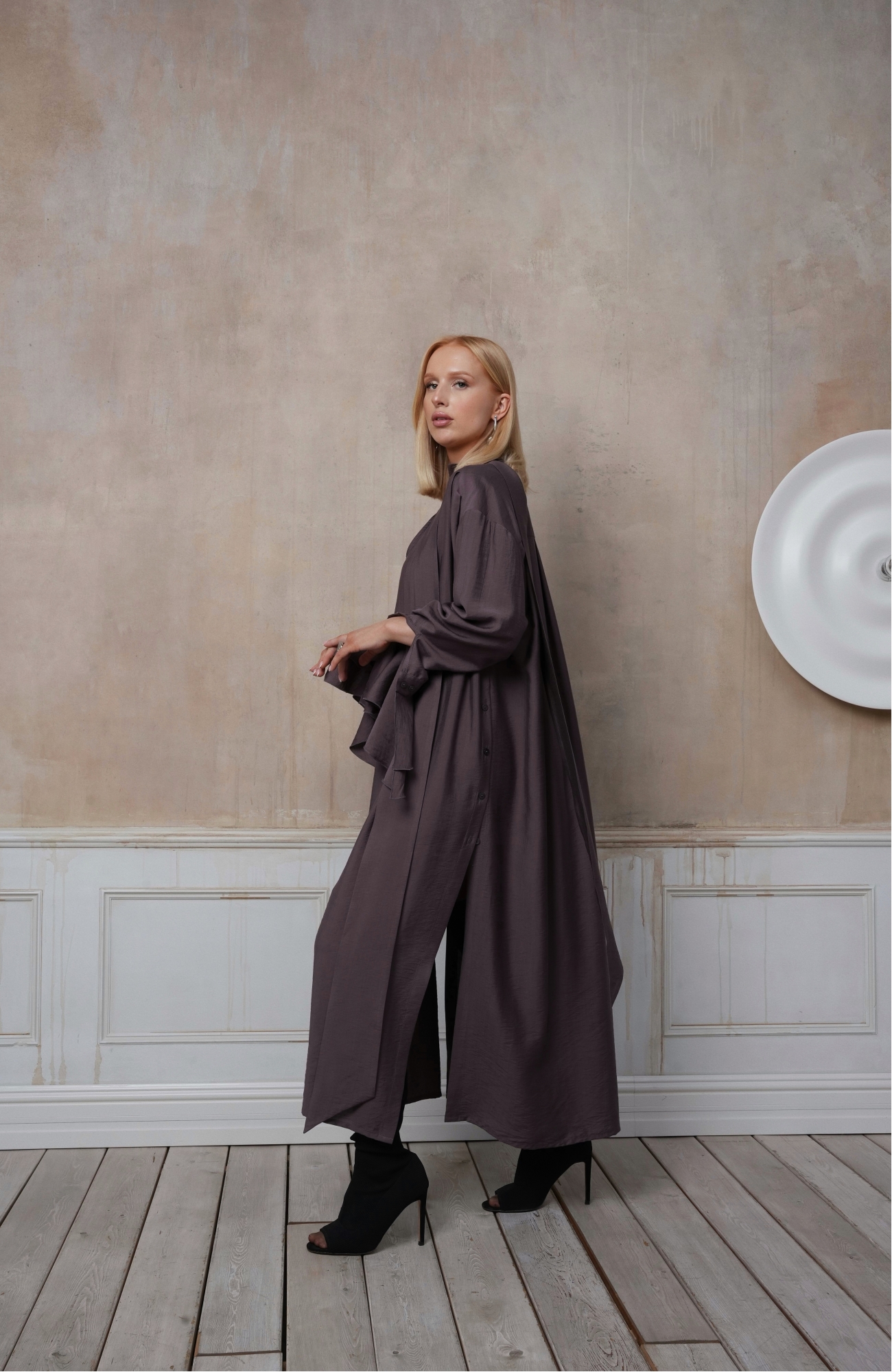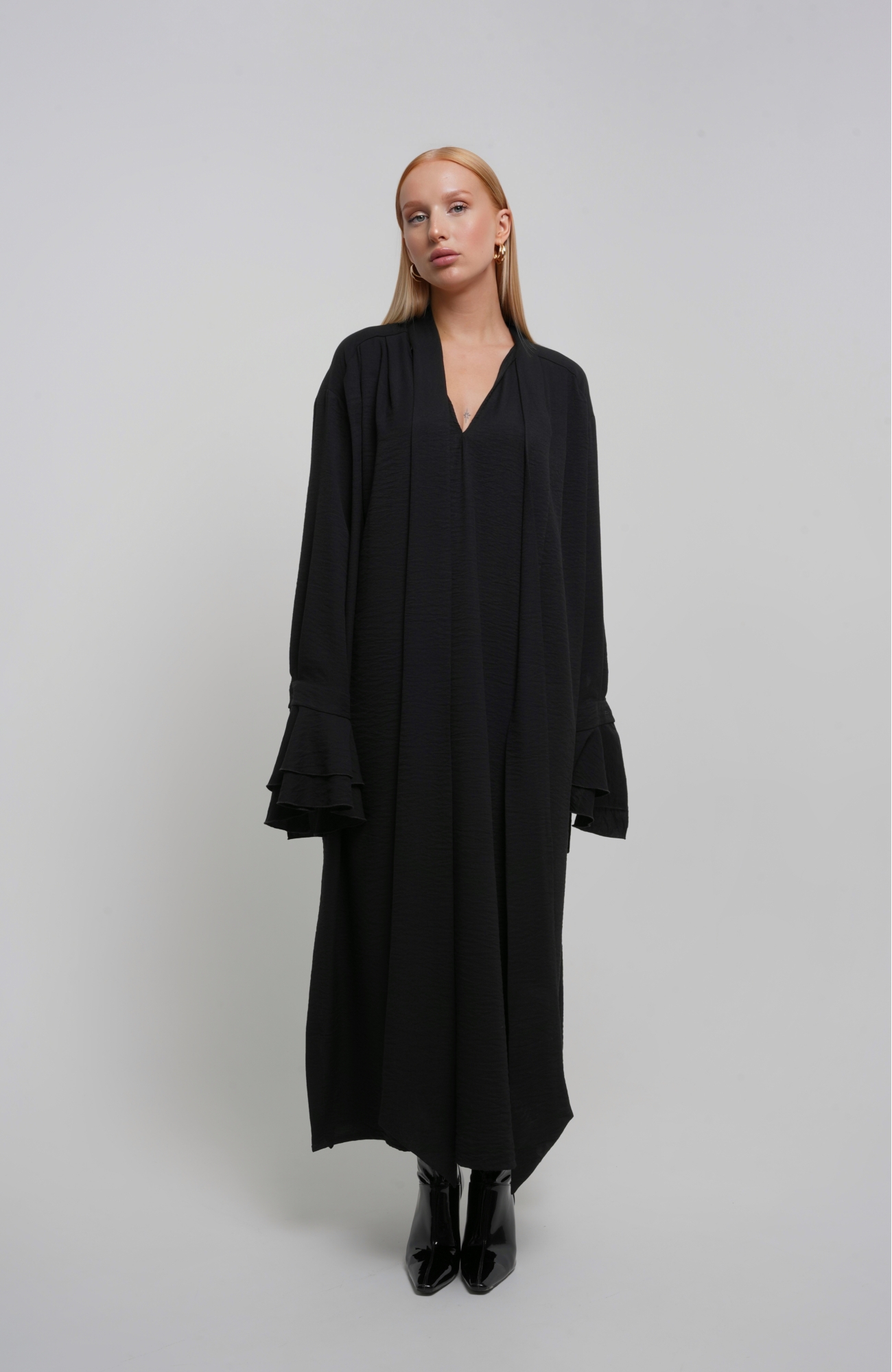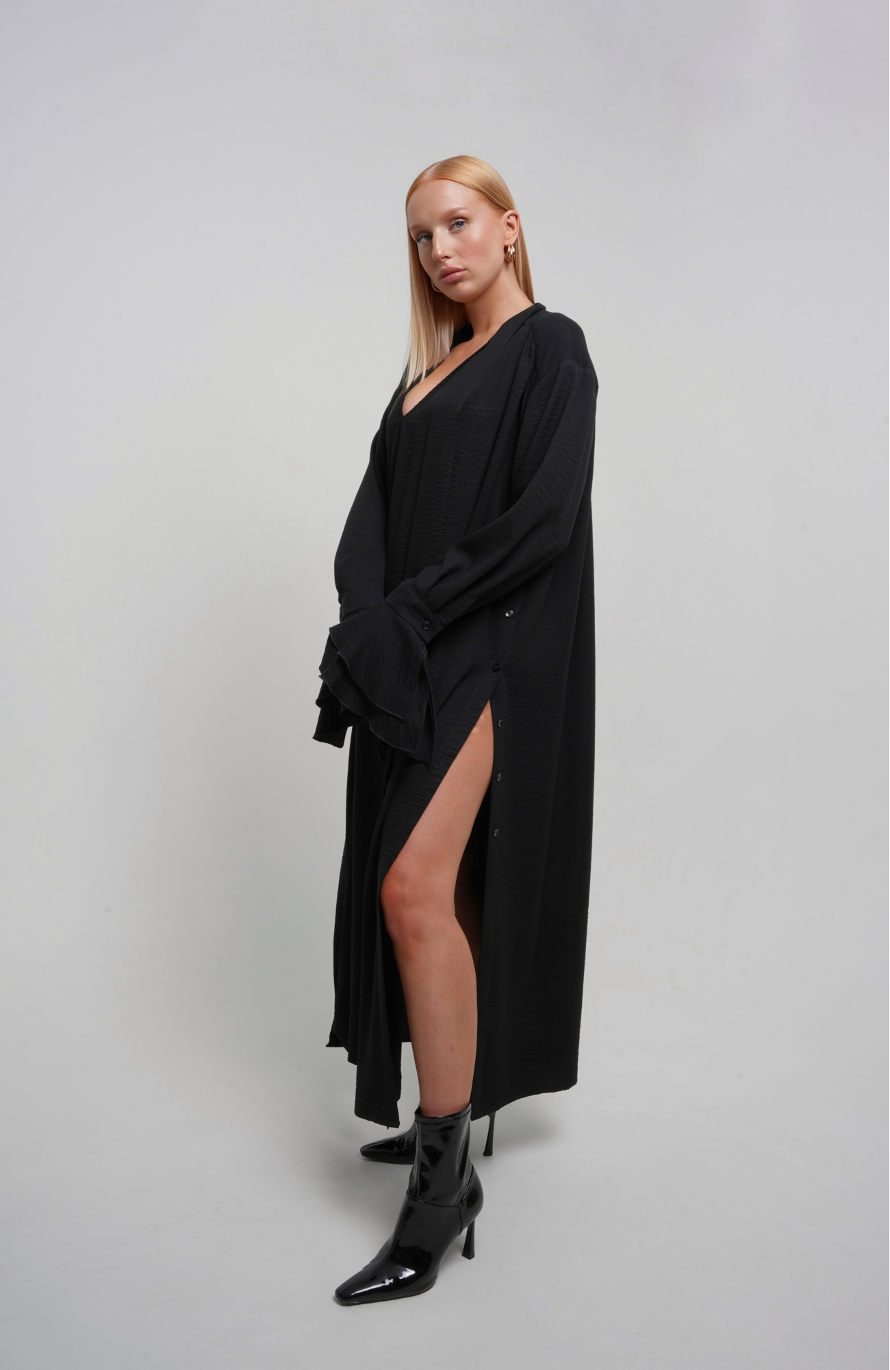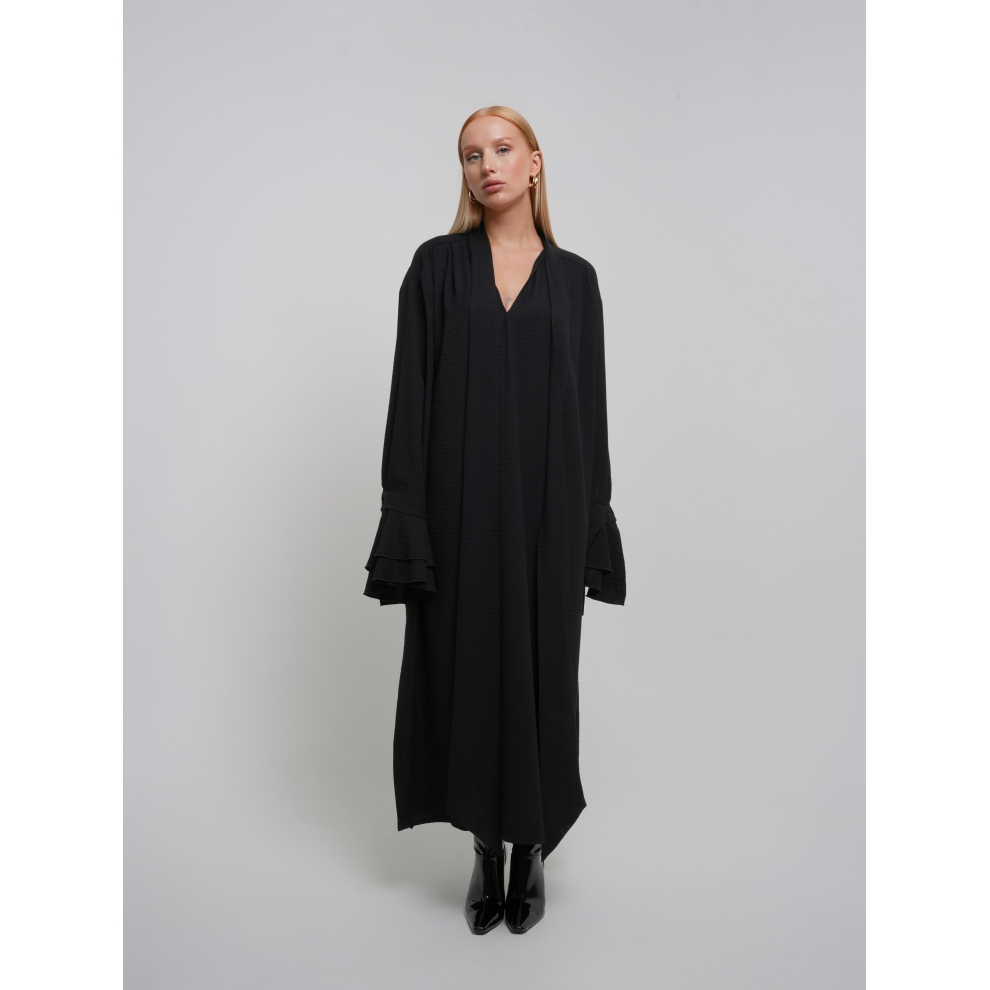 Платье свободного кроя в длине макси из "мятой" вискозы. Отличительными деталями являются длинные ленты, которые можно завязывать в бант или галстук. Также по бокам у платья расположена планка с расстегивающимися пуговицами, с помощью которых можно регулировать высоту разреза. В комплекте есть шнурок, которым можно приталить платье.