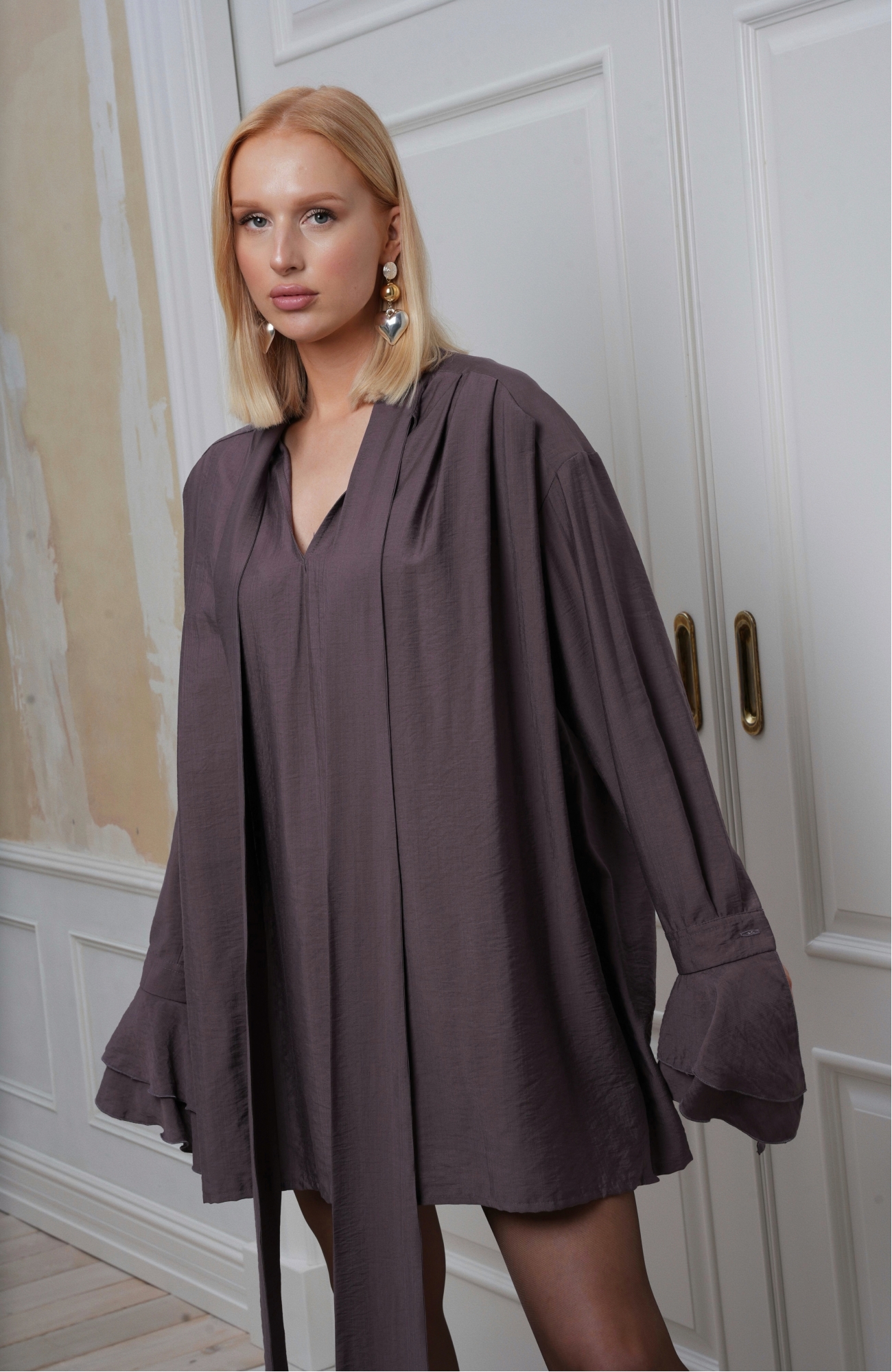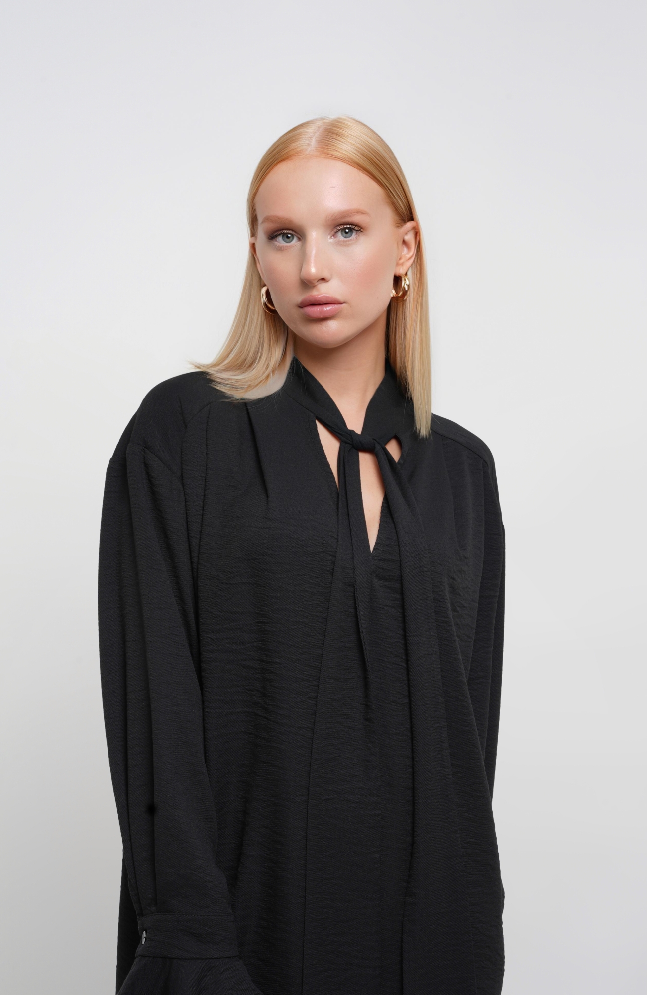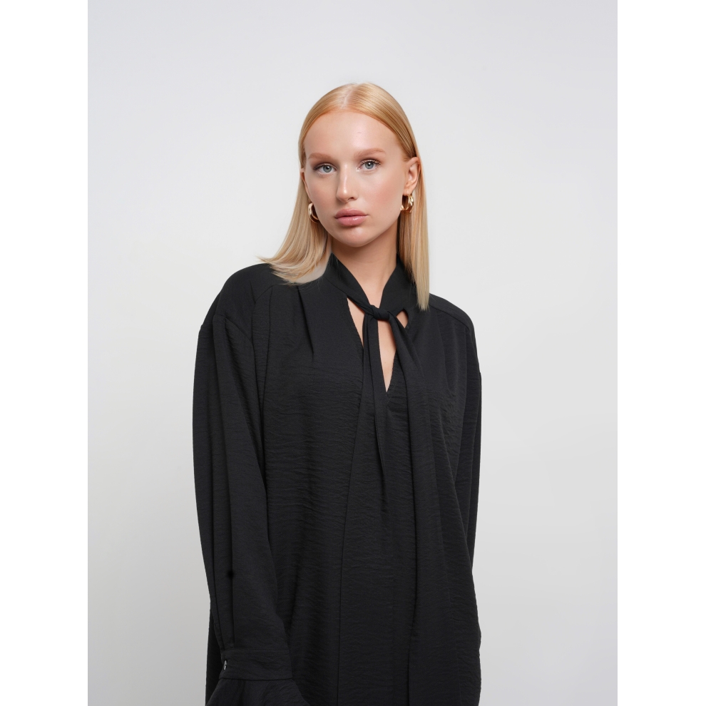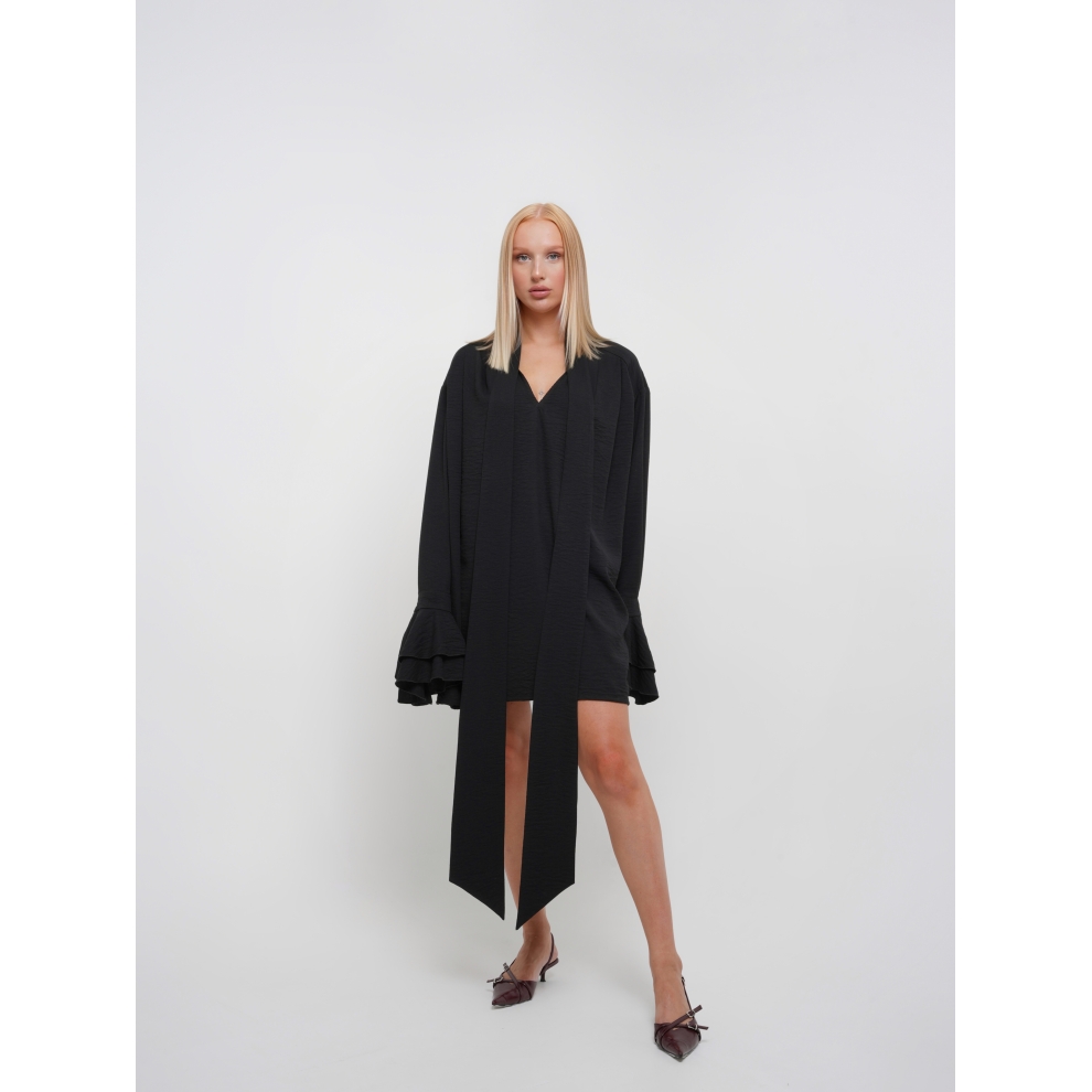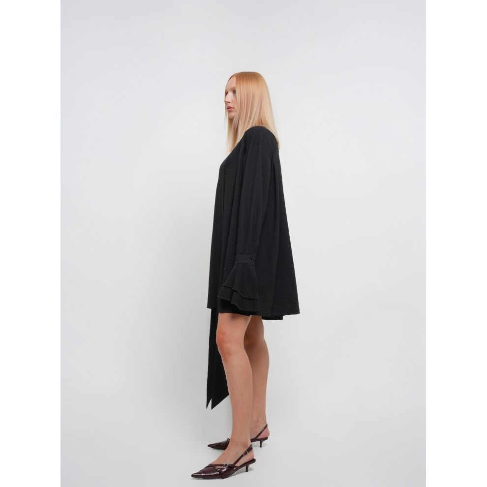 Платье свободного кроя в длине мини из "мятой" вискозы. Отличительными деталями являются длинные ленты, которые можно завязывать в бант или галстук. Также по бокам у платья расположена планка с расстегивающимися пуговицами, с помощью которых можно регулировать высоту разреза. В комплекте есть шнурок, которым можно приталить платье.