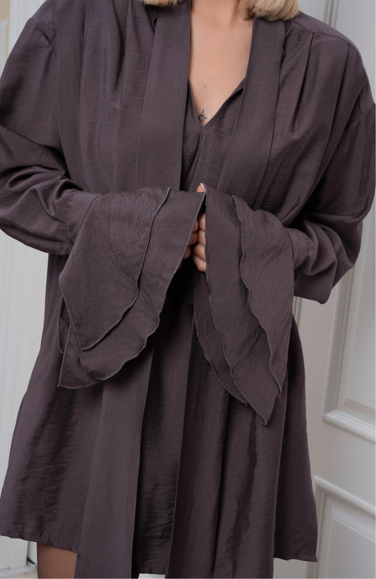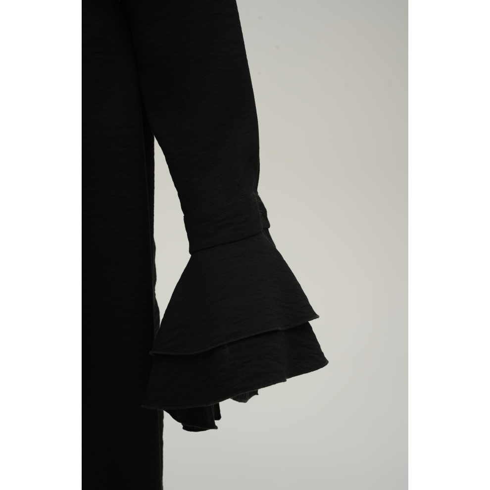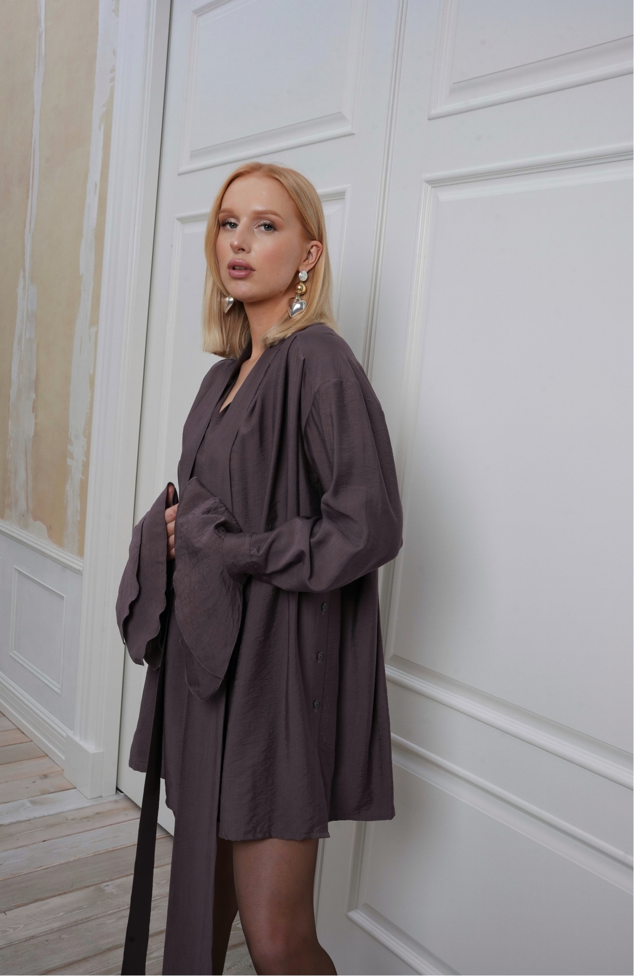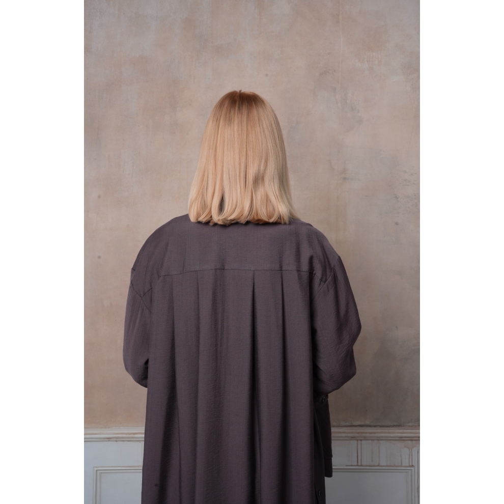 Платье свободного кроя в длине мини из "мятой" вискозы. Отличительными деталями являются длинные ленты, которые можно завязывать в бант или галстук. Также по бокам у платья расположена планка с расстегивающимися пуговицами, с помощью которых можно регулировать высоту разреза. В комплекте есть шнурок, которым можно приталить платье.