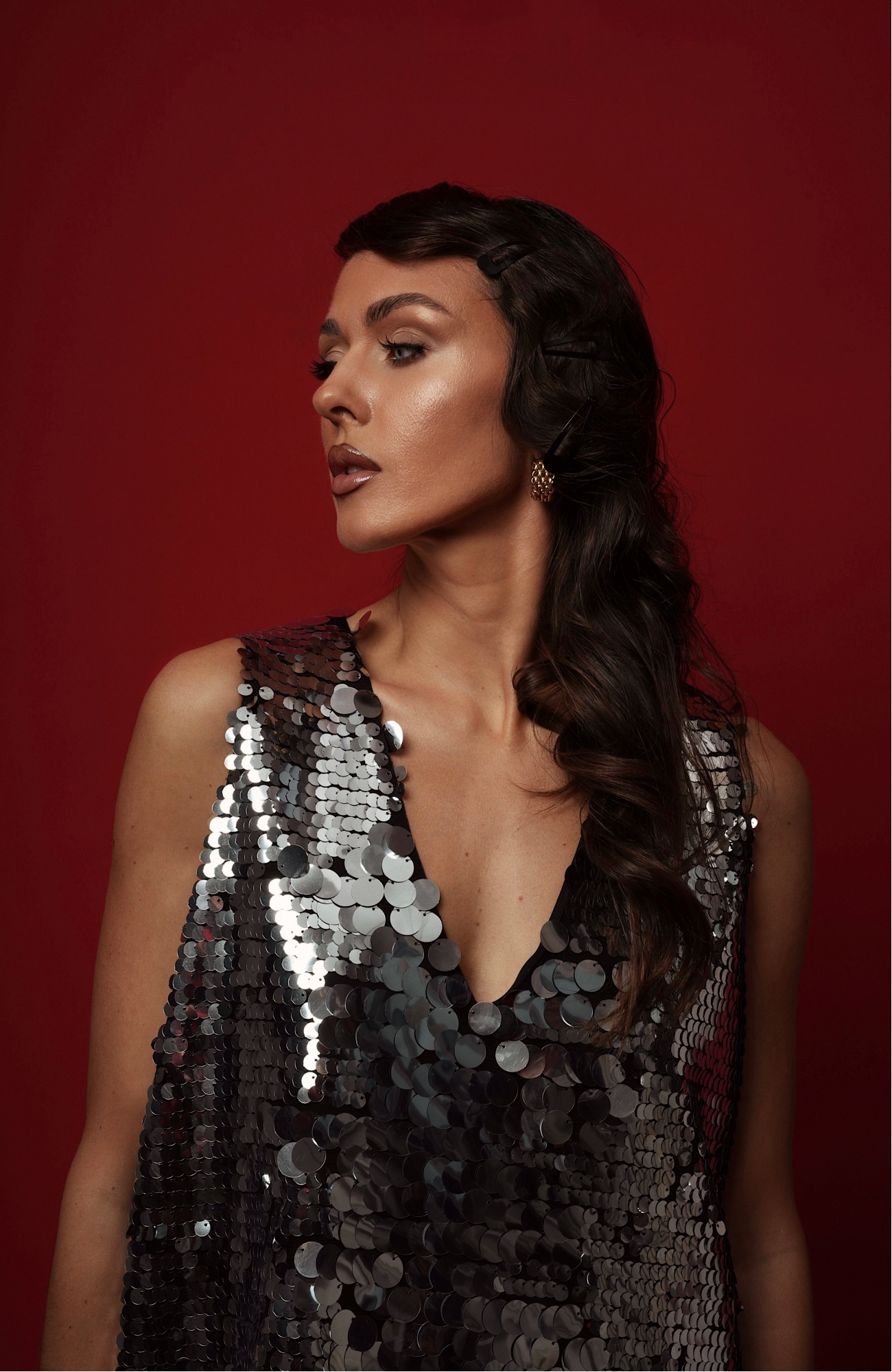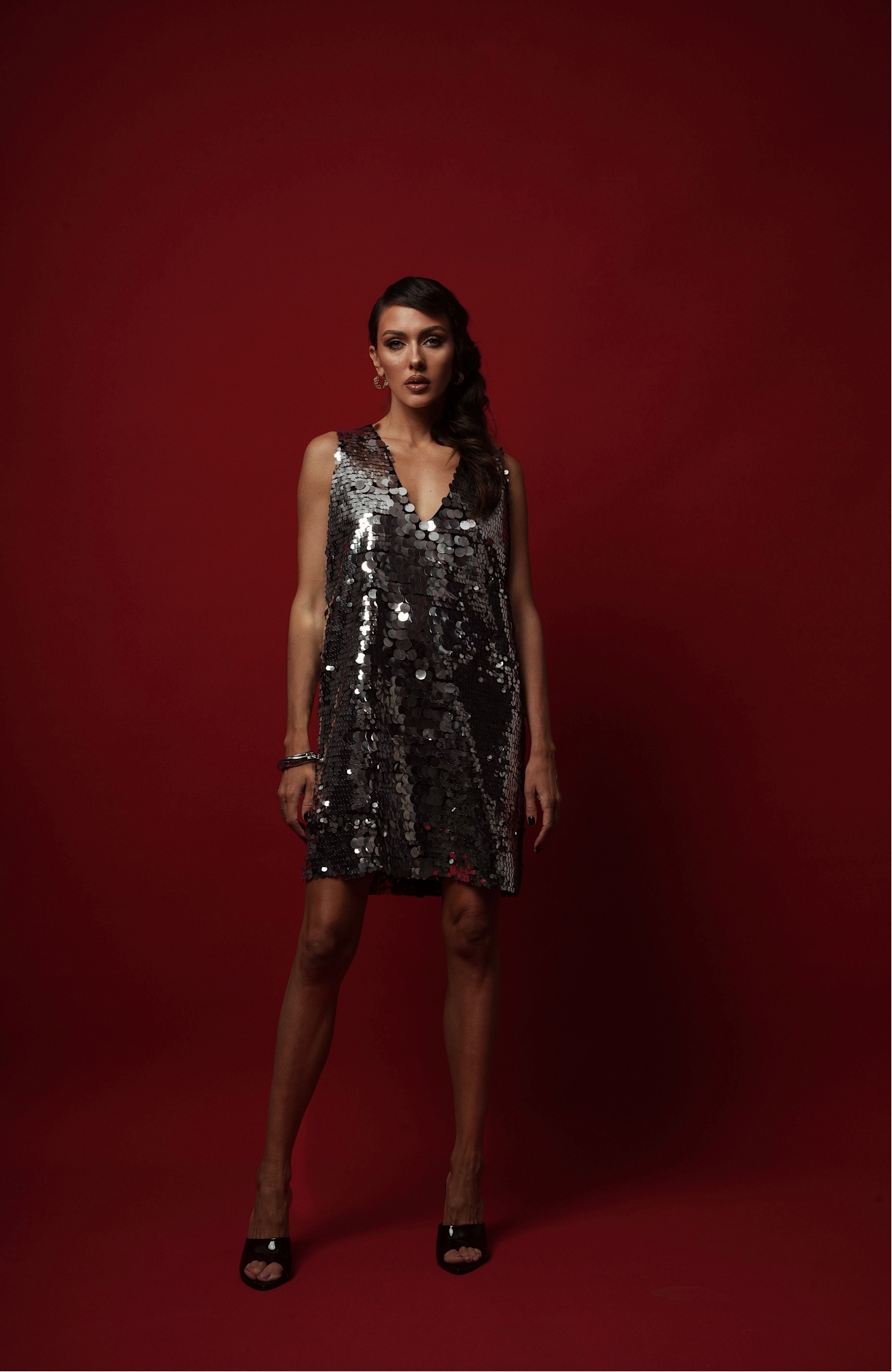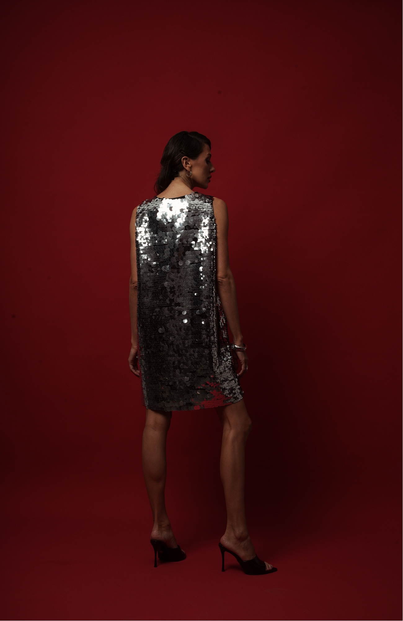 Платье мини без рукавов выполнено из круглых серебряных пайеток. V-образный вырез, который можно надевать как вперед, так и назад.
