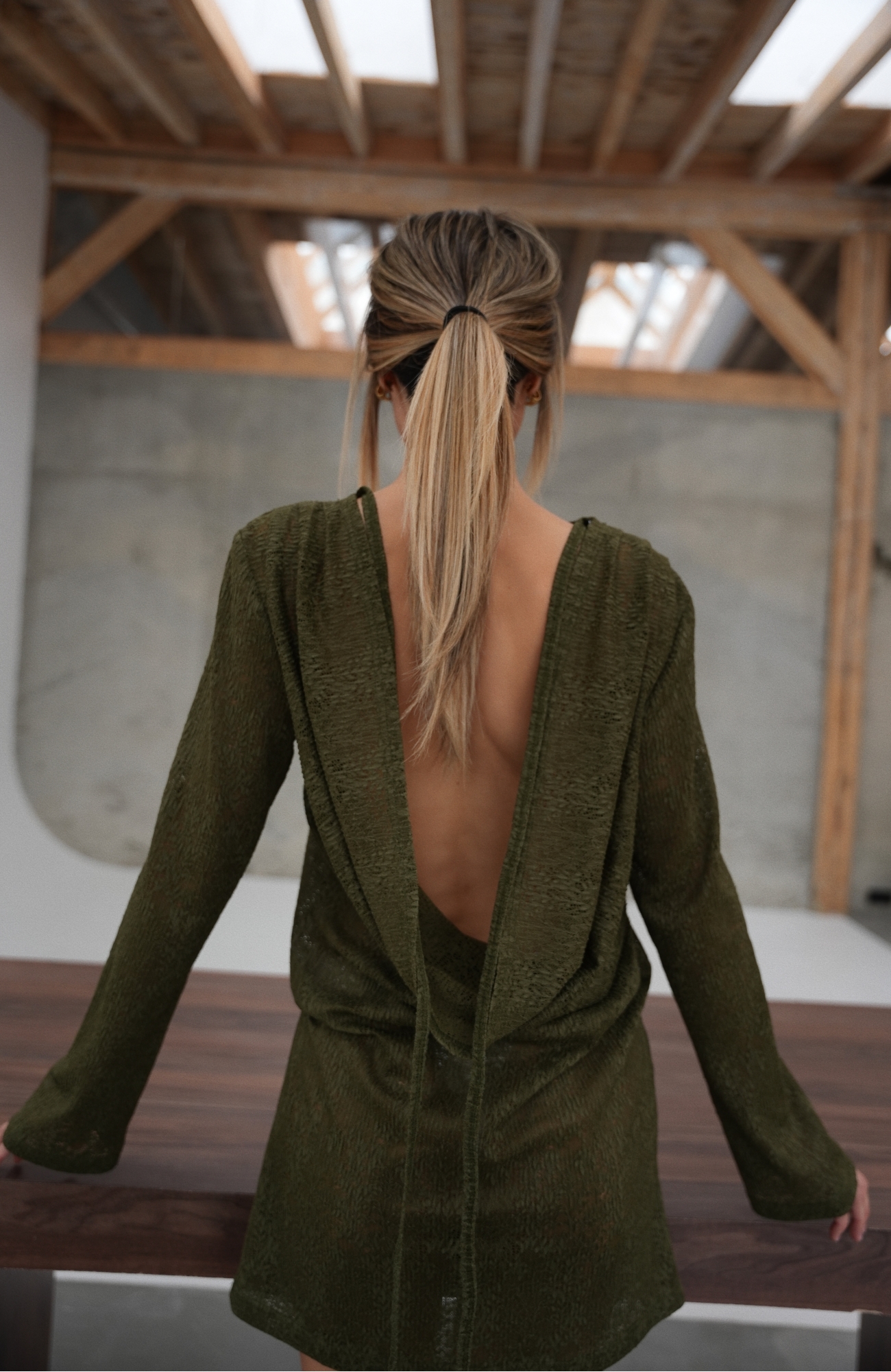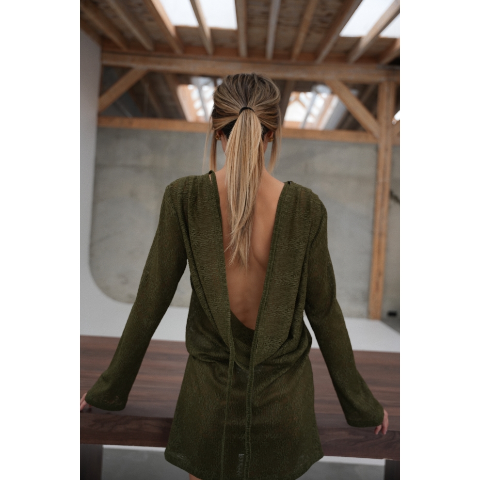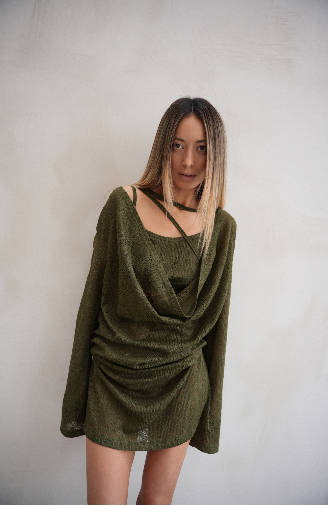 Платье полуприталенного силуэта в длине мини, выполнено из эластичного гипюра. Слегка расклешенный рукав, глубокий вырез "качелька" и кулиски являются акцентными деталями платья. Дополните образ изделиями из коллекции "Афродита", а именно: топ, брюки клеш, платье-кимоно, юбка-баска.