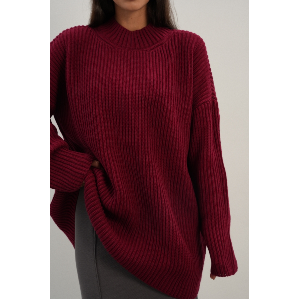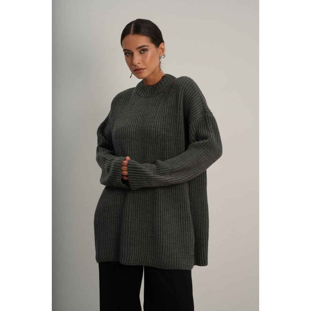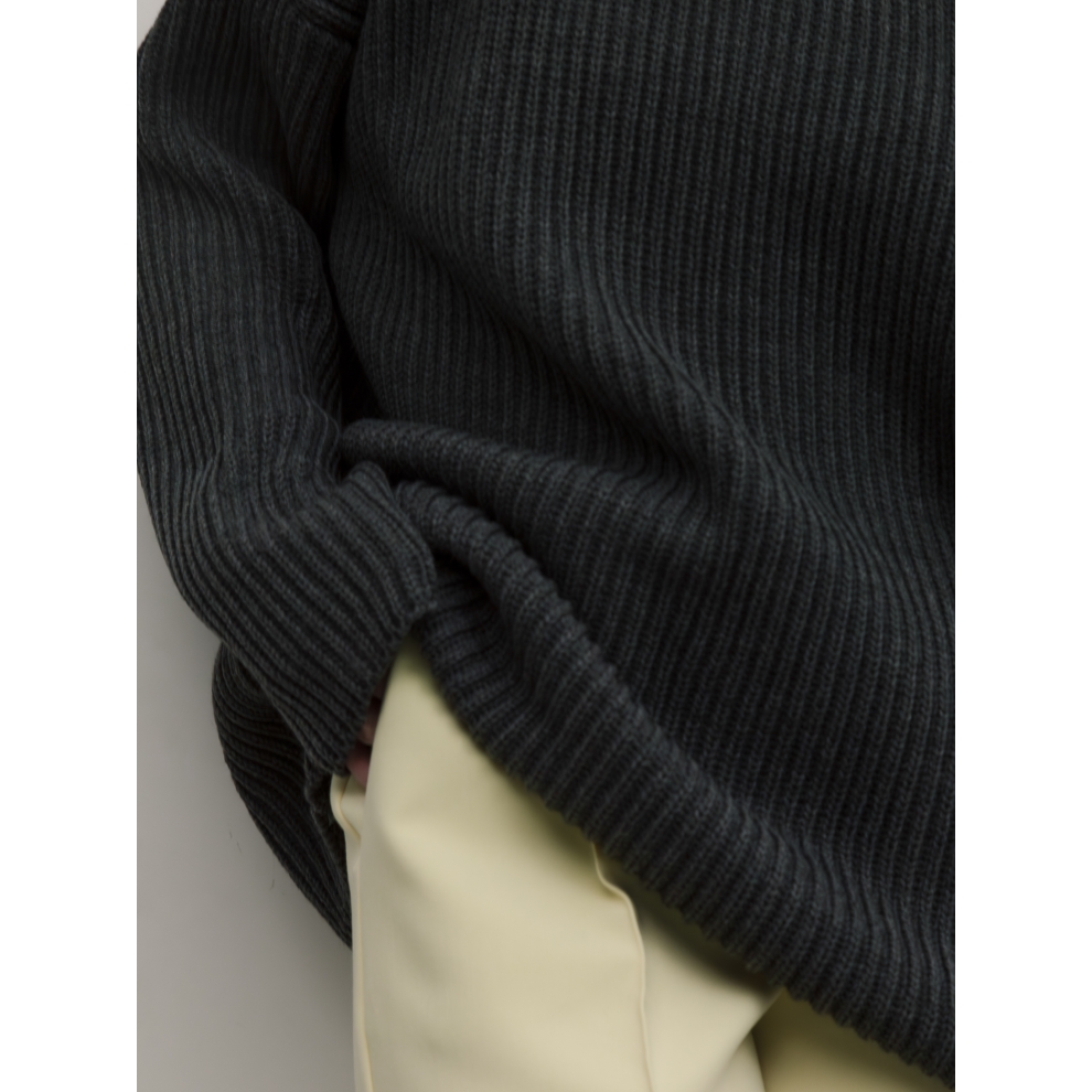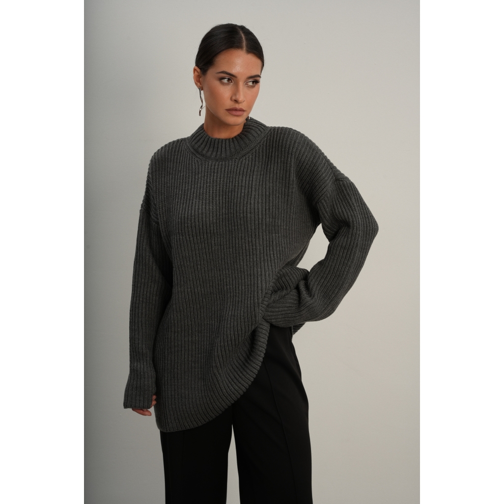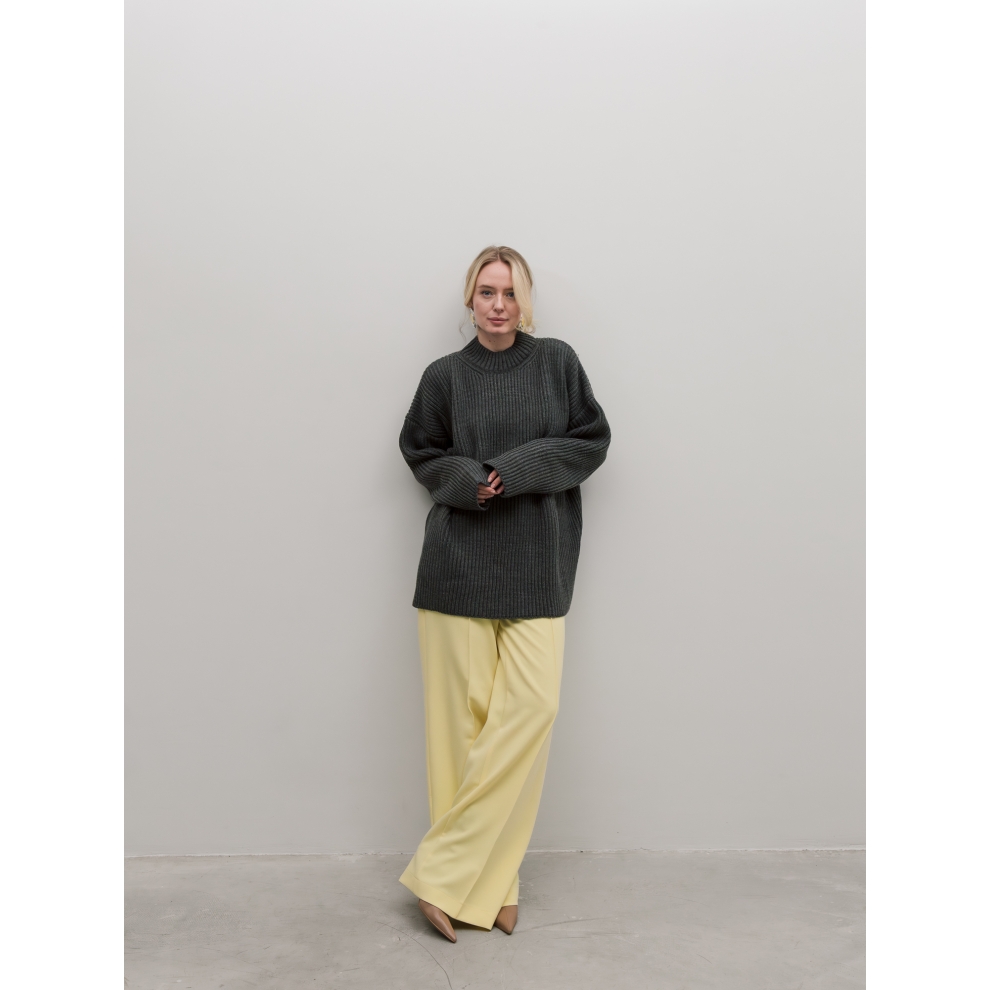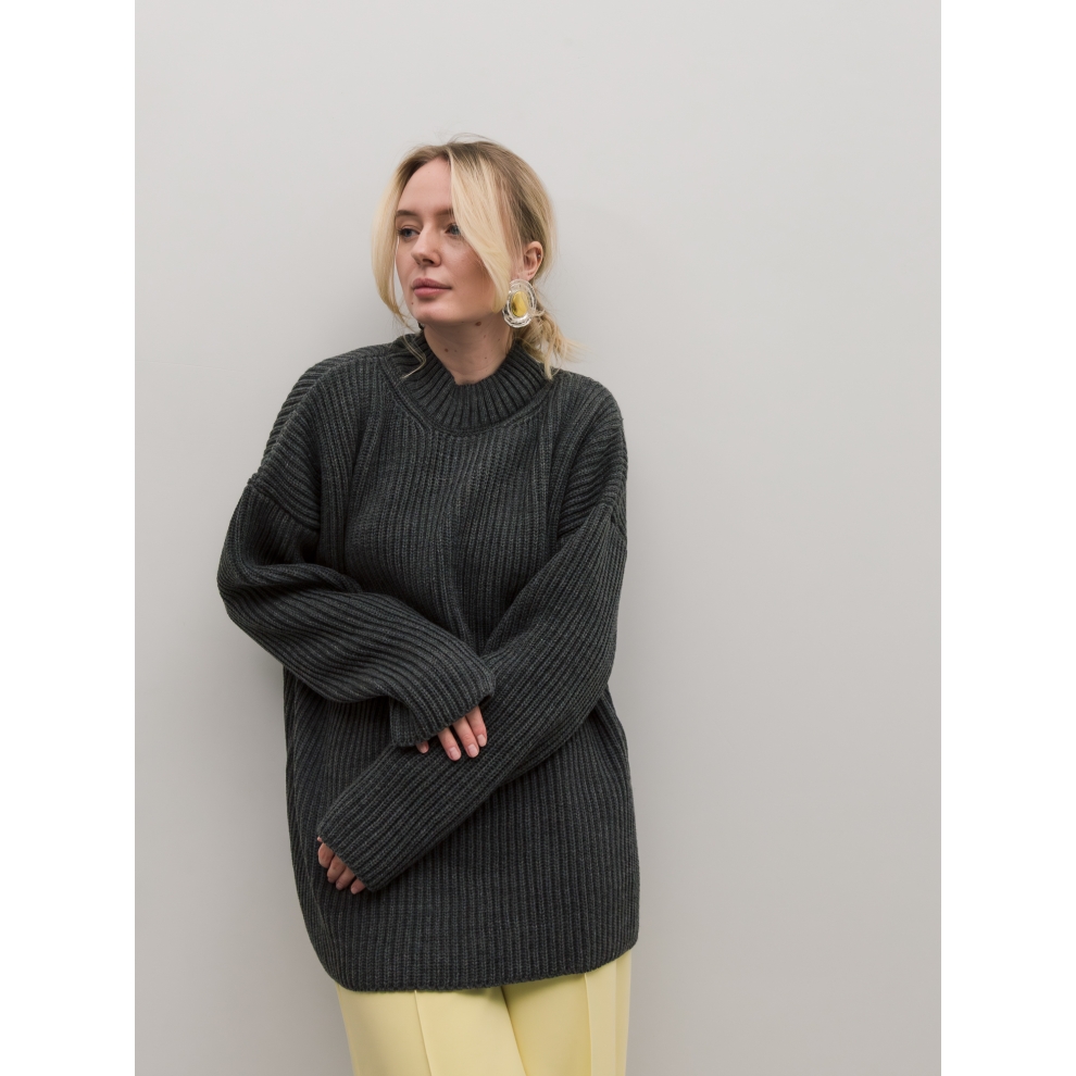 Базовый свитер свободного кроя выполнен из шерсти и акрила. Ворот стойка, низ рукавов и низ изделия выполнен без заужения.
