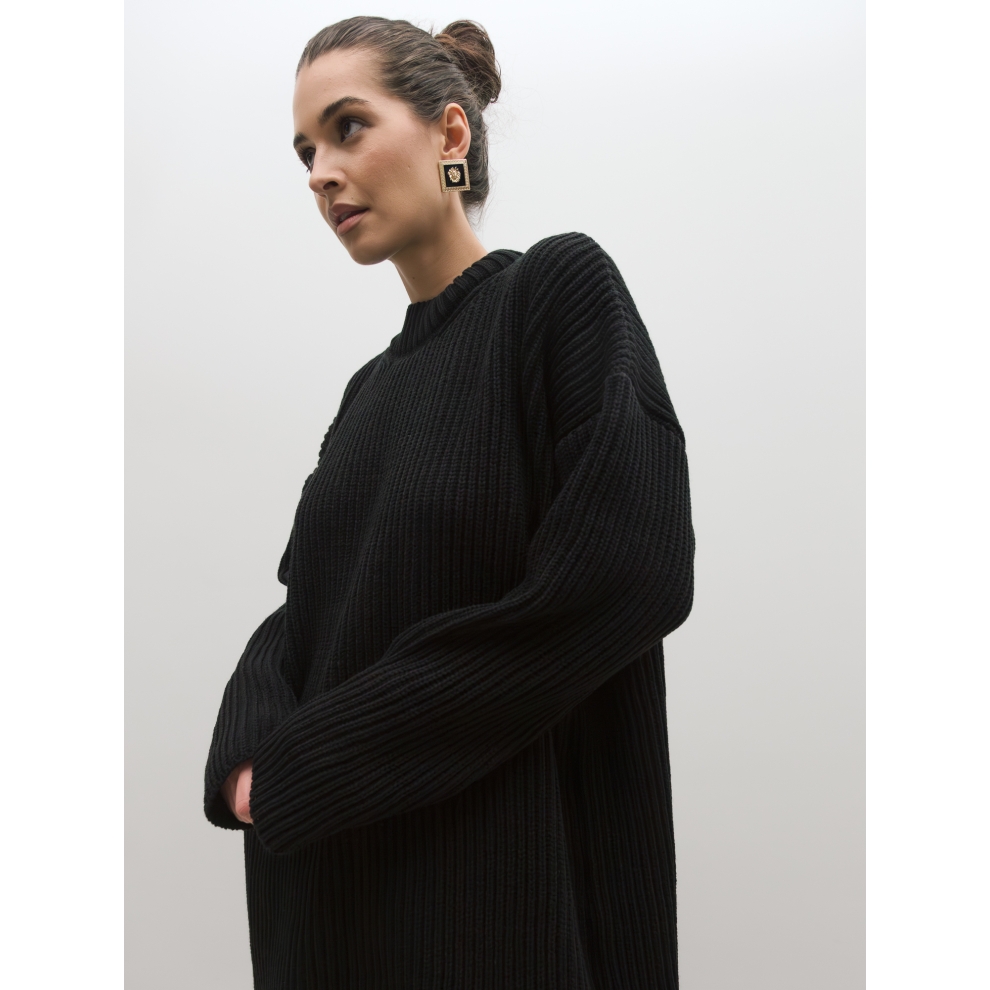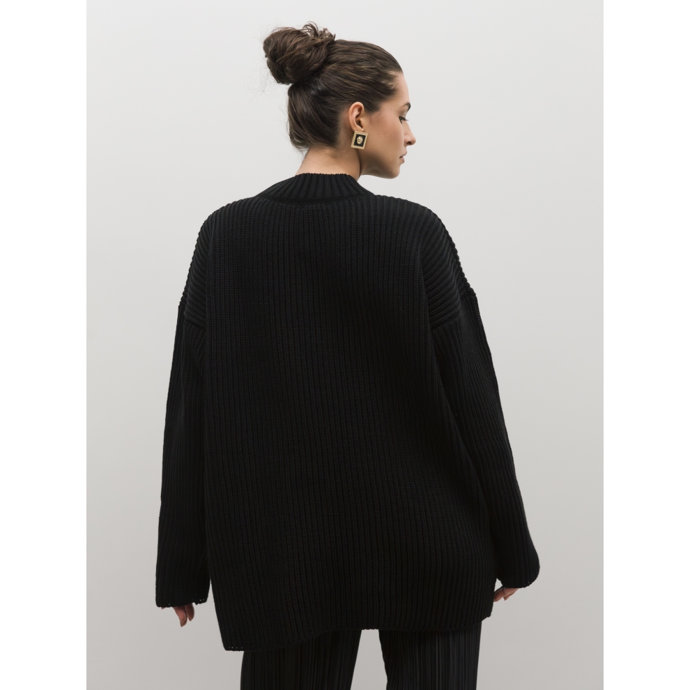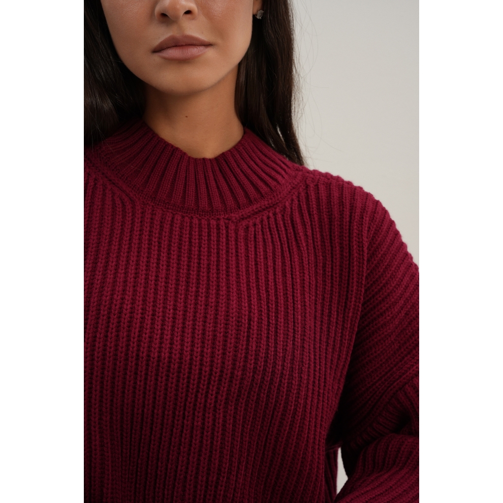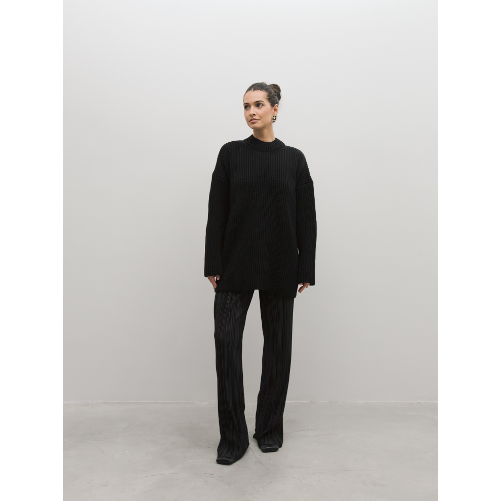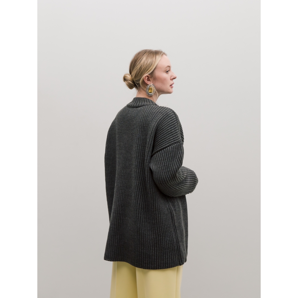 Базовый свитер свободного кроя выполнен из шерсти и акрила. Ворот стойка, низ рукавов и низ изделия выполнен без заужения.