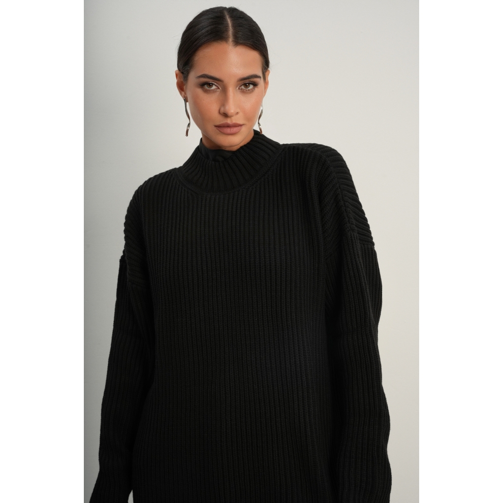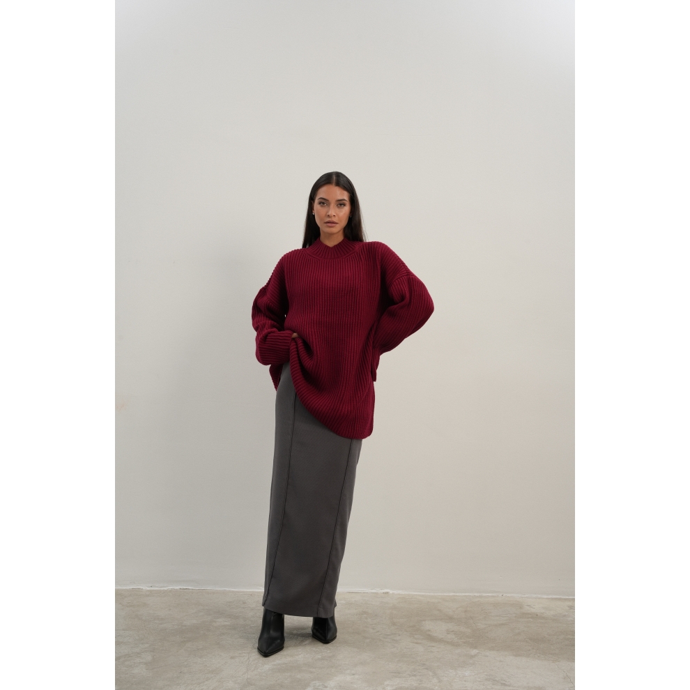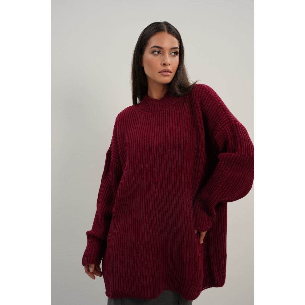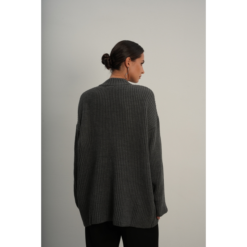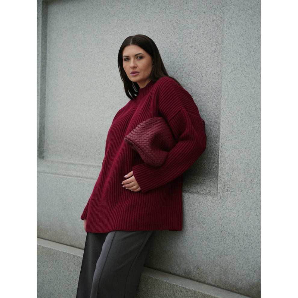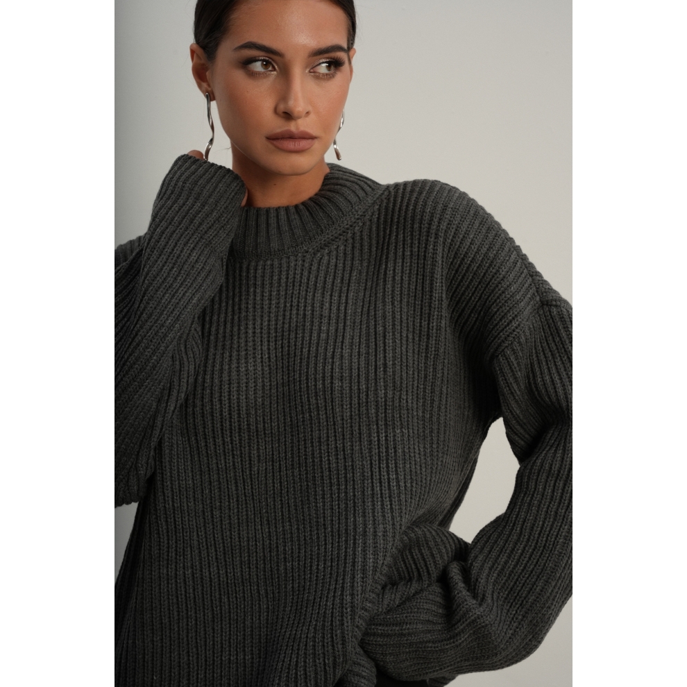 Базовый свитер свободного кроя выполнен из шерсти и акрила. Ворот стойка, низ рукавов и низ изделия выполнен без заужения.
