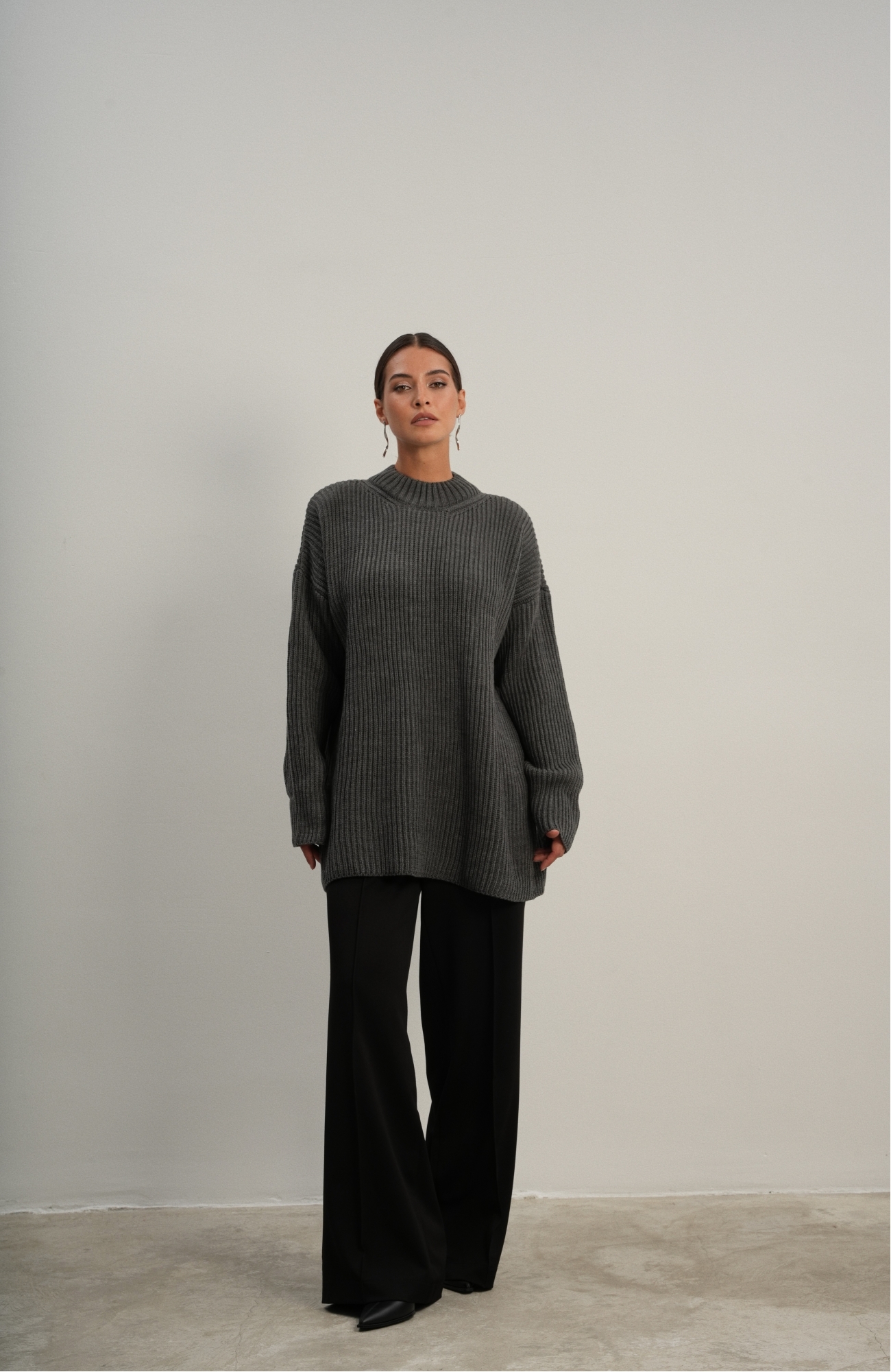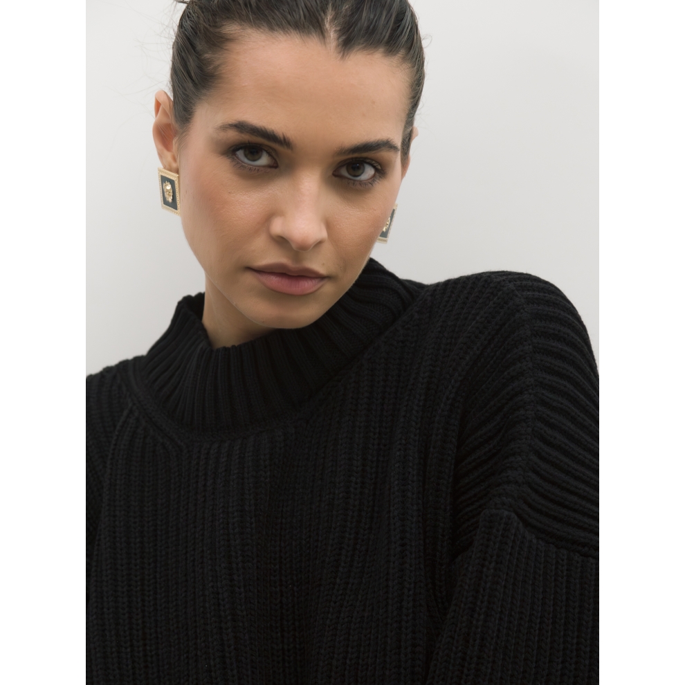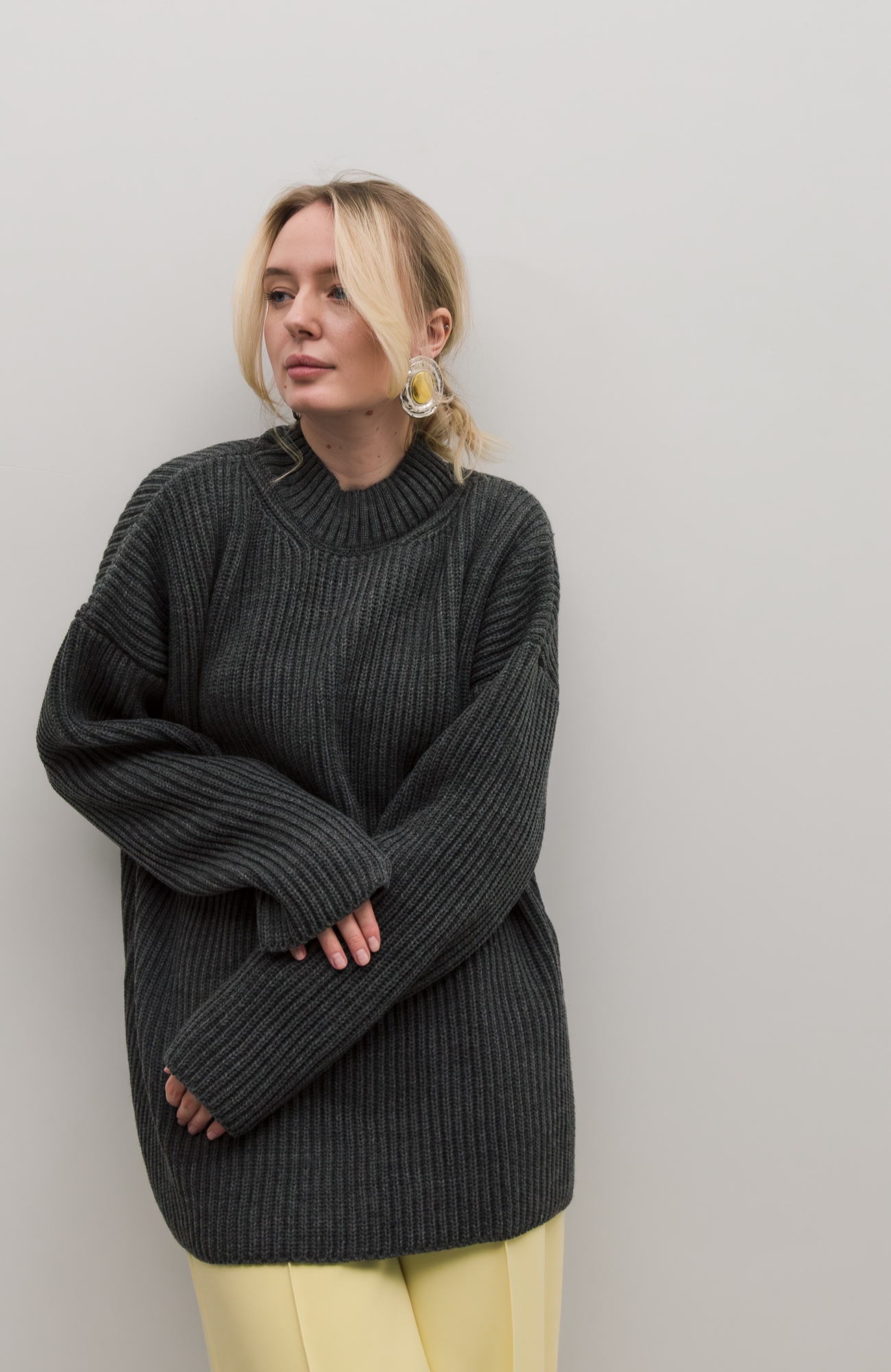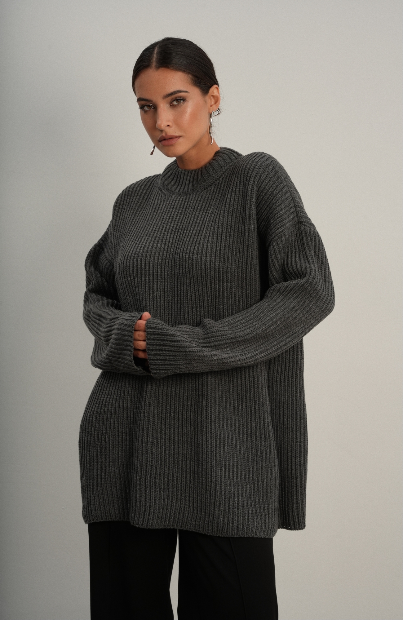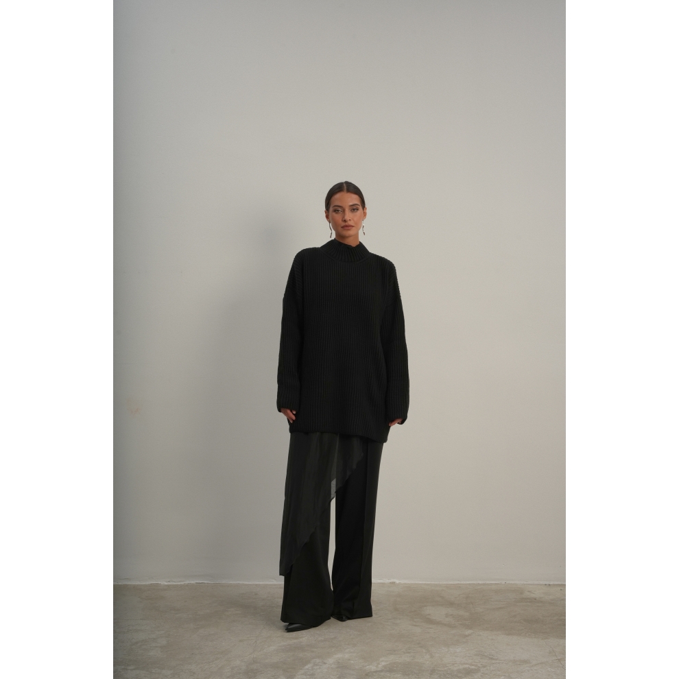 Базовый свитер свободного кроя выполнен из шерсти и акрила. Ворот стойка, низ рукавов и низ изделия выполнен без заужения.