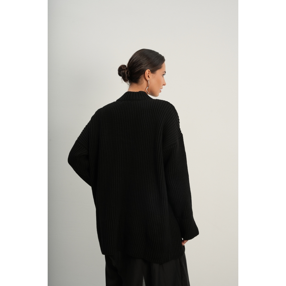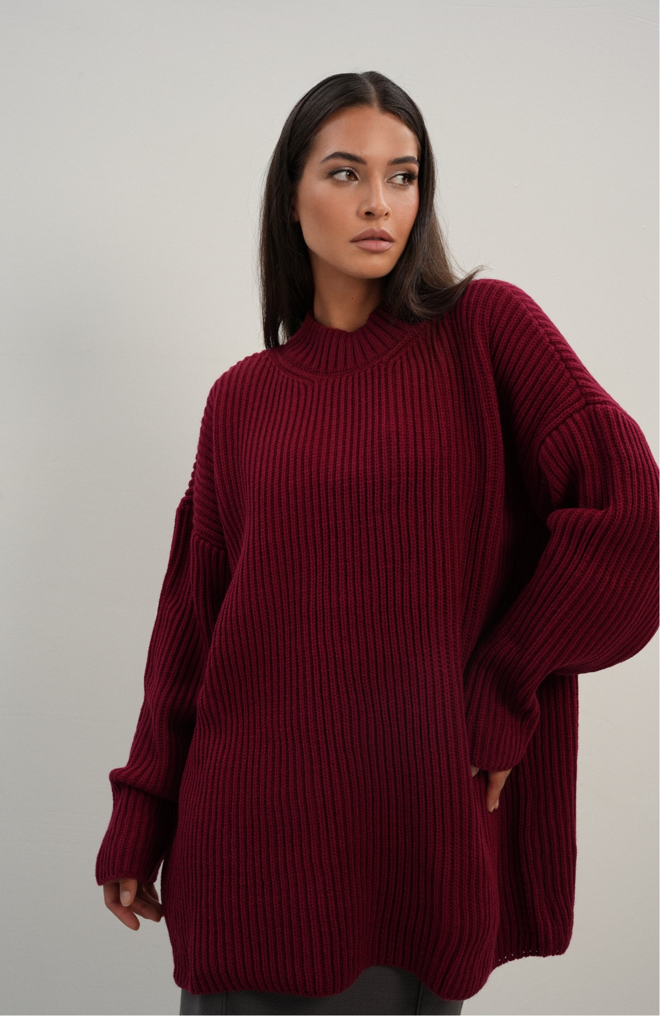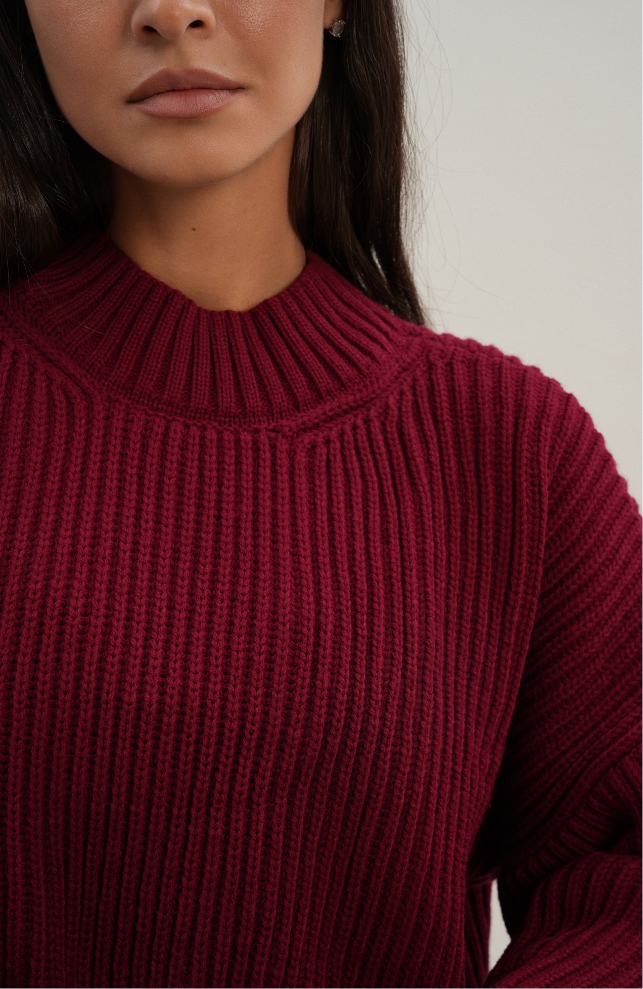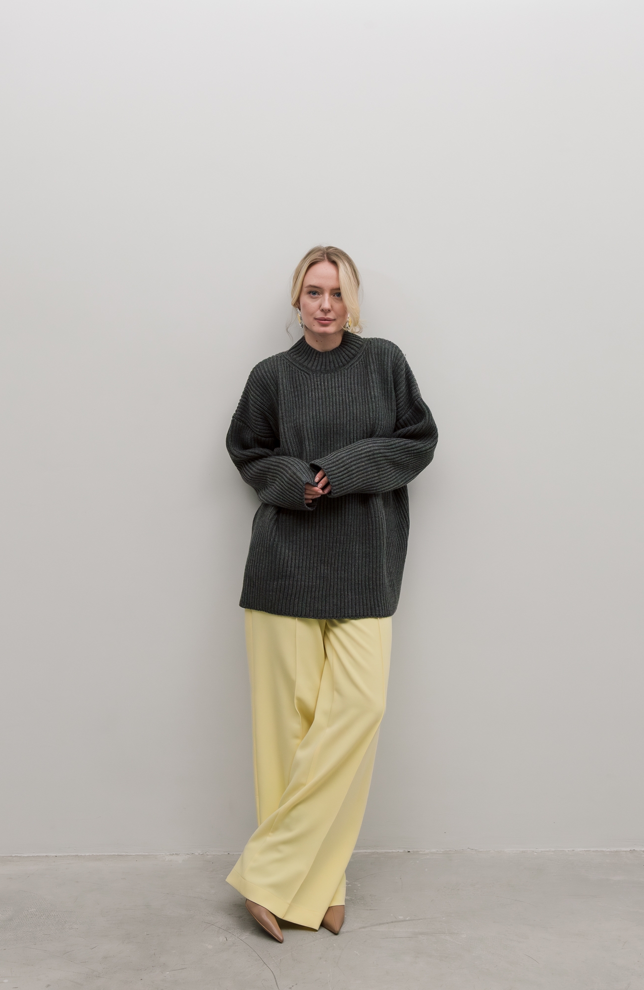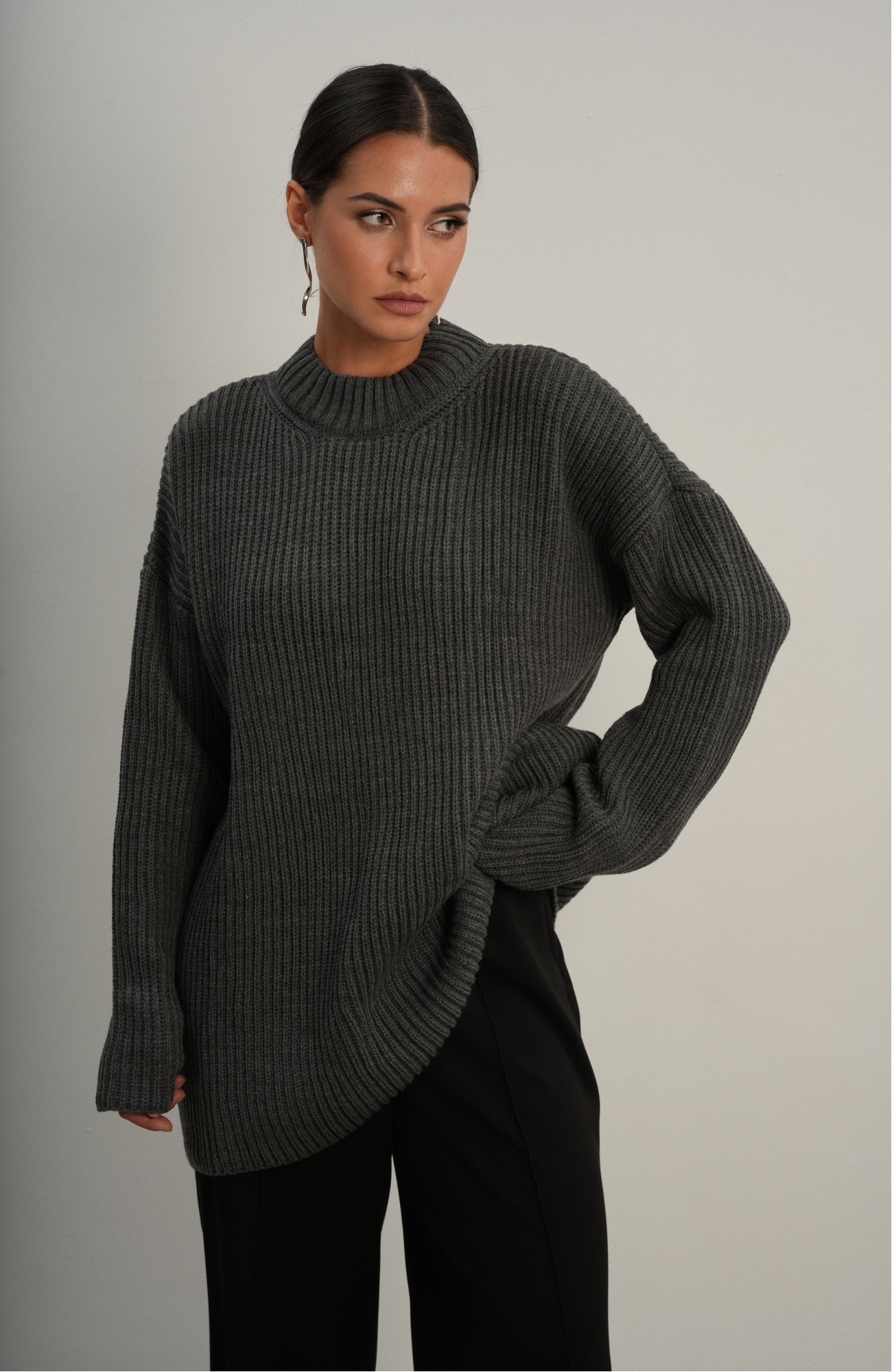 Базовый свитер свободного кроя выполнен из шерсти и акрила. Ворот стойка, низ рукавов и низ изделия выполнен без заужения.