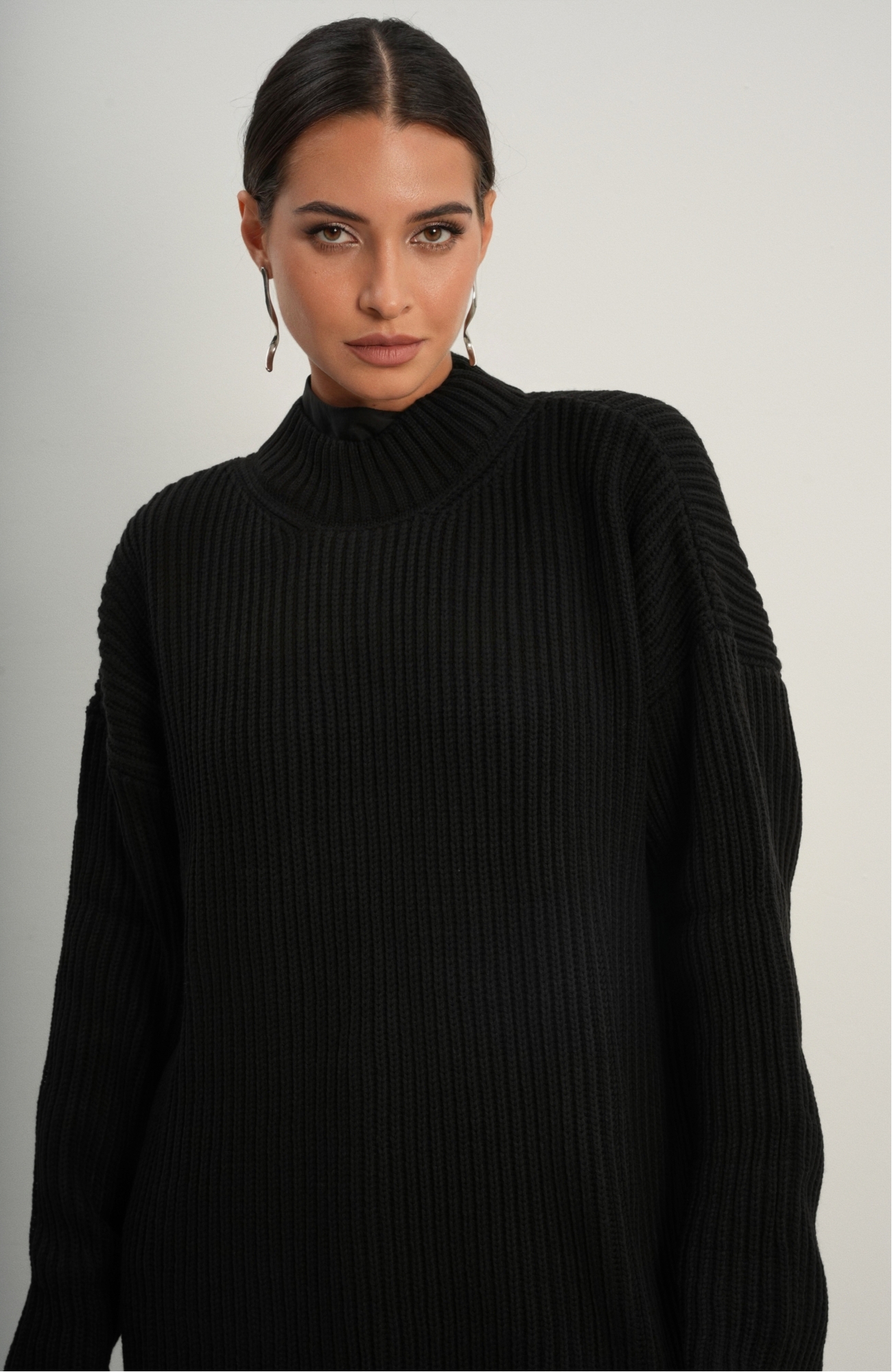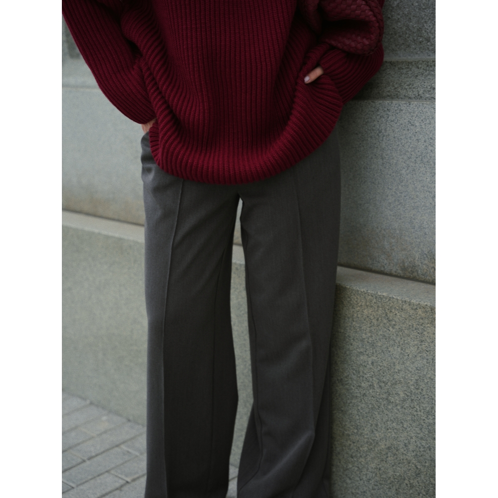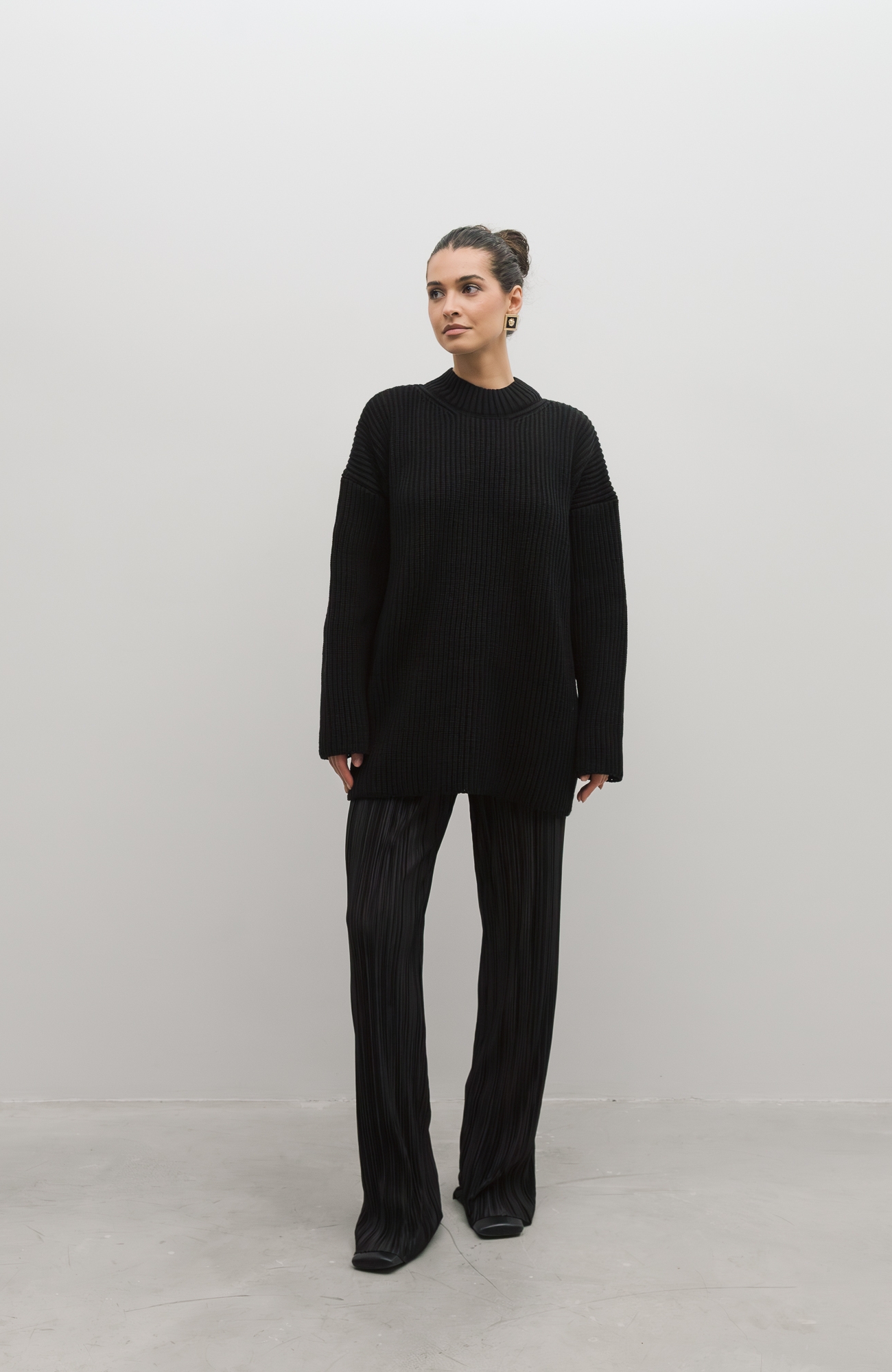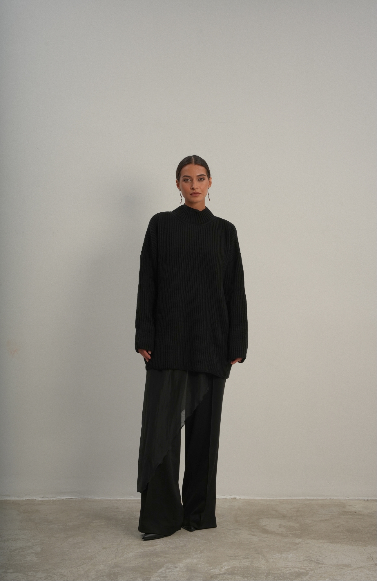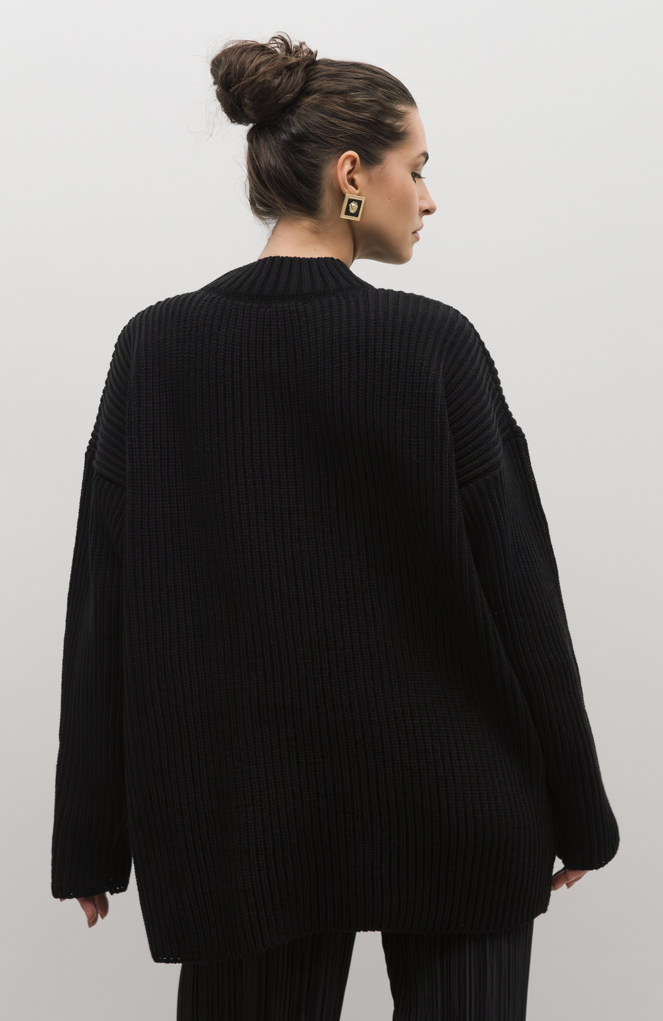 Базовый свитер свободного кроя выполнен из шерсти и акрила. Ворот стойка, низ рукавов и низ изделия выполнен без заужения.