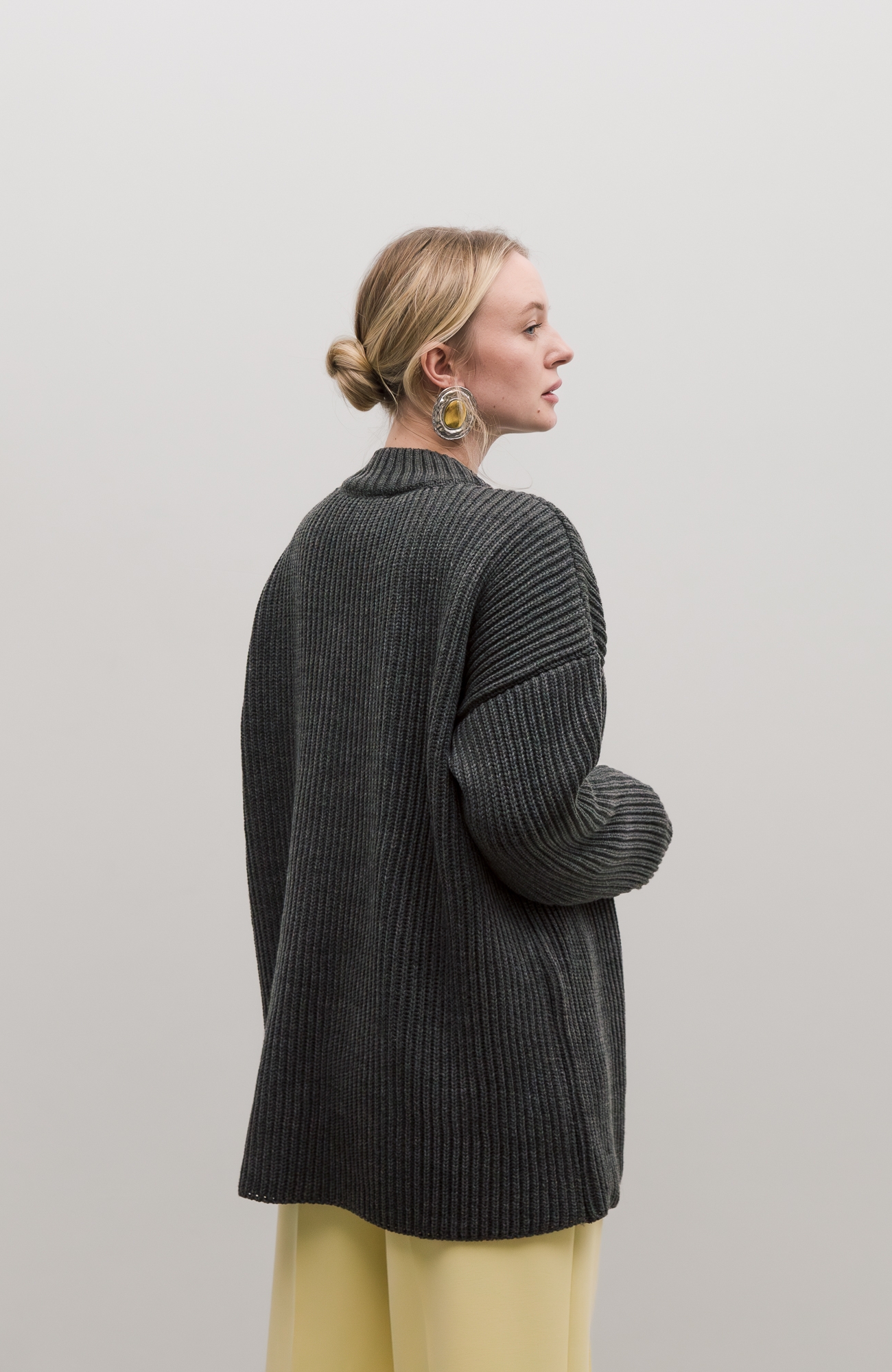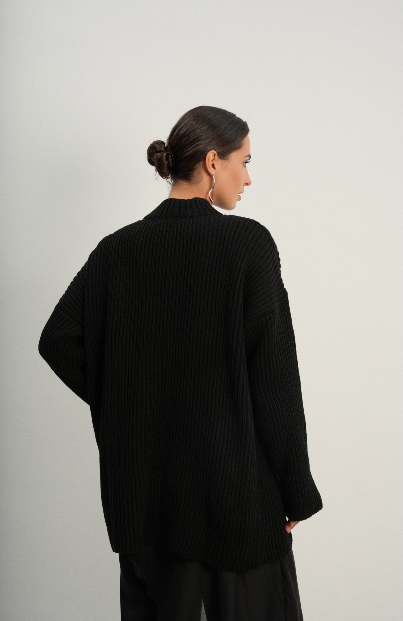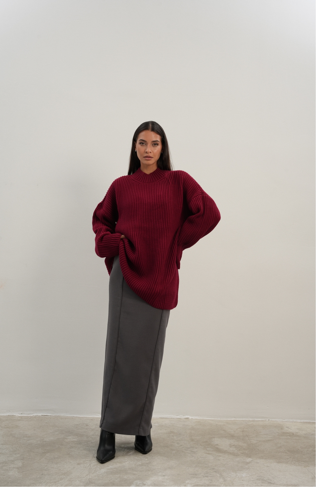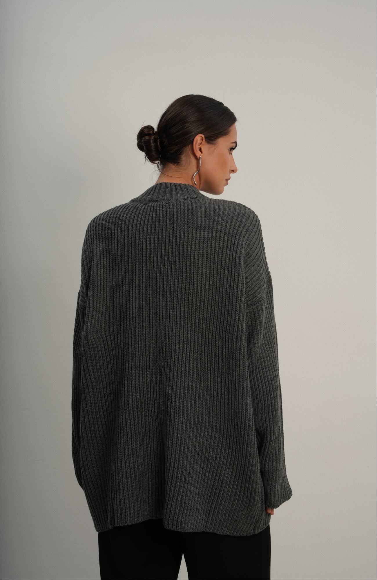 Базовый свитер свободного кроя выполнен из шерсти и акрила. Ворот стойка, низ рукавов и низ изделия выполнен без заужения.