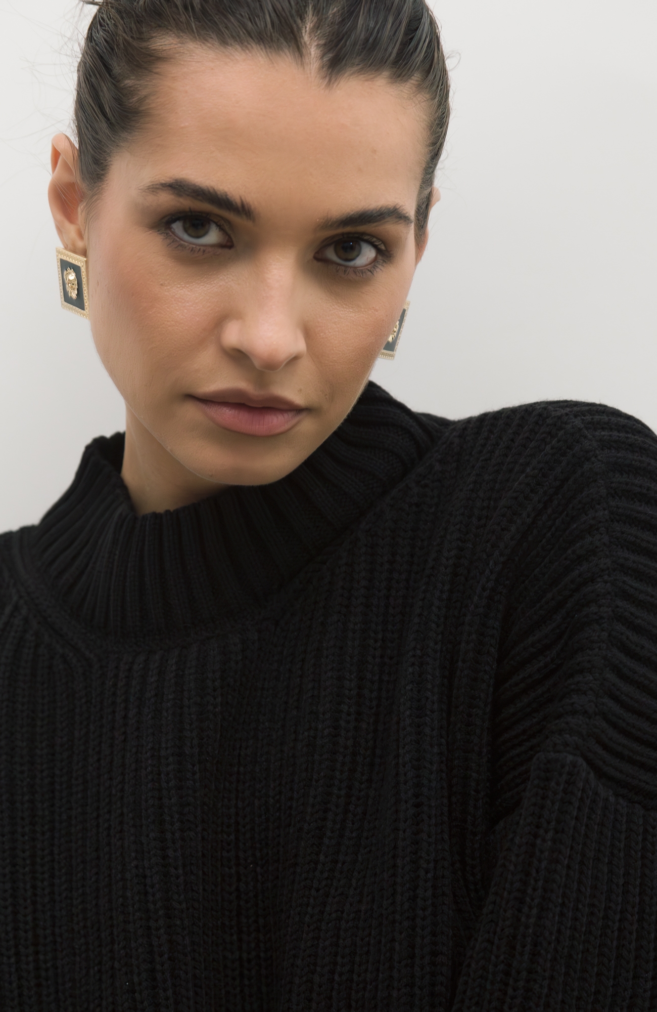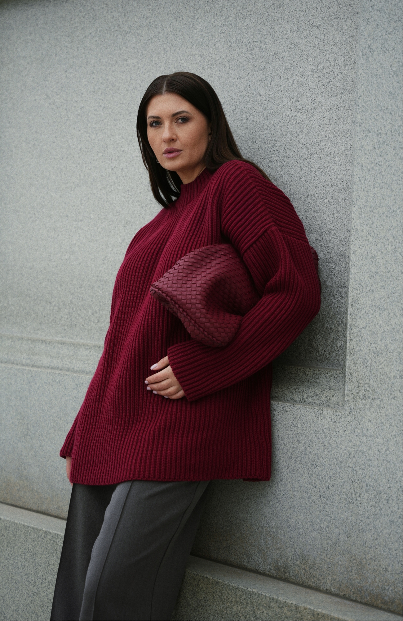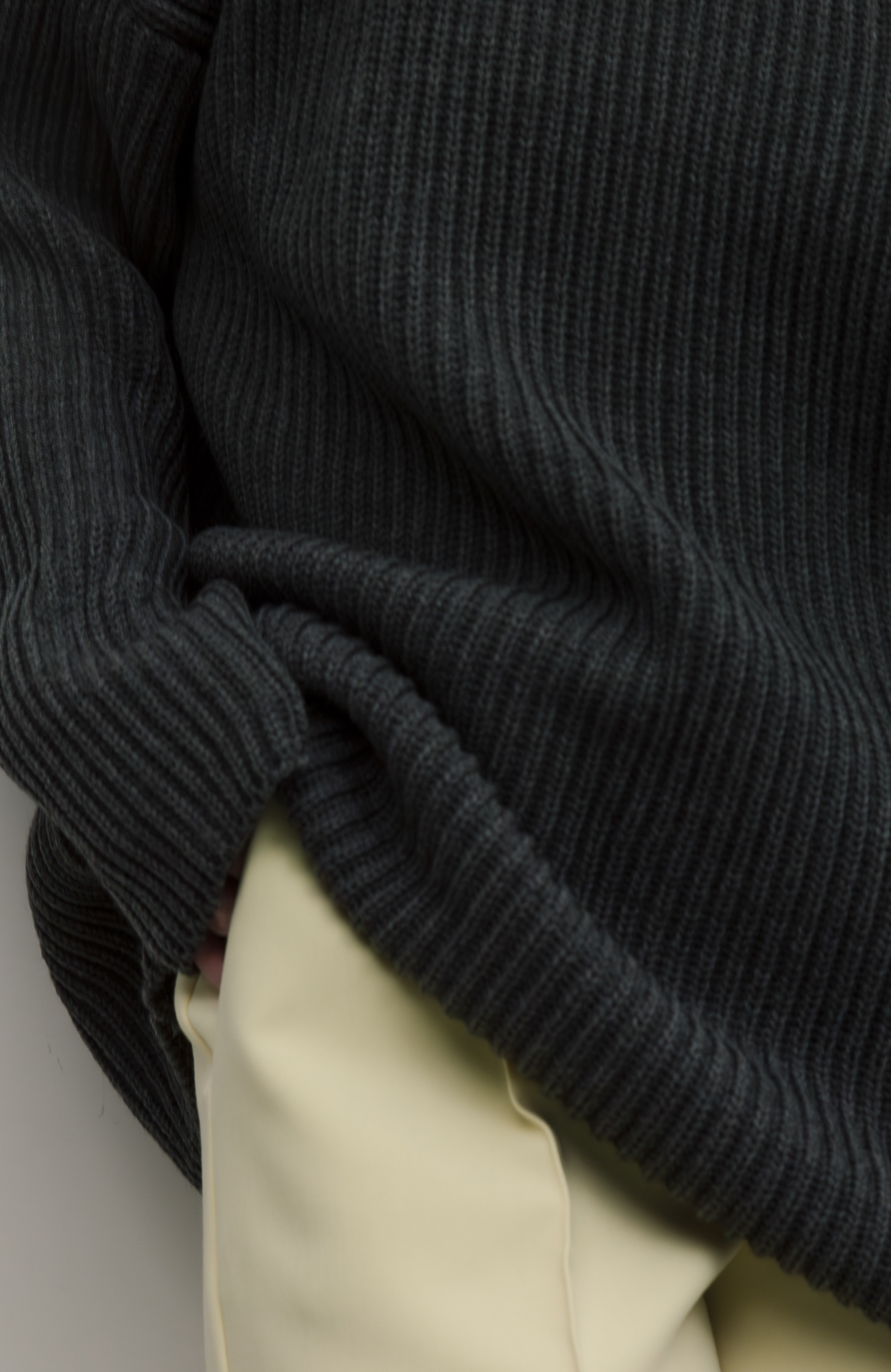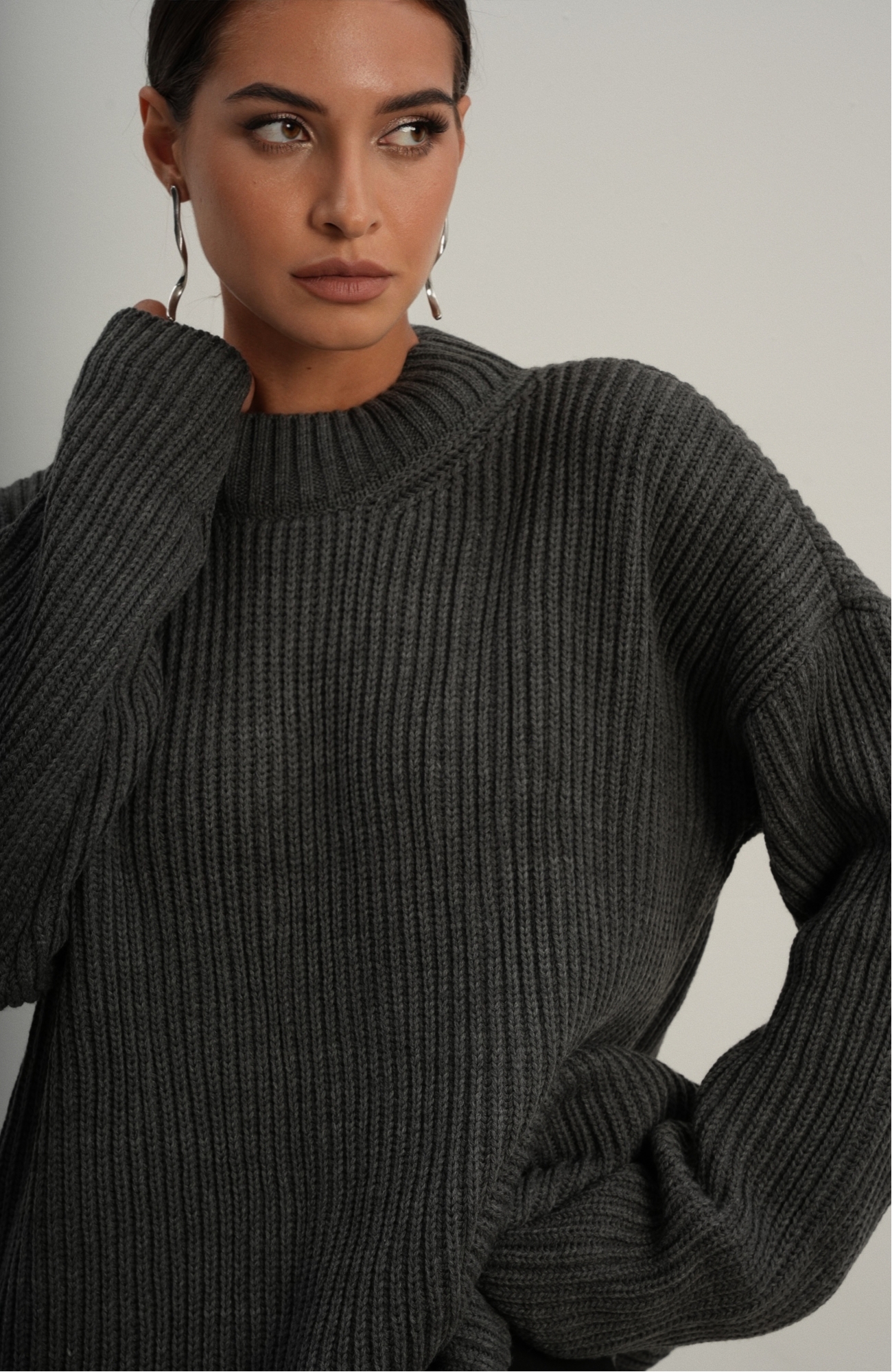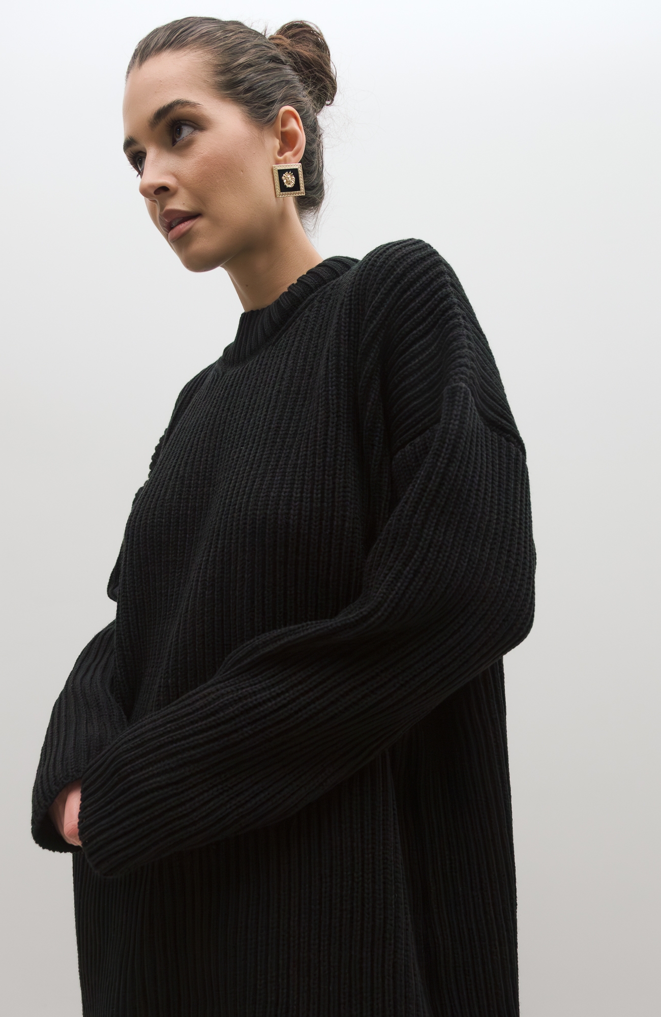 Базовый свитер свободного кроя выполнен из шерсти и акрила. Ворот стойка, низ рукавов и низ изделия выполнен без заужения.