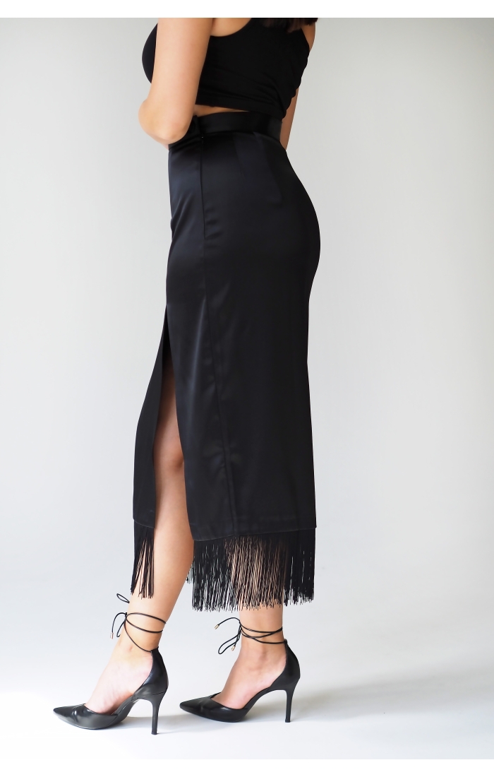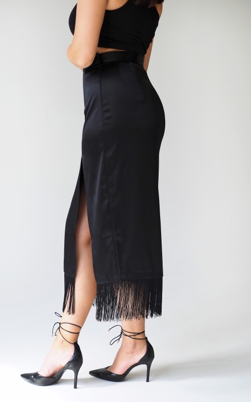 Юбка из атласа в длине миди. По низу изделия пришита бахрома.