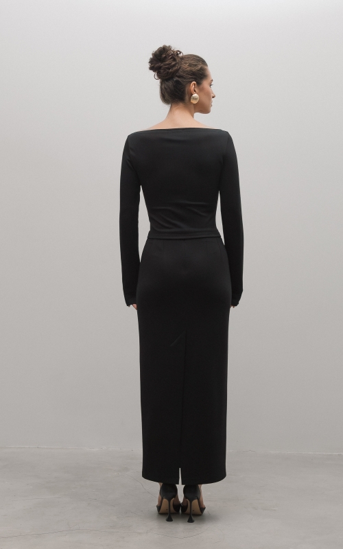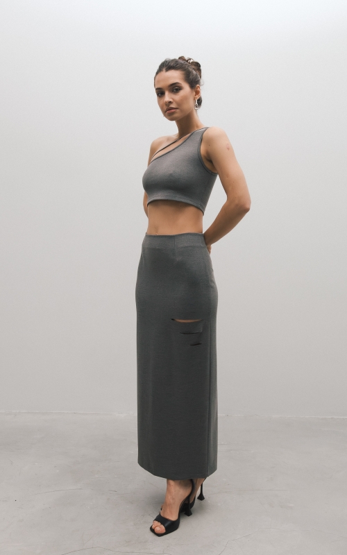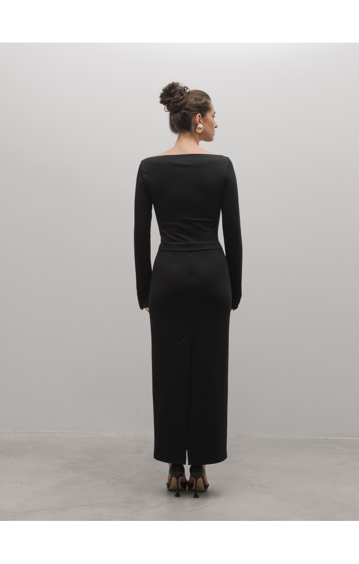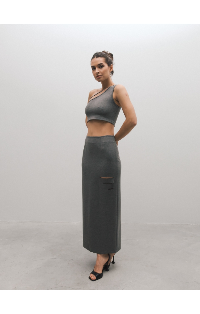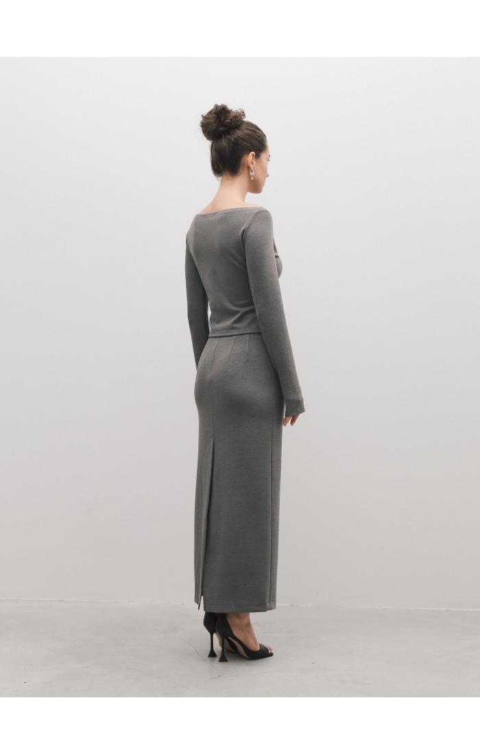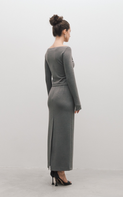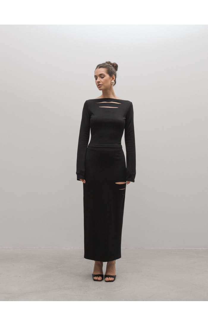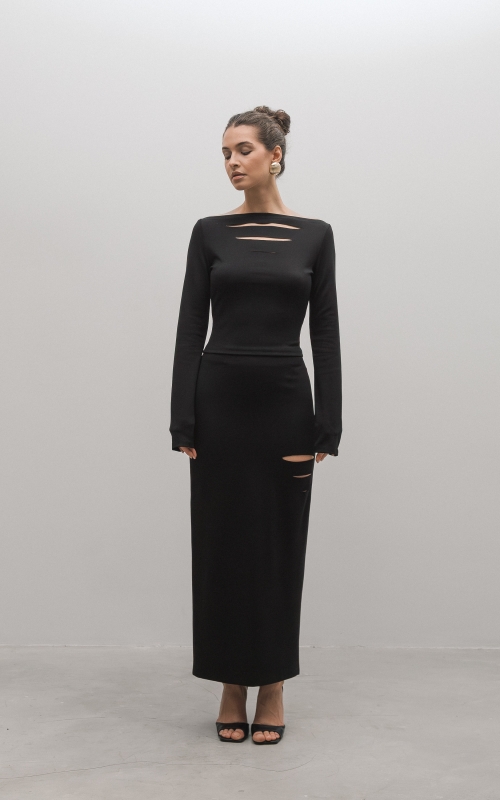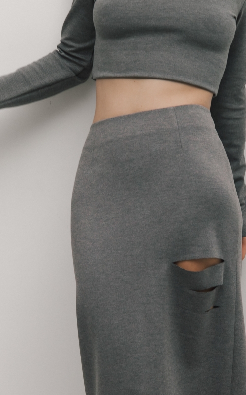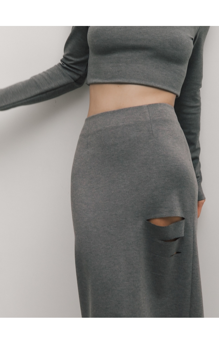 Юбка миди из вискозного джерси. Прямая юбка, сзади высокая шлица, спереди с левой стороны вырезы. Дополните образ лонгсливом CHIC.