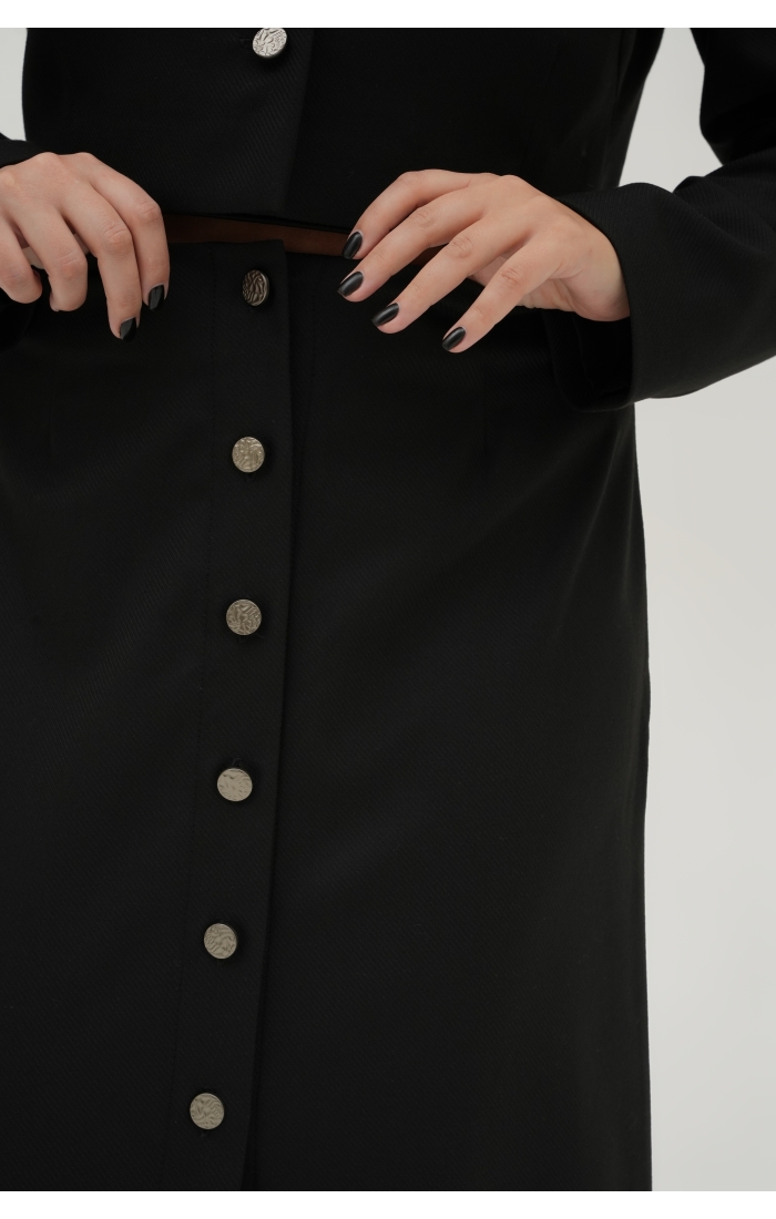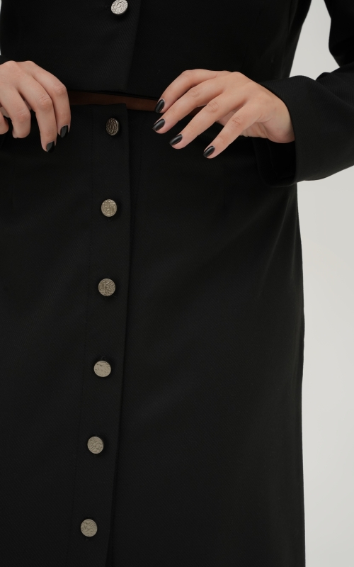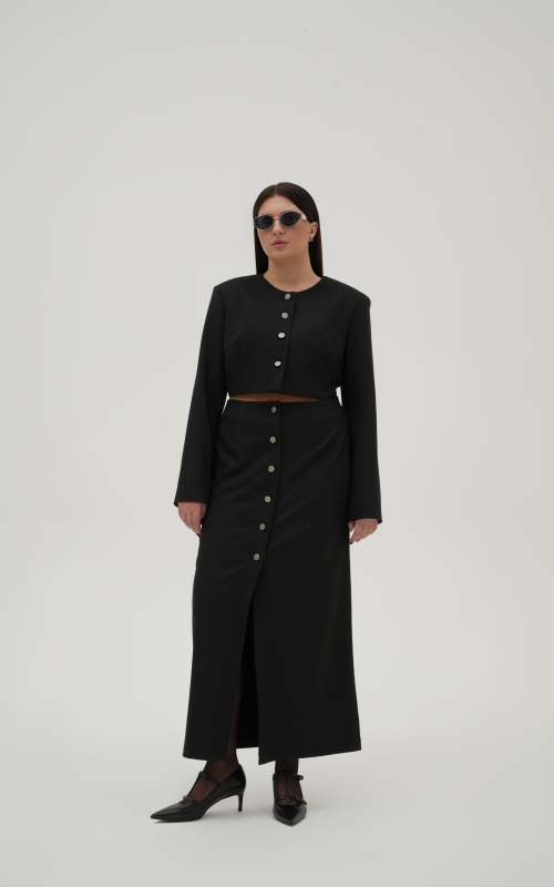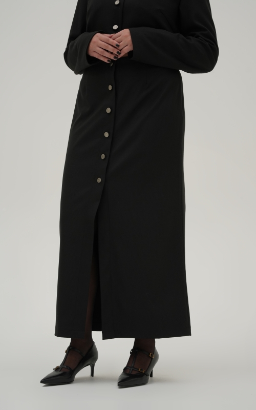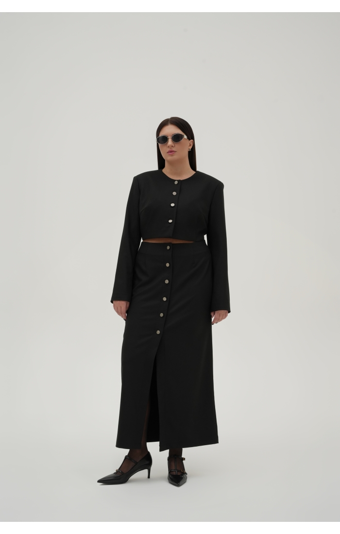 Юбка А-силуэта в длине макси. Выполнена из поливискозной костюмной ткани. По планке спереди во всю длину находятся акцентные пуговицы из "мятого" металла.