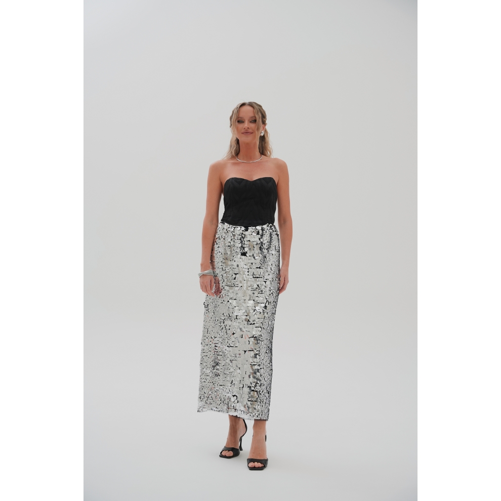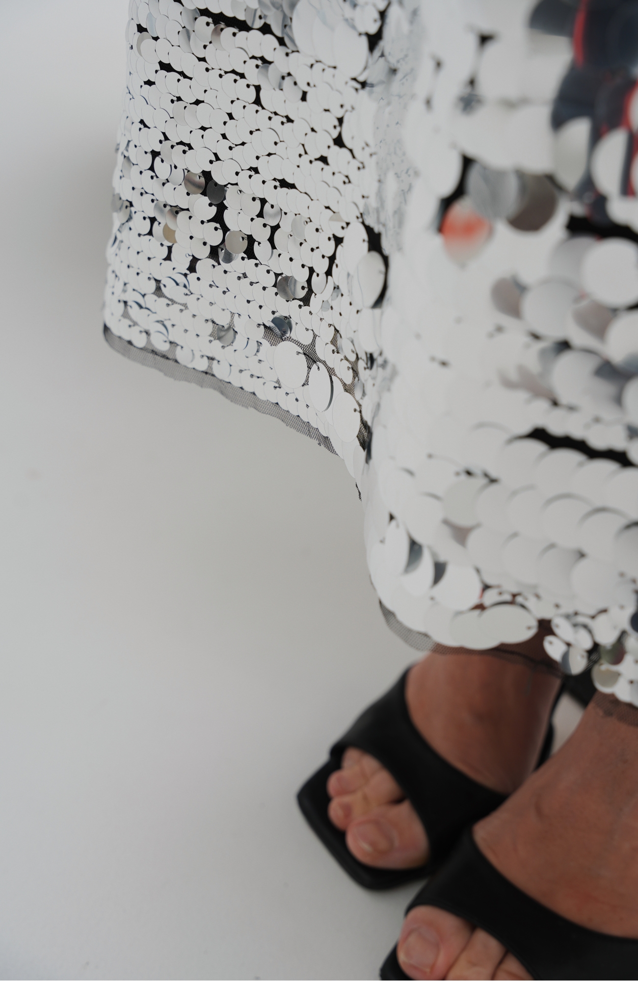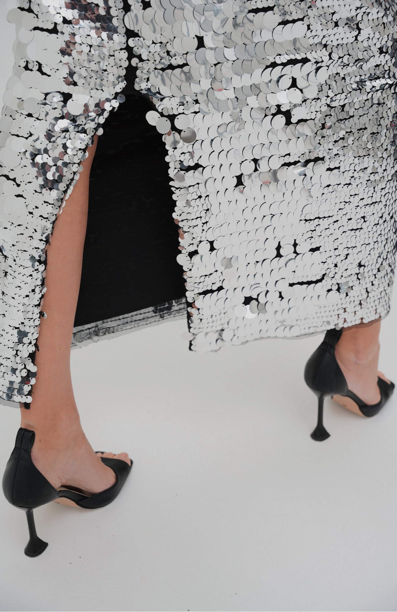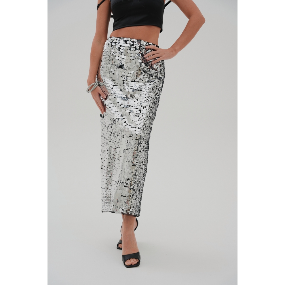 Прямая юбка на резинке из круглых серебряных пайеток. Длина миди, по боковому шву разрез.