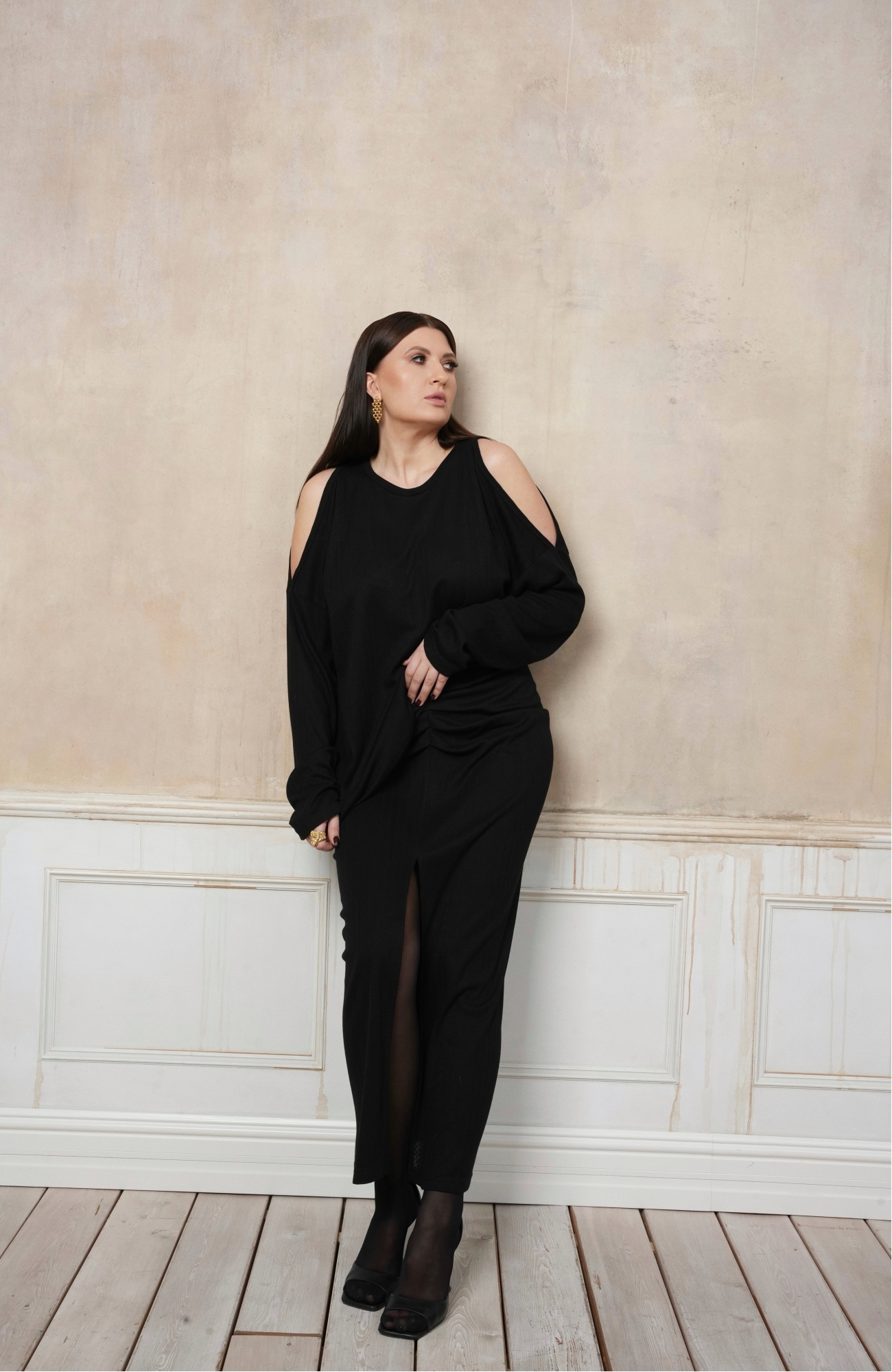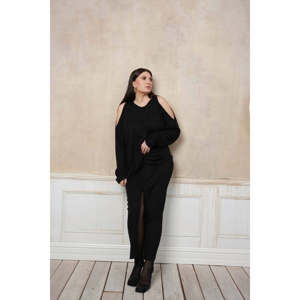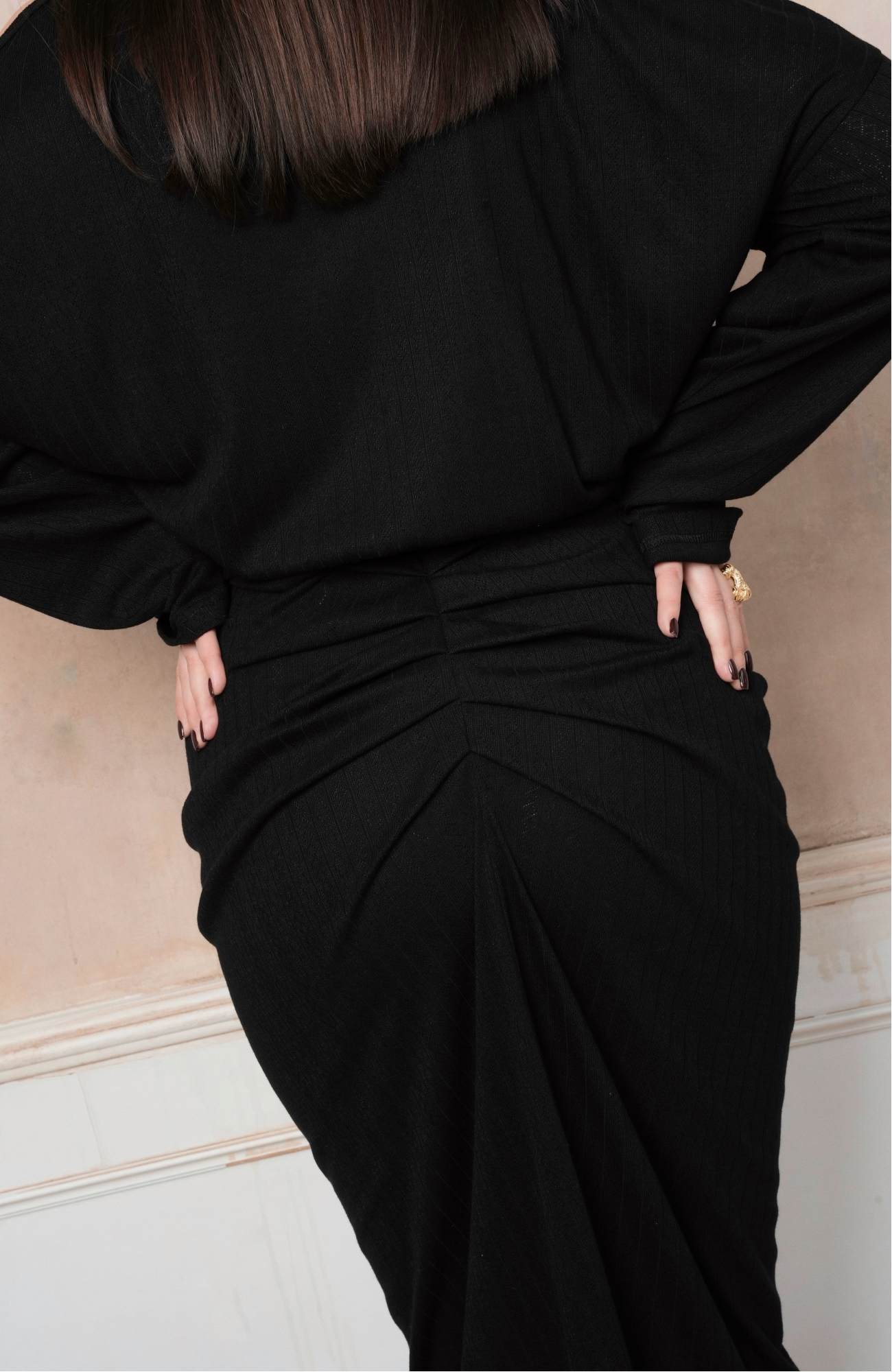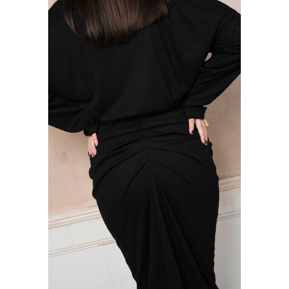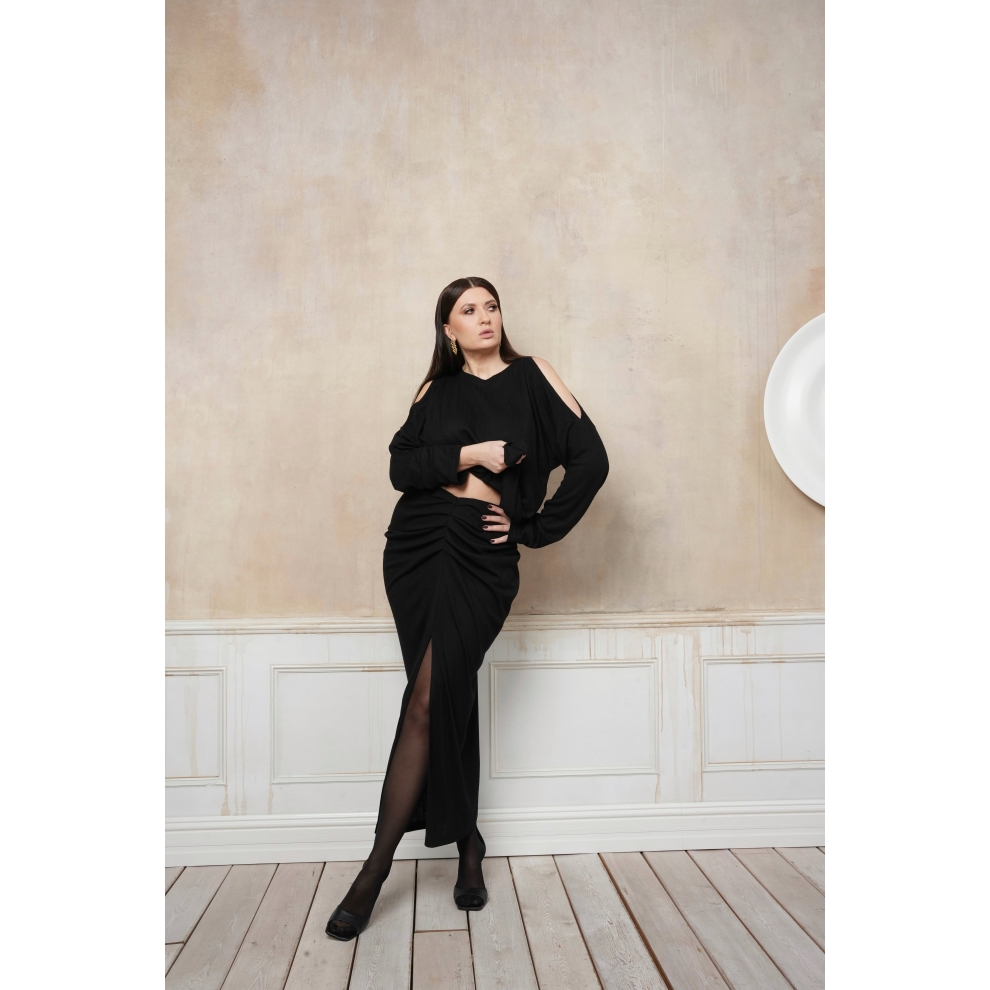 Юбка со сборкой из перфорированного трикотажа. Драпировку можно надевать вперед и на бок. Дополните образ лонгсливом "Круиз".
