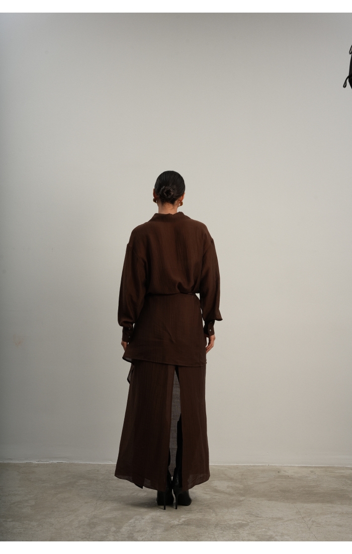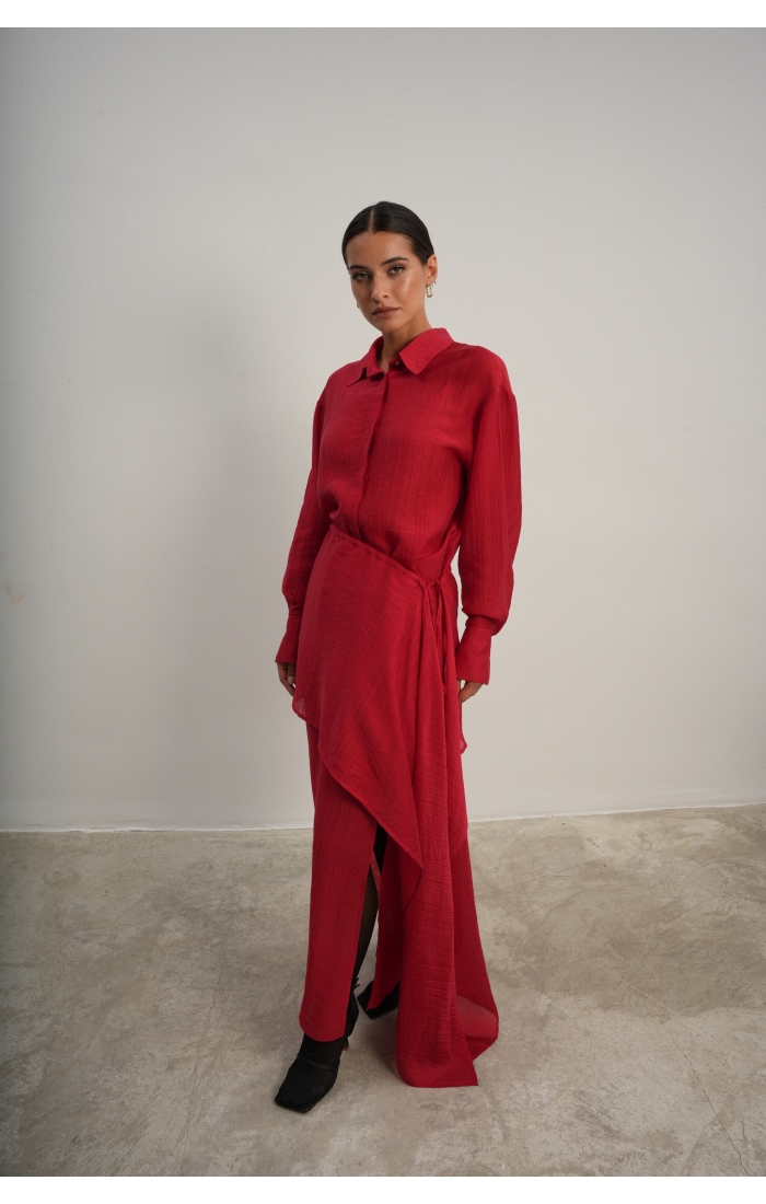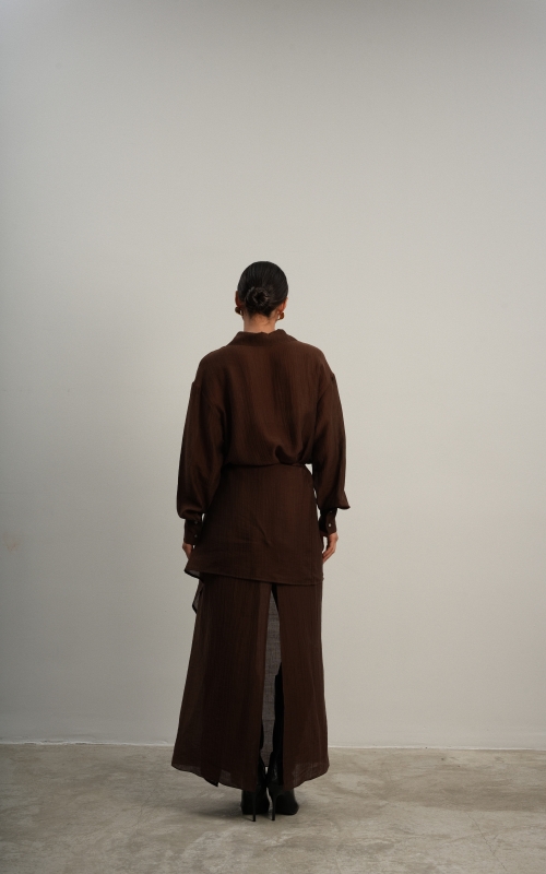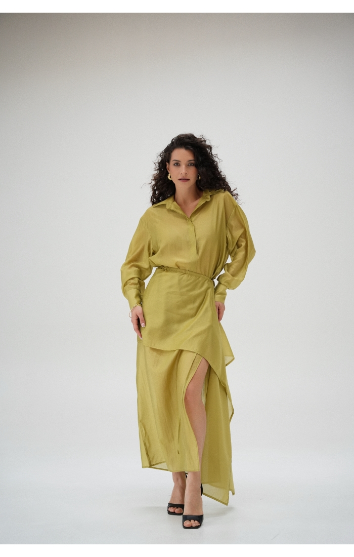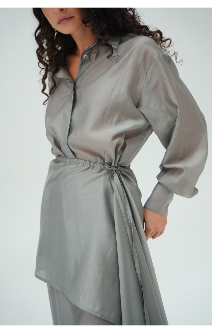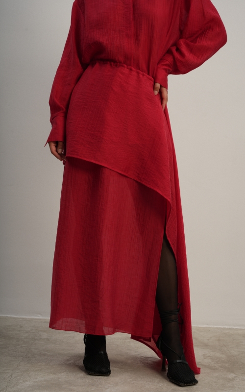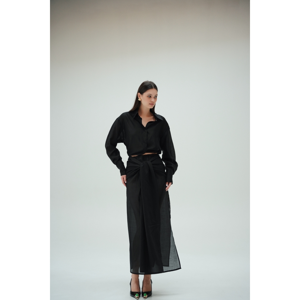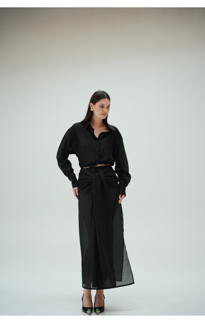 Юбка прямого кроя на резинке. Сверху надевается баска с длинными хвостами, которые добавляют женственности. Юбка-баска на кулиске, её можно завязывать на саму кулиску, оставляя спущенными хвосты, либо завязывать сами хвосты. Также баску можно трансформировать и использовать как топ. Баску легко интегрировать в разные образы, надевая поверх брюк, джинс, платьев и тд.