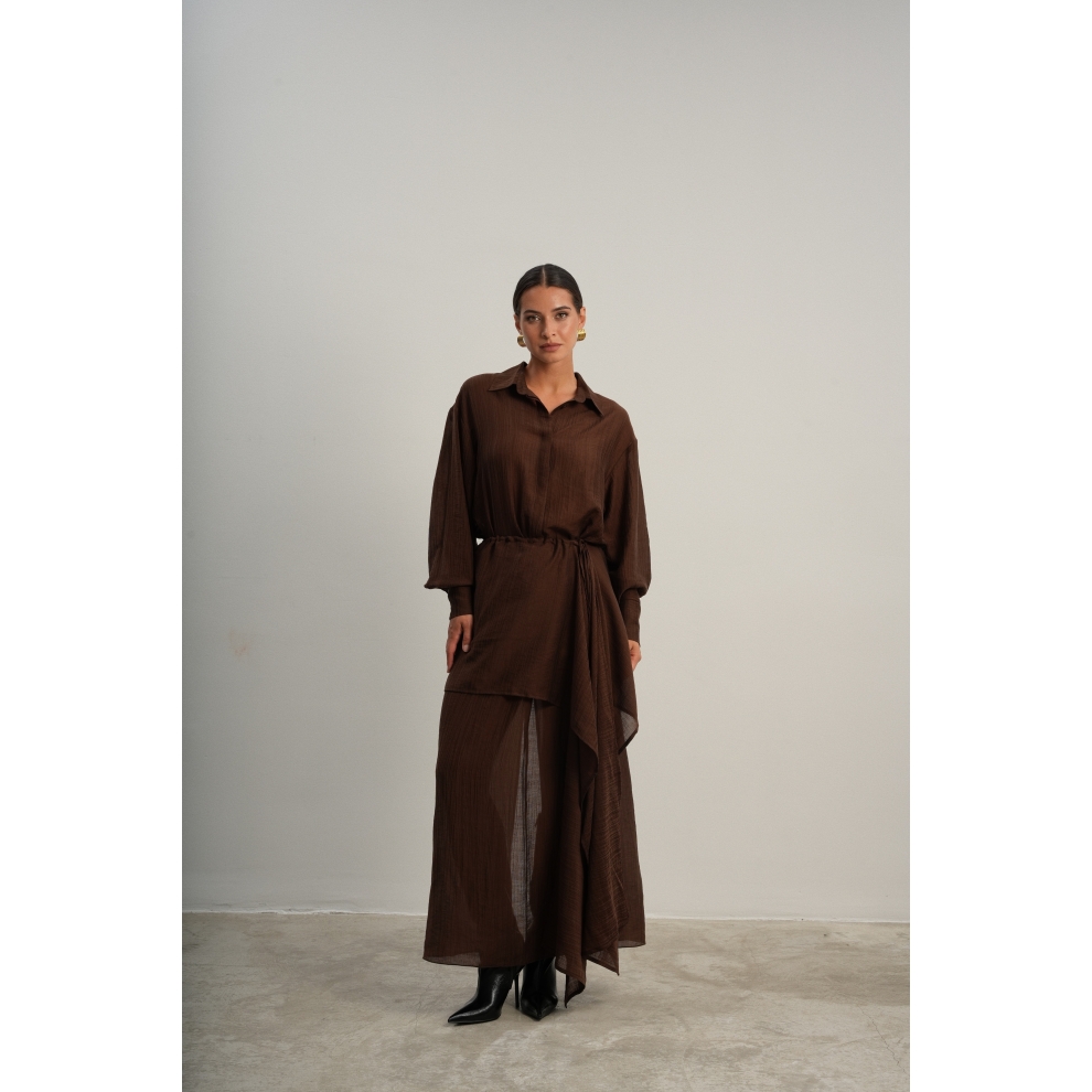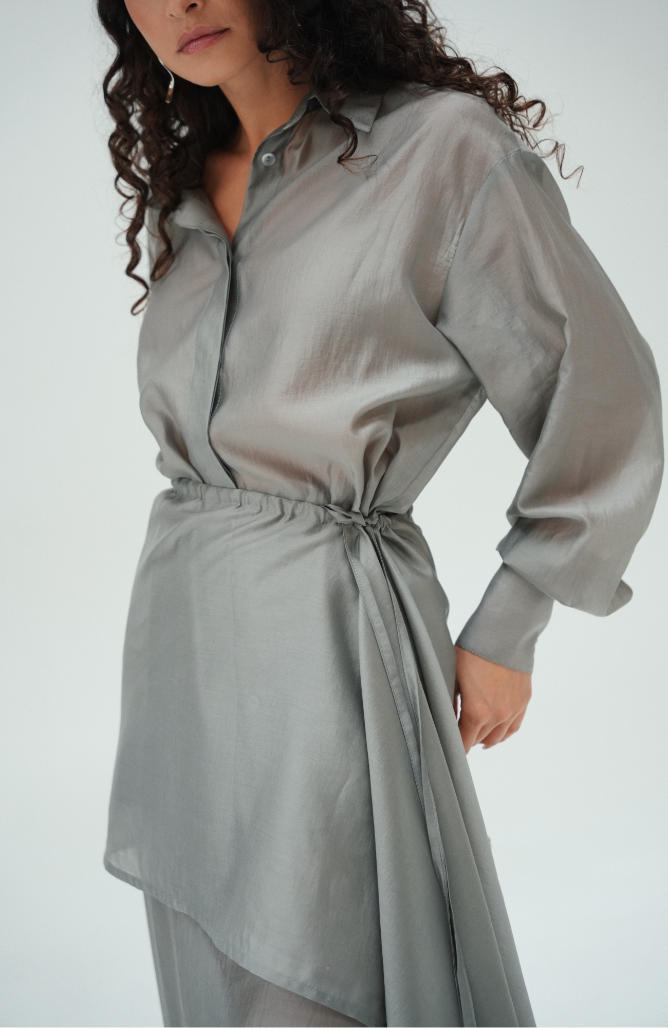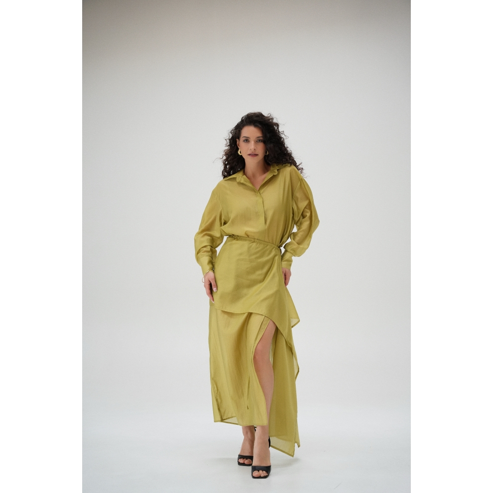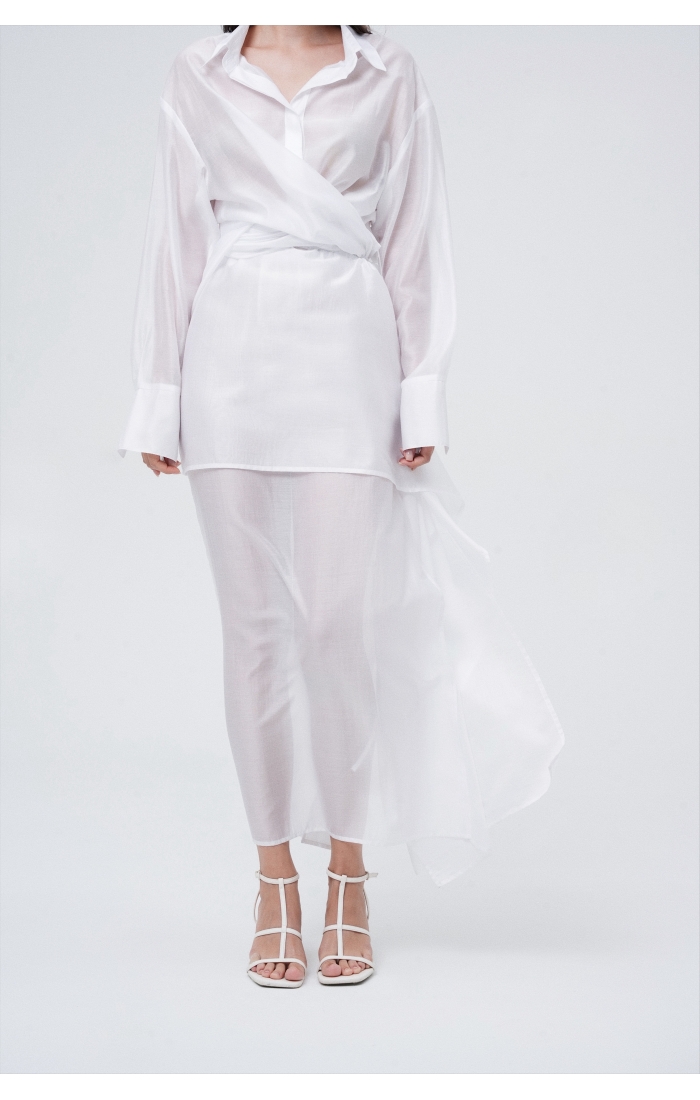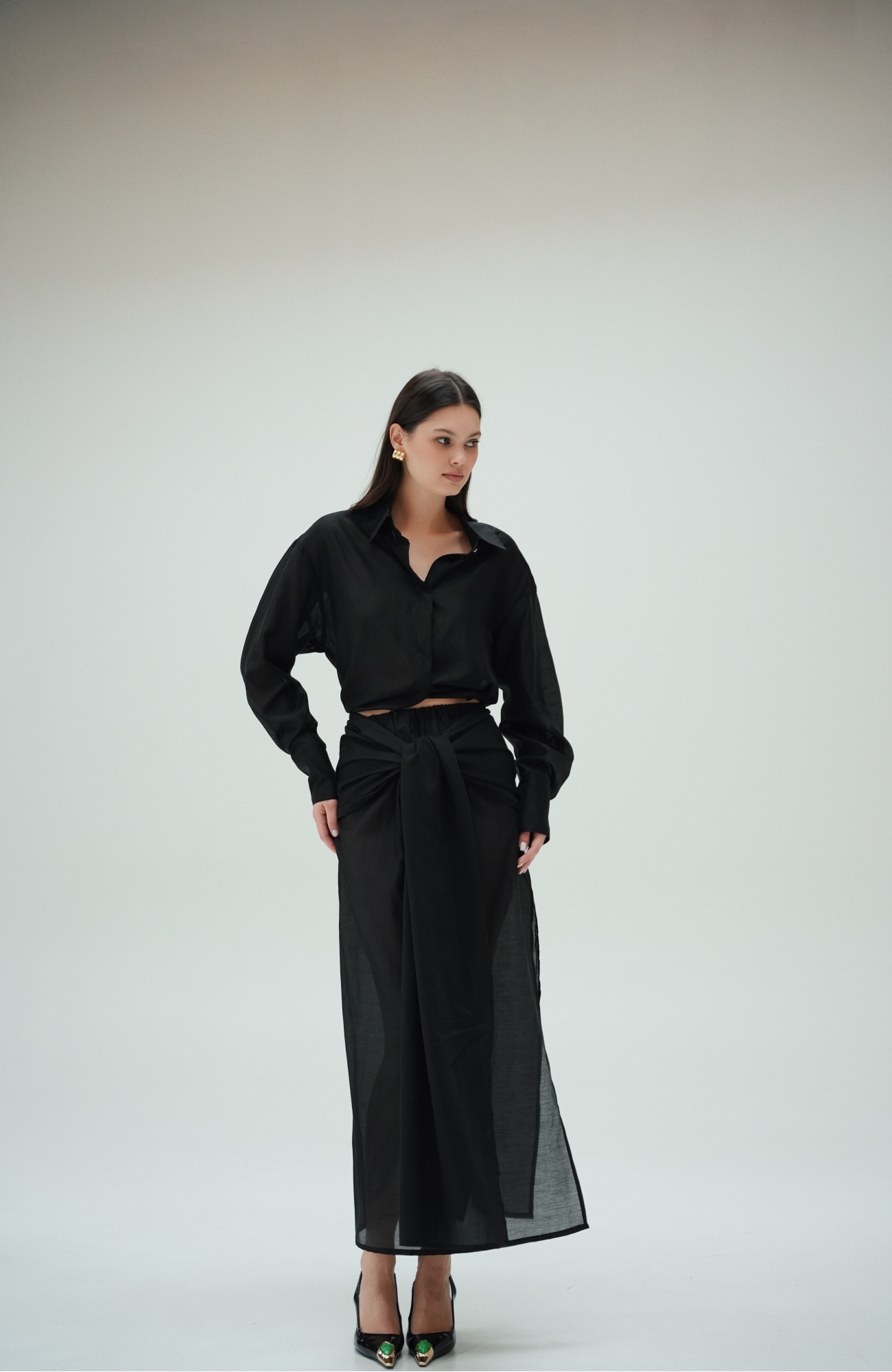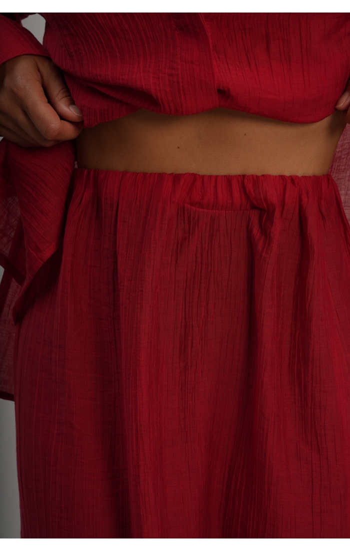 Юбка прямого кроя на резинке. Сверху надевается баска с длинными хвостами, которые добавляют женственности. Юбка-баска на кулиске, её можно завязывать на саму кулиску, оставляя спущенными хвосты, либо завязывать сами хвосты. Также баску можно трансформировать и использовать как топ. Баску легко интегрировать в разные образы, надевая поверх брюк, джинс, платьев и тд.