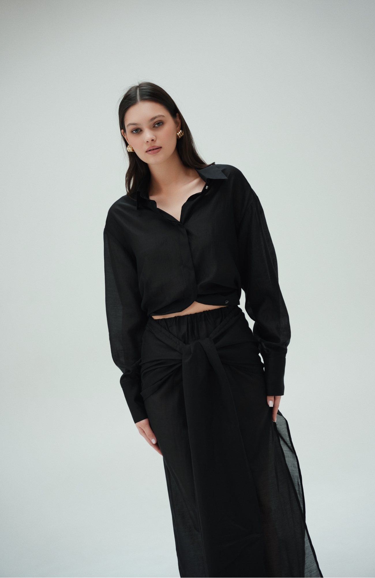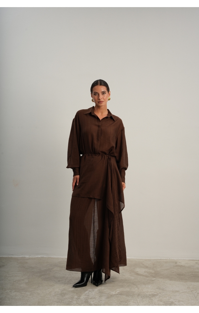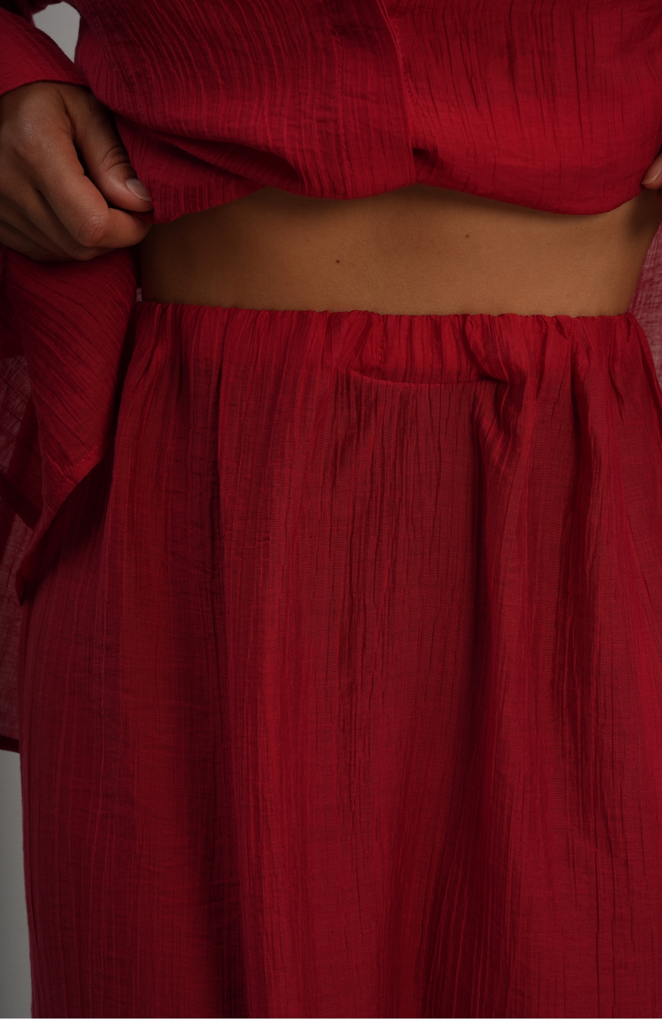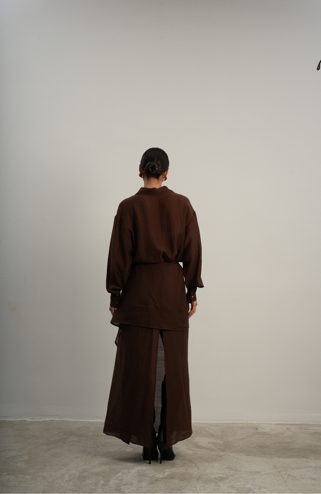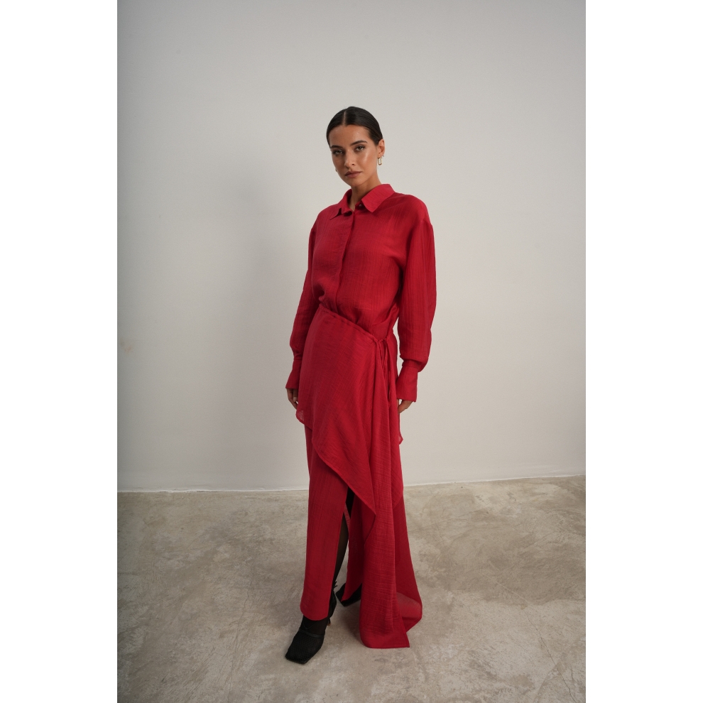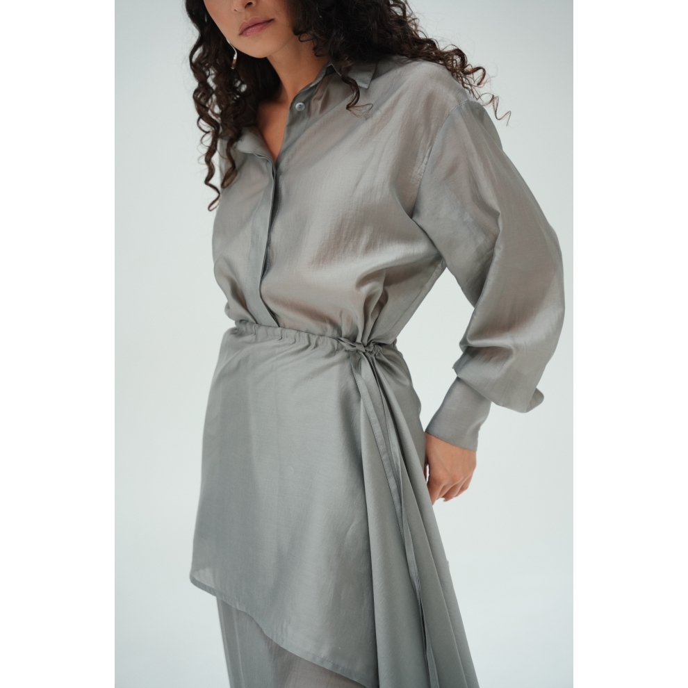 Юбка прямого кроя на резинке. Сверху надевается баска с длинными хвостами, которые добавляют женственности. Юбка-баска на кулиске, её можно завязывать на саму кулиску, оставляя спущенными хвосты, либо завязывать сами хвосты. Также баску можно трансформировать и использовать как топ. Баску легко интегрировать в разные образы, надевая поверх брюк, джинс, платьев и тд.