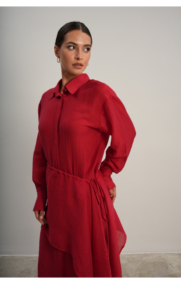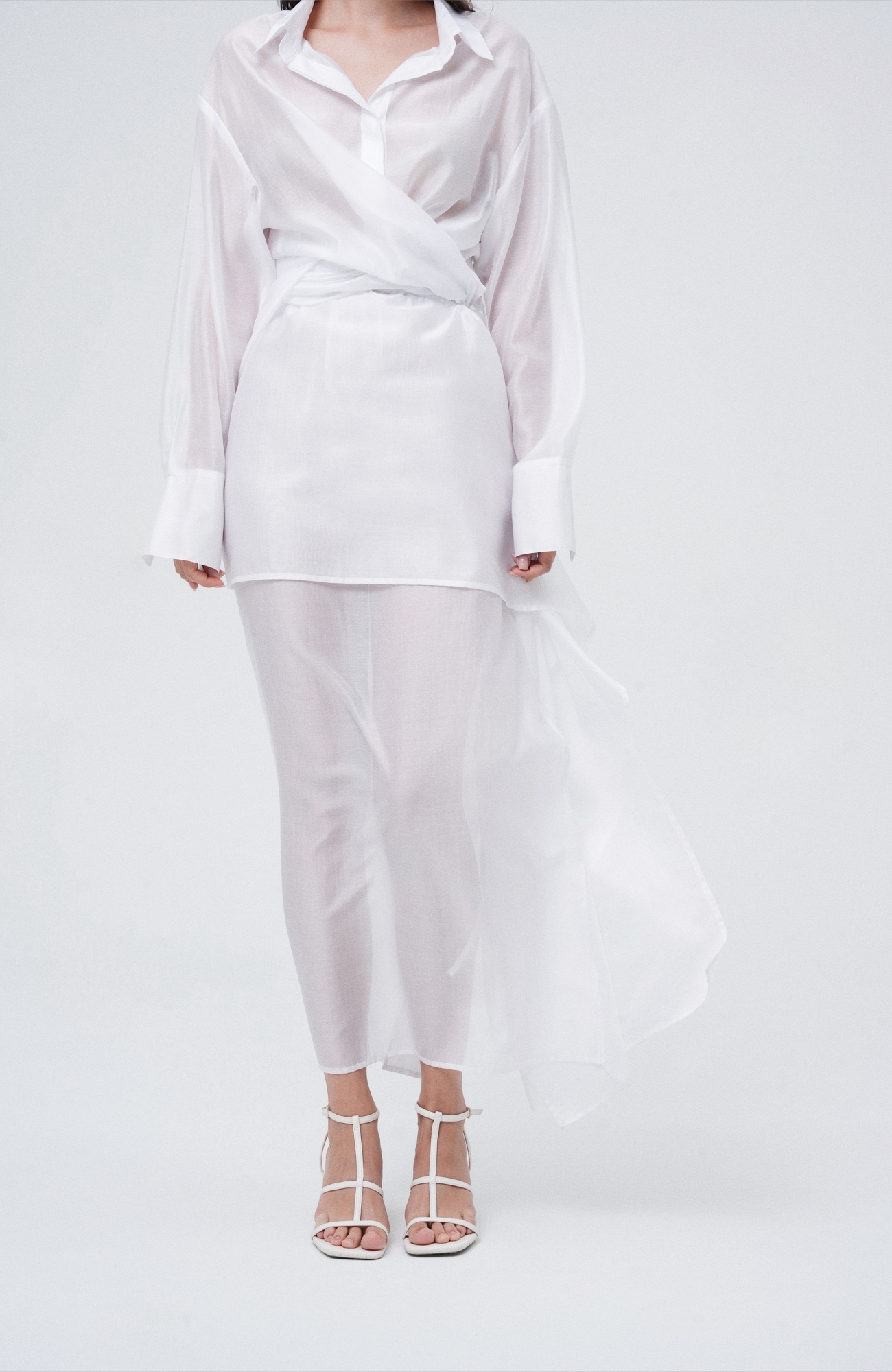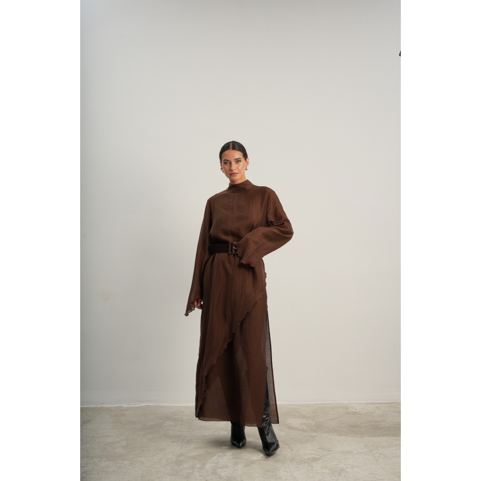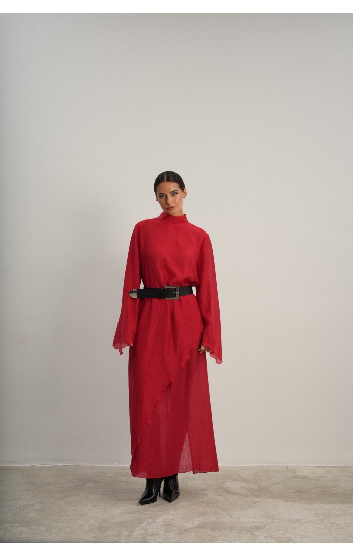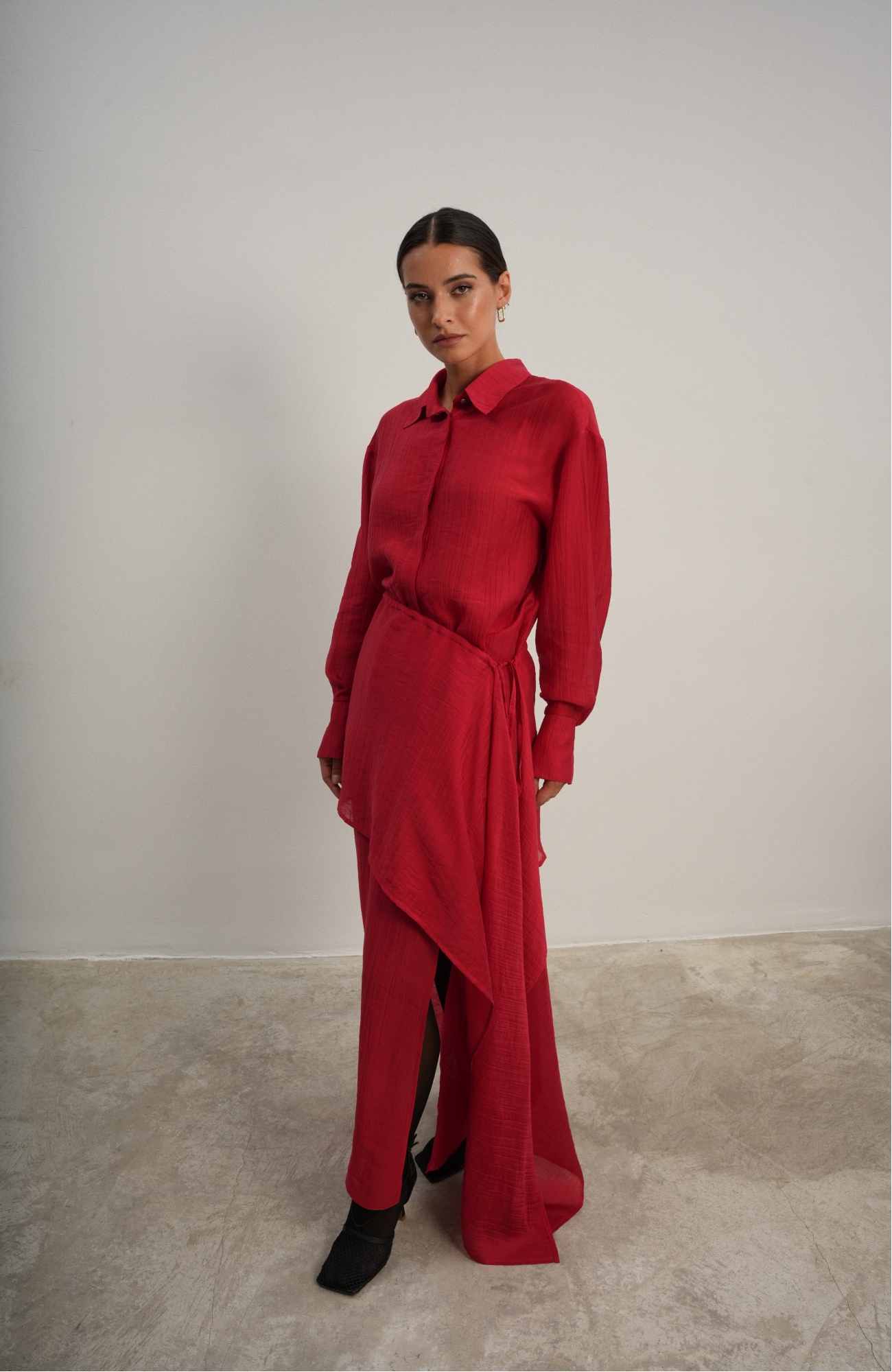 Юбка прямого кроя на резинке. Сверху надевается баска с длинными хвостами, которые добавляют женственности. Юбка-баска на кулиске, её можно завязывать на саму кулиску, оставляя спущенными хвосты, либо завязывать сами хвосты. Также баску можно трансформировать и использовать как топ. Баску легко интегрировать в разные образы, надевая поверх брюк, джинс, платьев и тд.