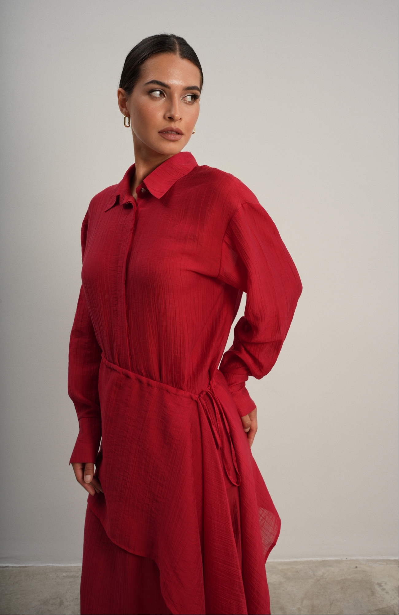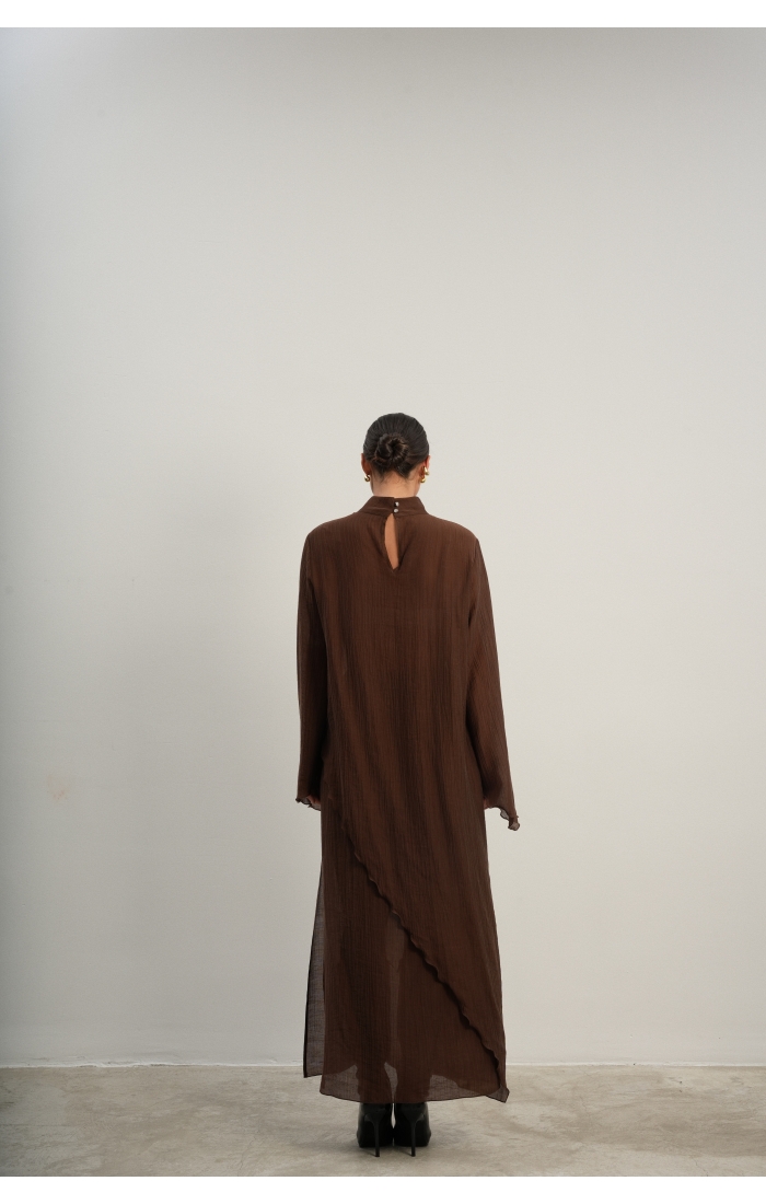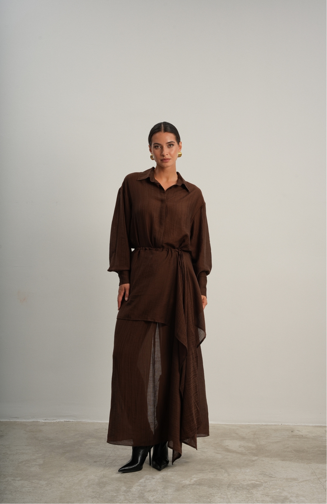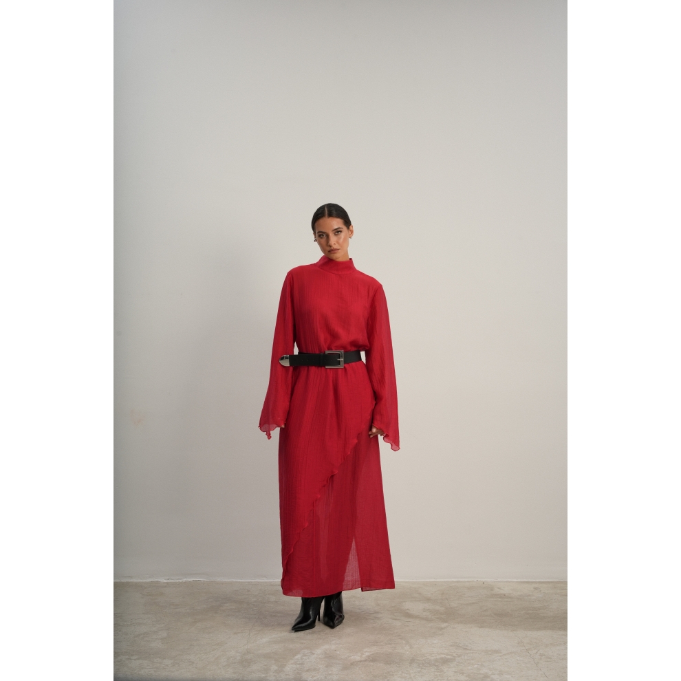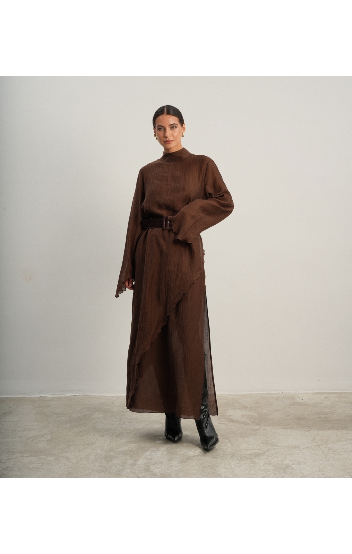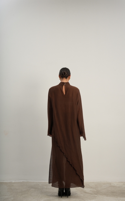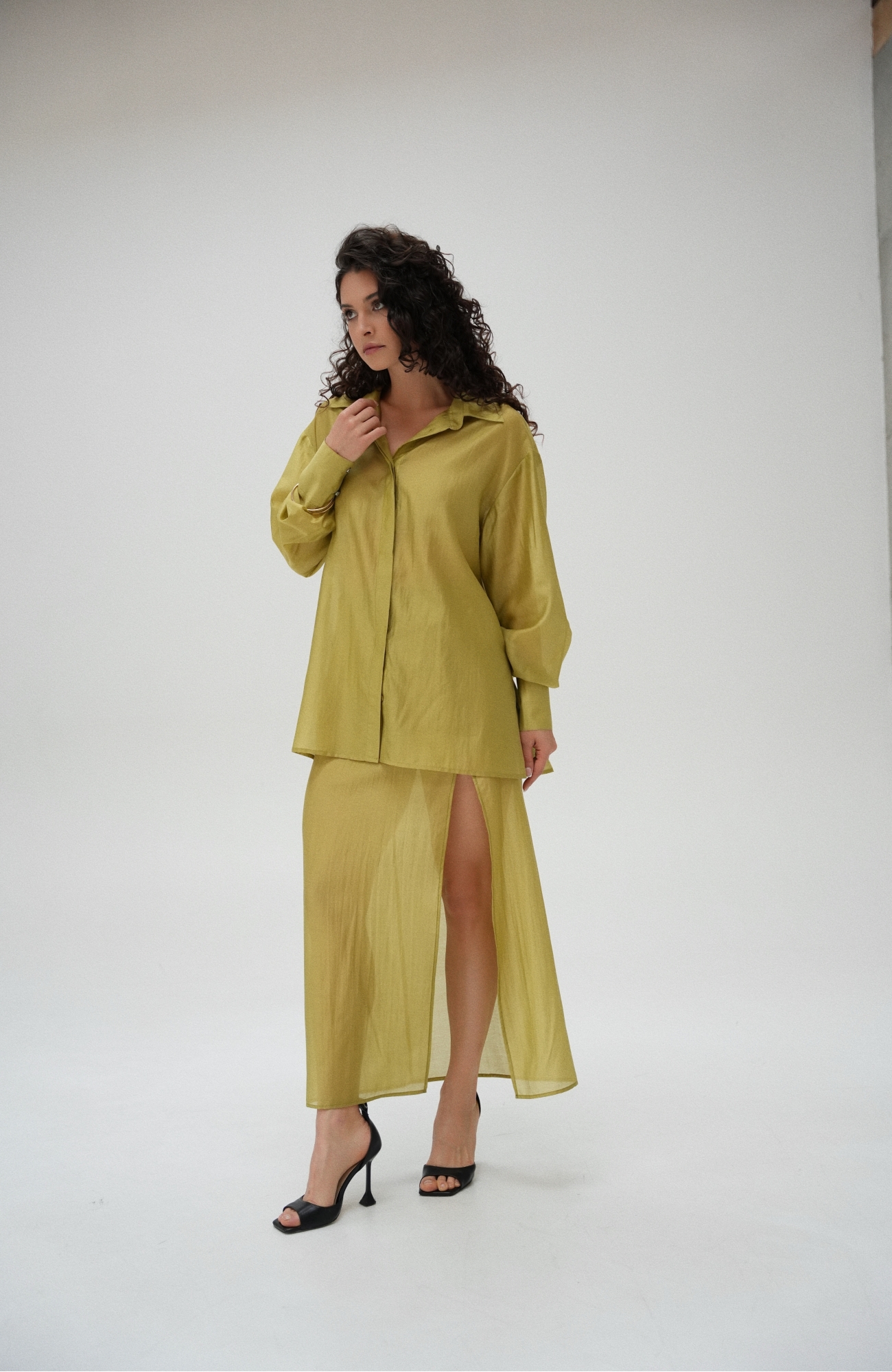 Юбка прямого кроя на резинке. Сверху надевается баска с длинными хвостами, которые добавляют женственности. Юбка-баска на кулиске, её можно завязывать на саму кулиску, оставляя спущенными хвосты, либо завязывать сами хвосты. Также баску можно трансформировать и использовать как топ. Баску легко интегрировать в разные образы, надевая поверх брюк, джинс, платьев и тд.