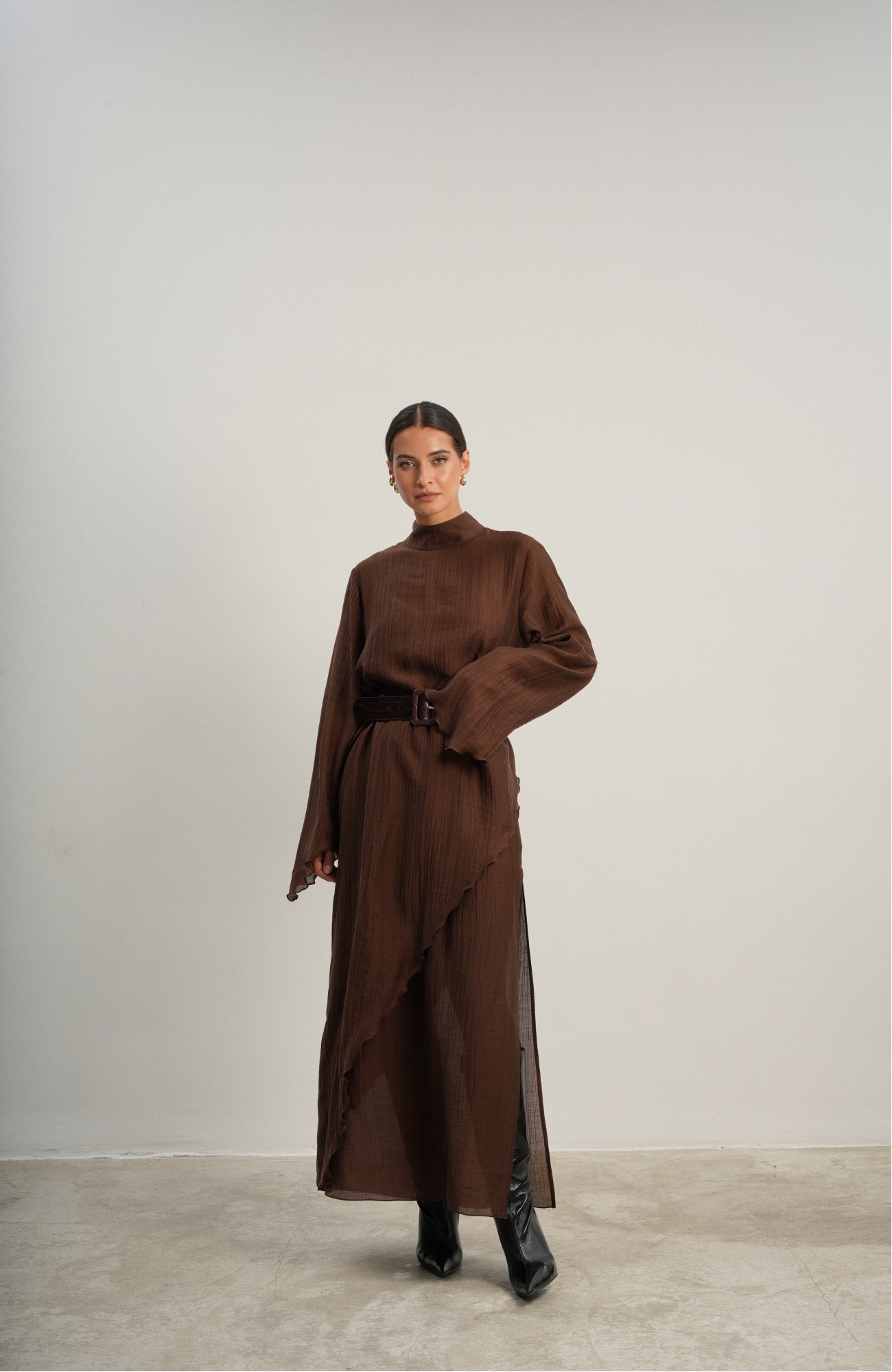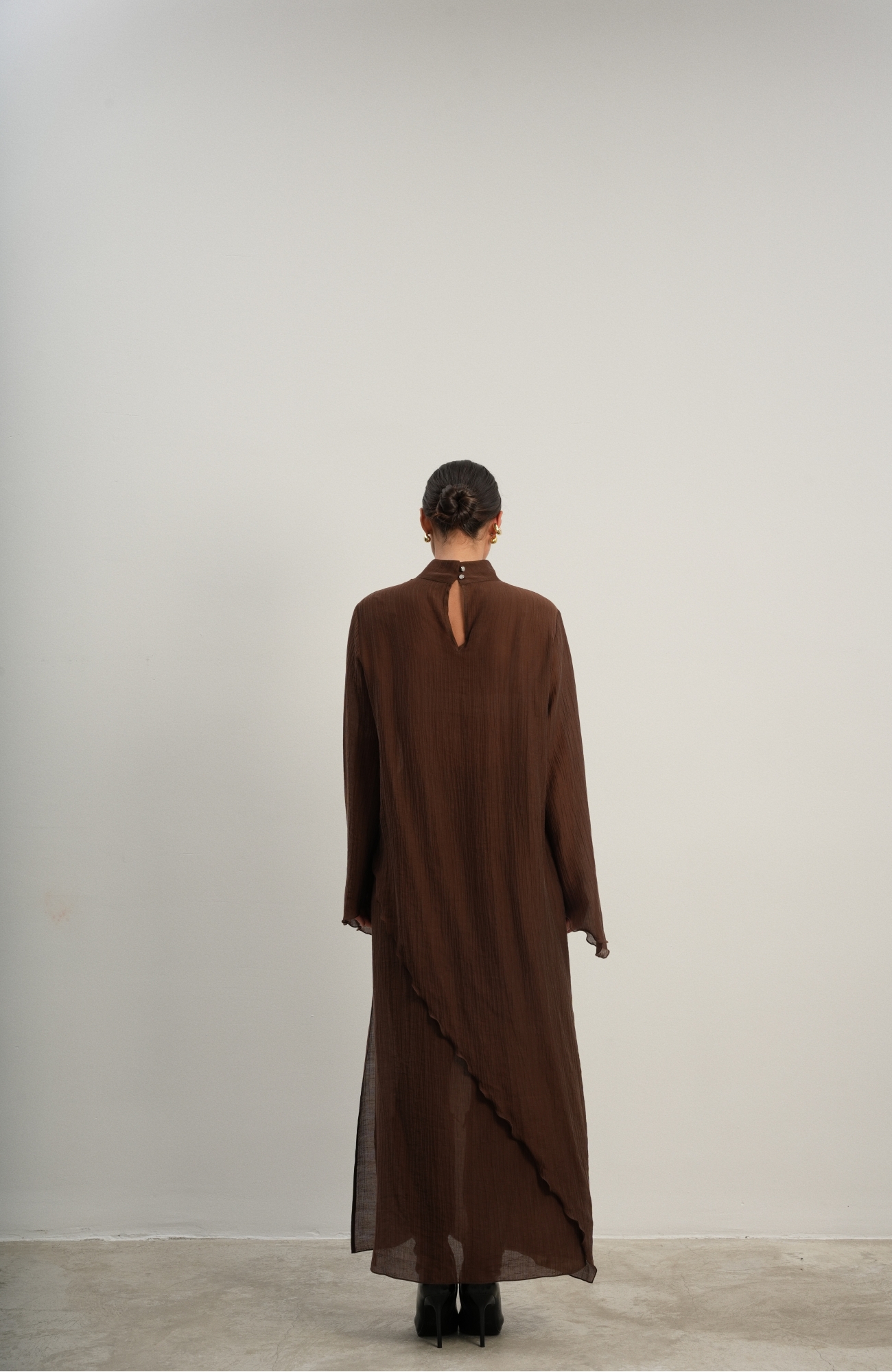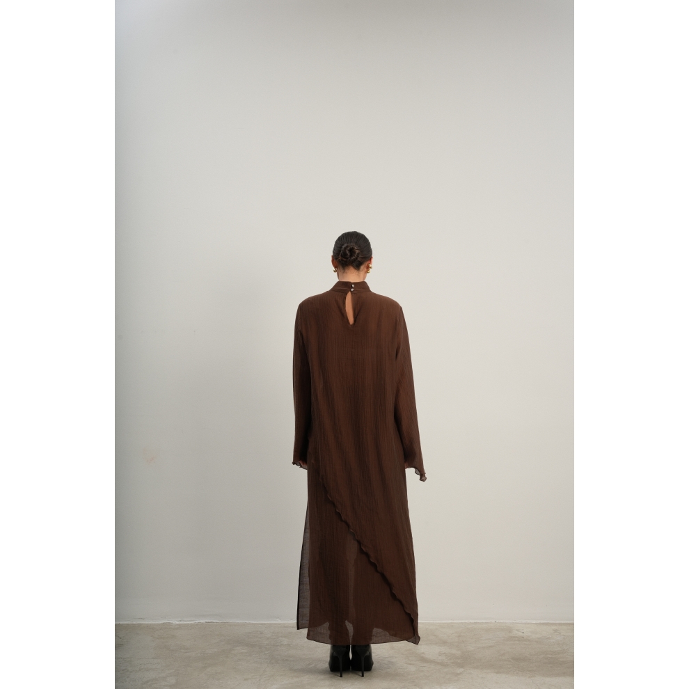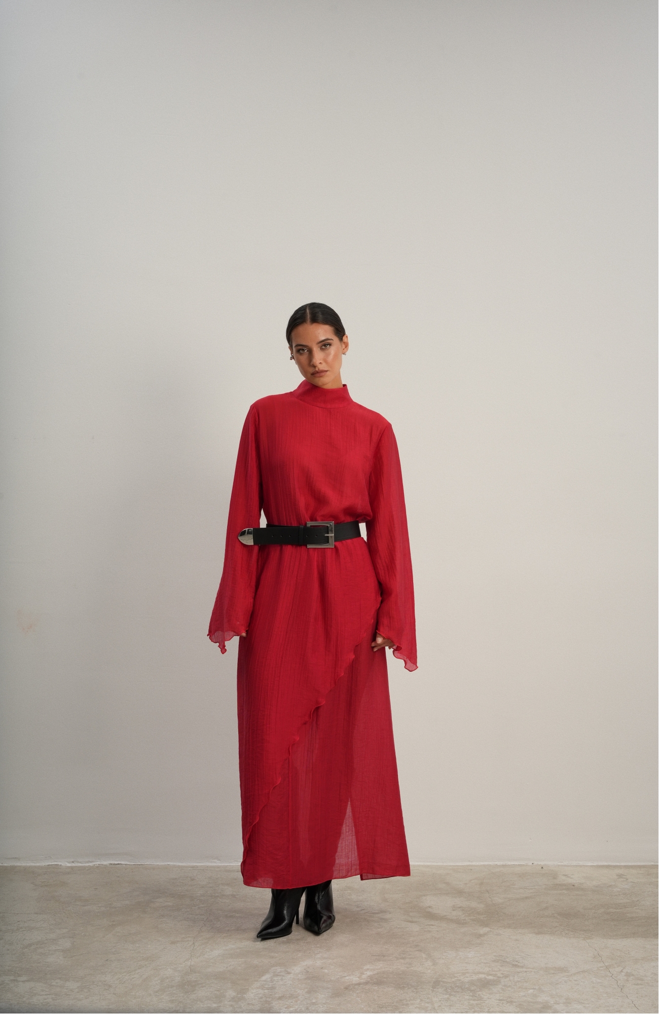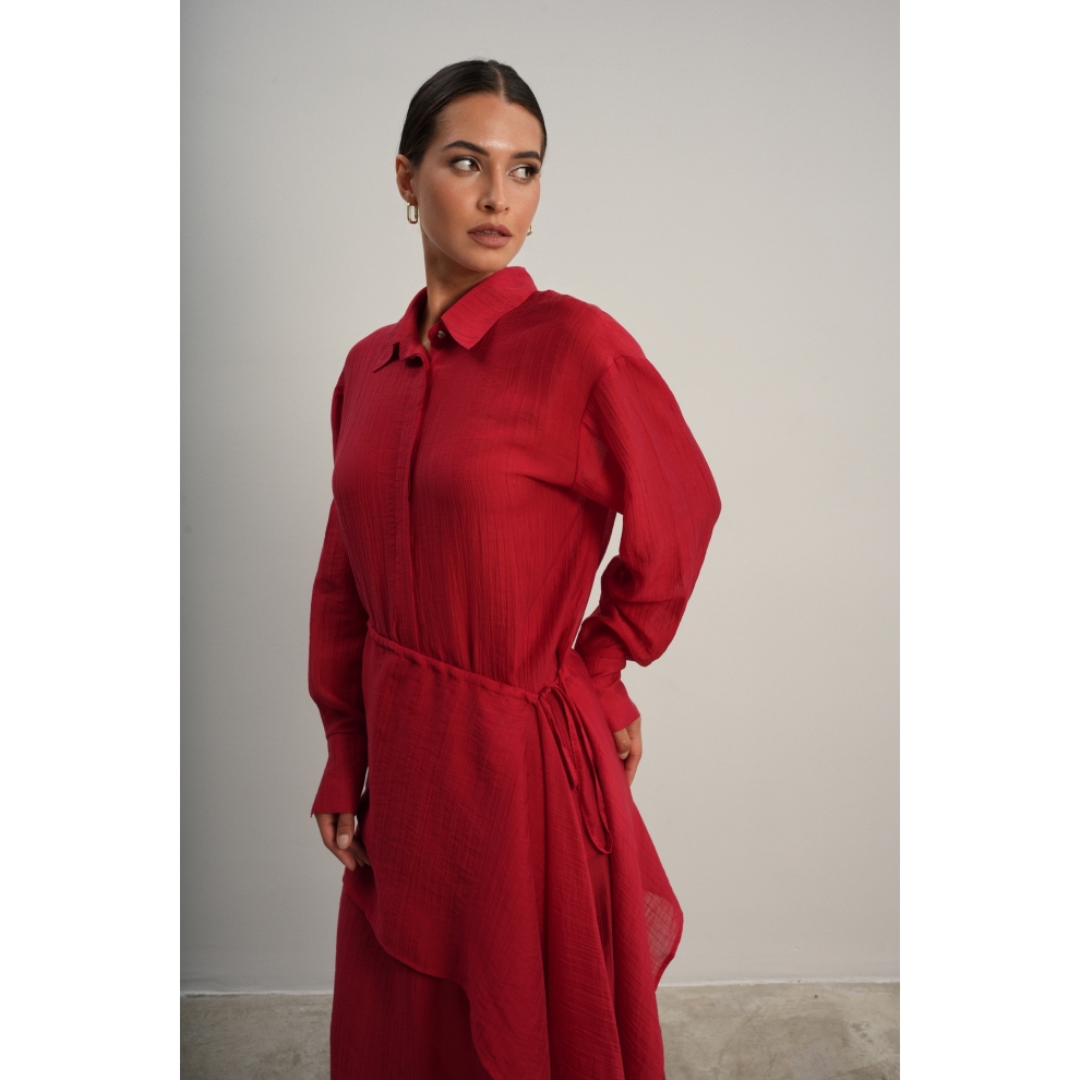 Юбка прямого кроя на резинке. Сверху надевается баска с длинными хвостами, которые добавляют женственности. Юбка-баска на кулиске, её можно завязывать на саму кулиску, оставляя спущенными хвосты, либо завязывать сами хвосты. Также баску можно трансформировать и использовать как топ. Баску легко интегрировать в разные образы, надевая поверх брюк, джинс, платьев и тд.