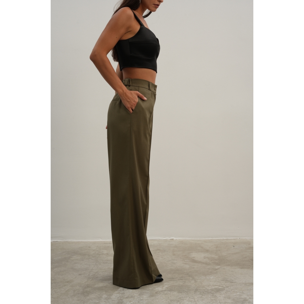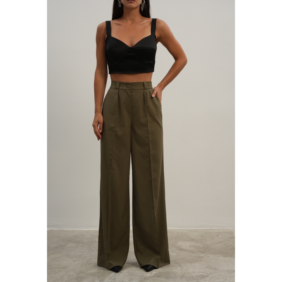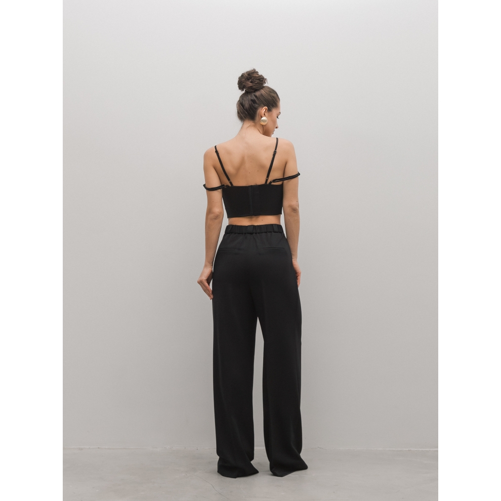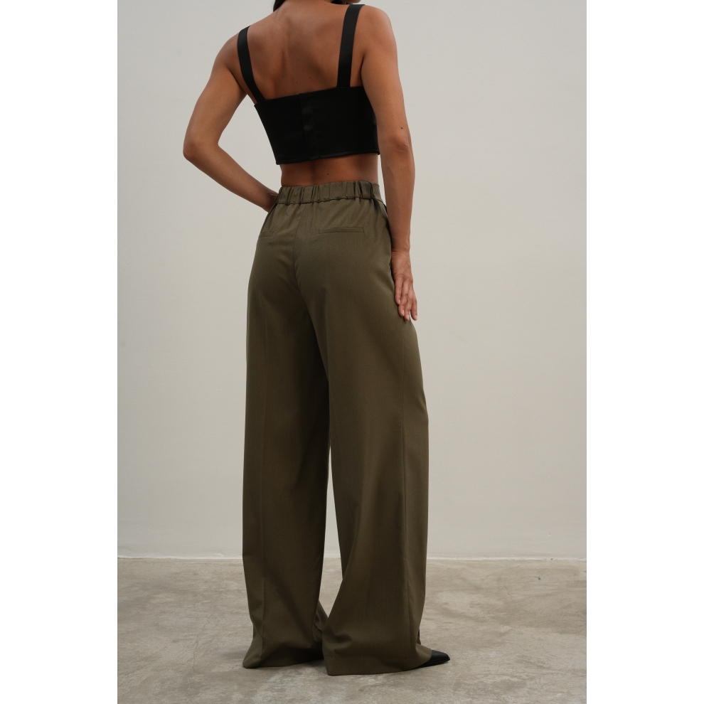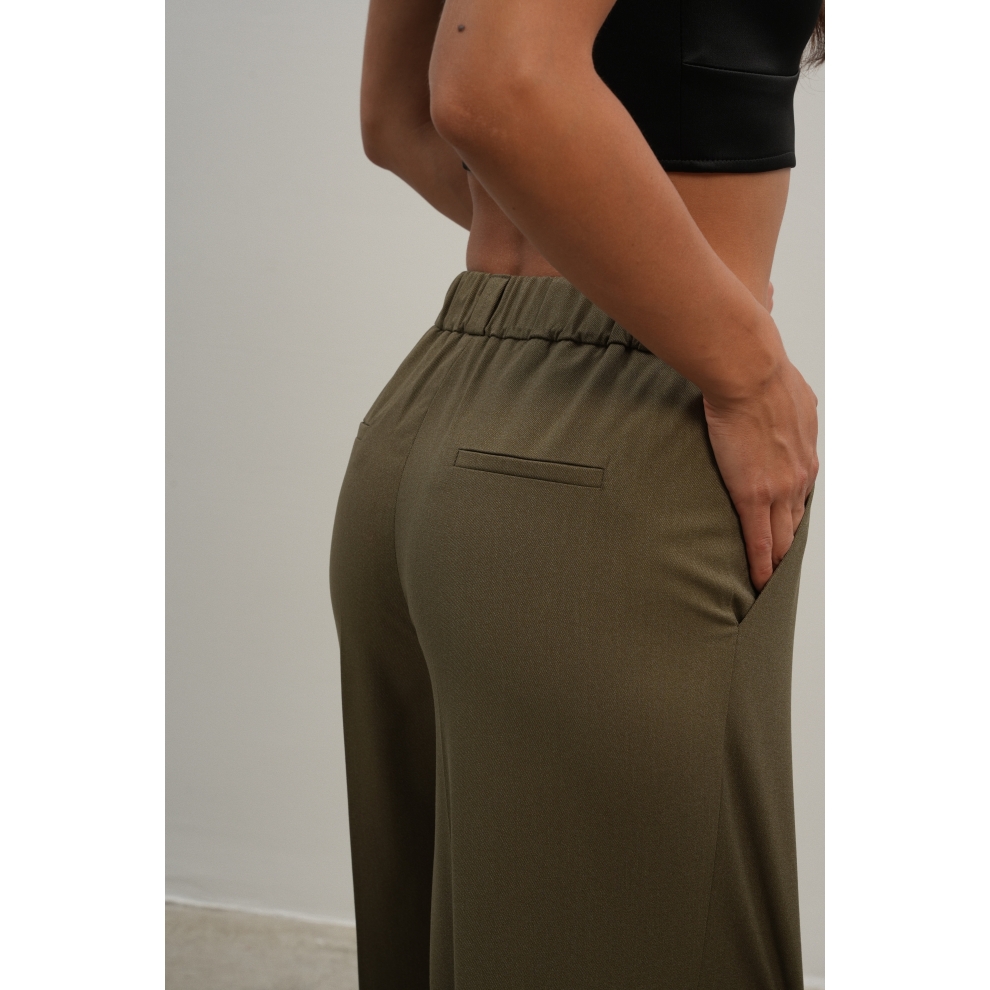 Брюки палаццо выполнены из поливискозной мягкой костюмной ткани. Модель имеет застроченную стрелку. Застегиваются на молнию и пуговицу. Сзади на линии талии расположена резинка для комфортной посадки. В боковых швах имеют два глубоких боковых кармана и два декоративных кармана-обманки на спинке изделия.