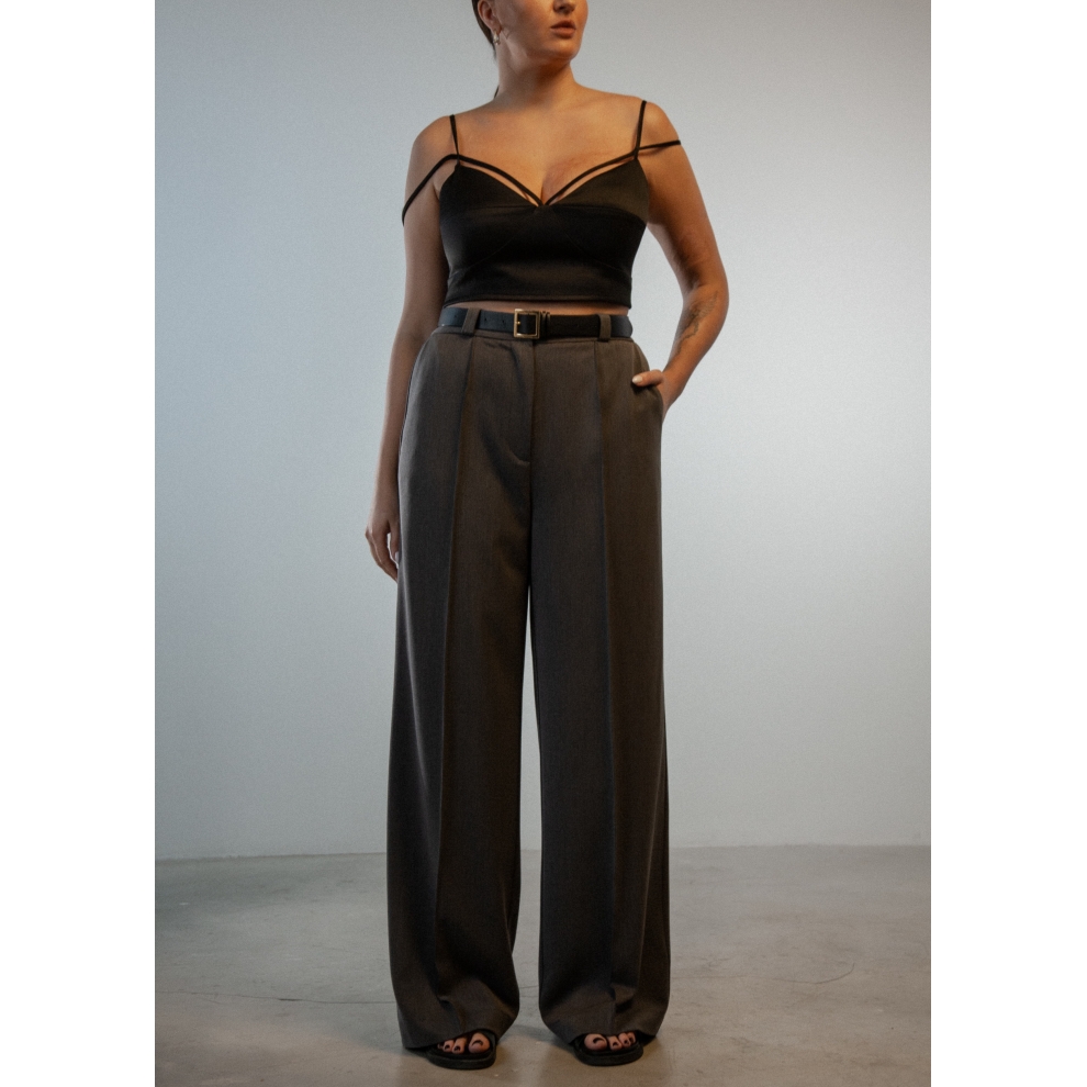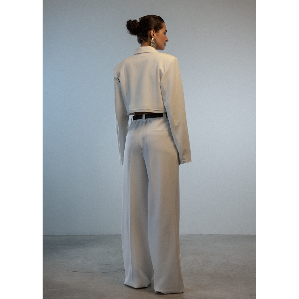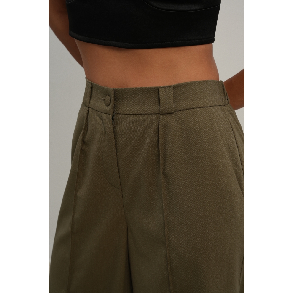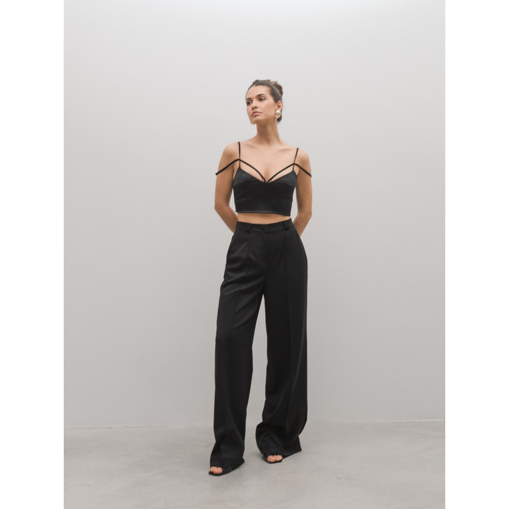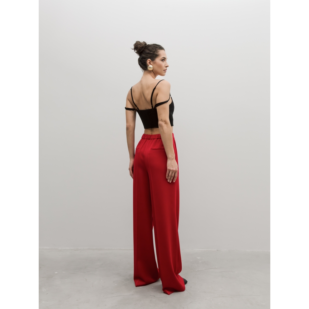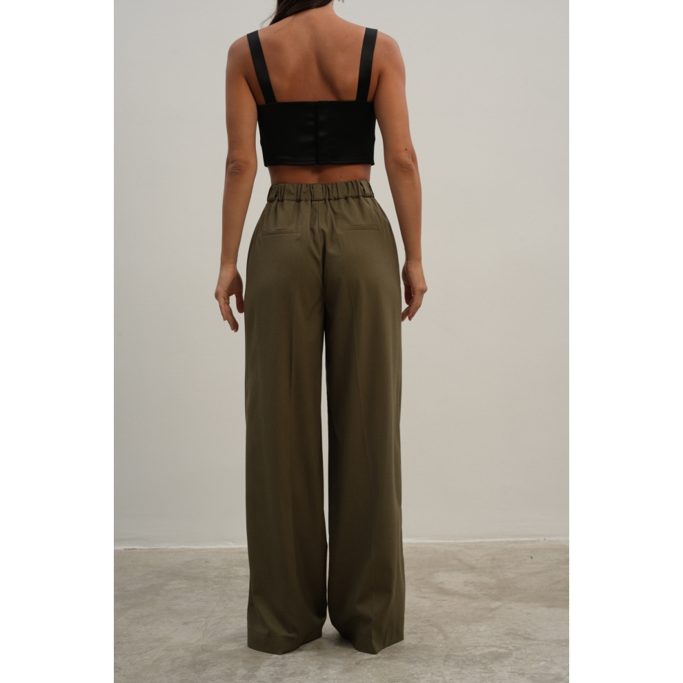 Брюки палаццо выполнены из поливискозной мягкой костюмной ткани. Модель имеет застроченную стрелку. Застегиваются на молнию и пуговицу. Сзади на линии талии расположена резинка для комфортной посадки. В боковых швах имеют два глубоких боковых кармана и два декоративных кармана-обманки на спинке изделия.