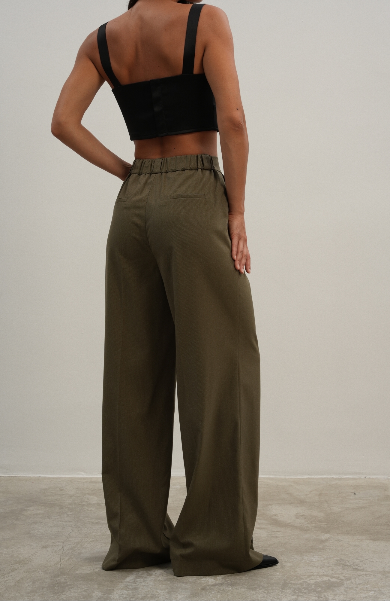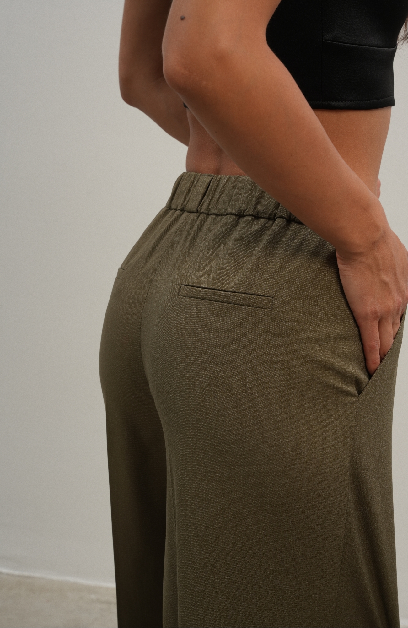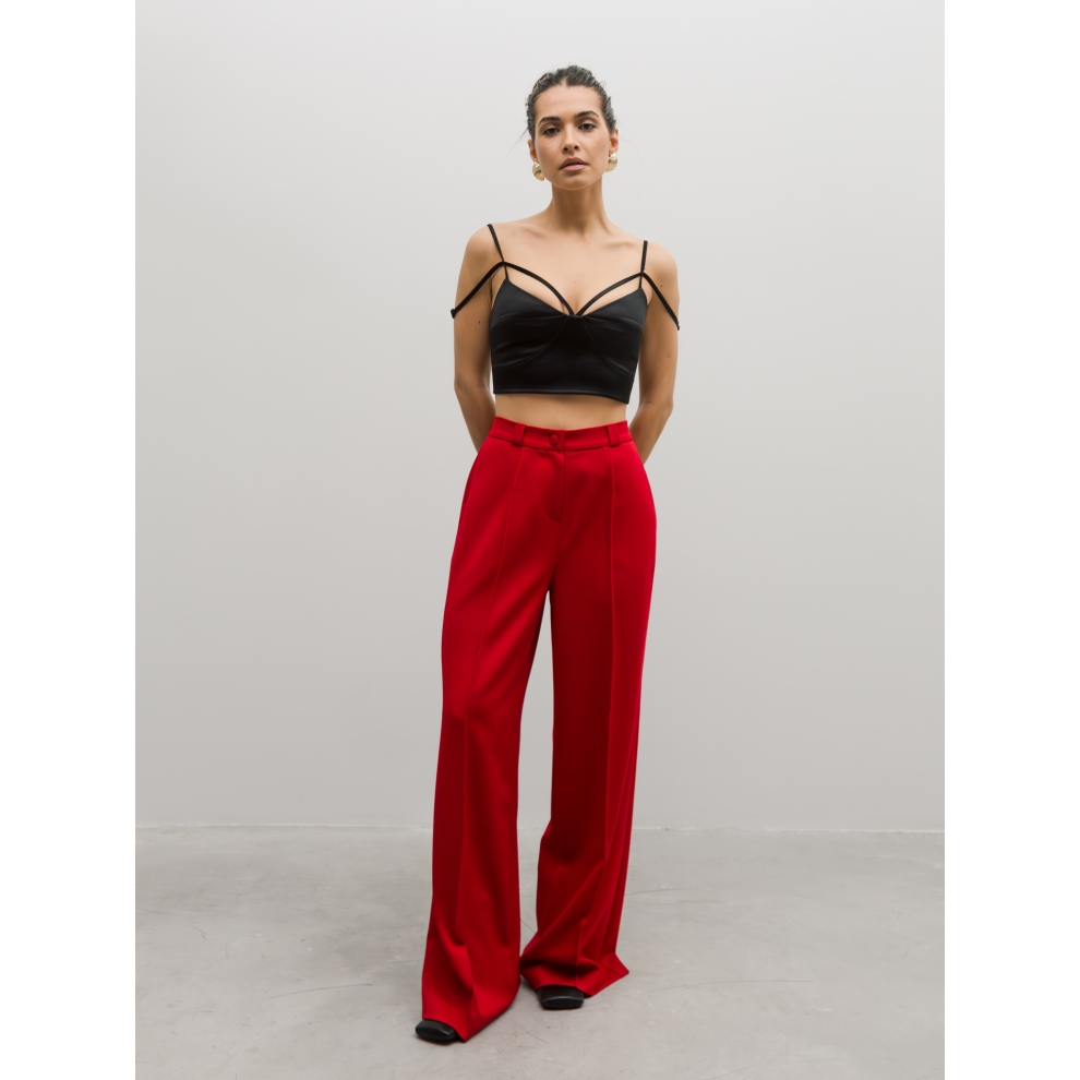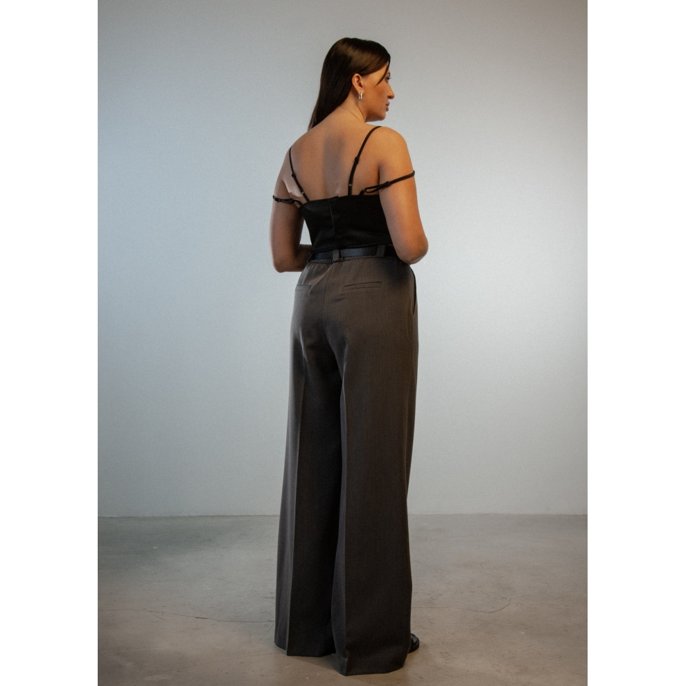 Брюки палаццо выполнены из поливискозной мягкой костюмной ткани. Модель имеет застроченную стрелку. Застегиваются на молнию и пуговицу. Сзади на линии талии расположена резинка для комфортной посадки. В боковых швах имеют два глубоких боковых кармана и два декоративных кармана-обманки на спинке изделия.