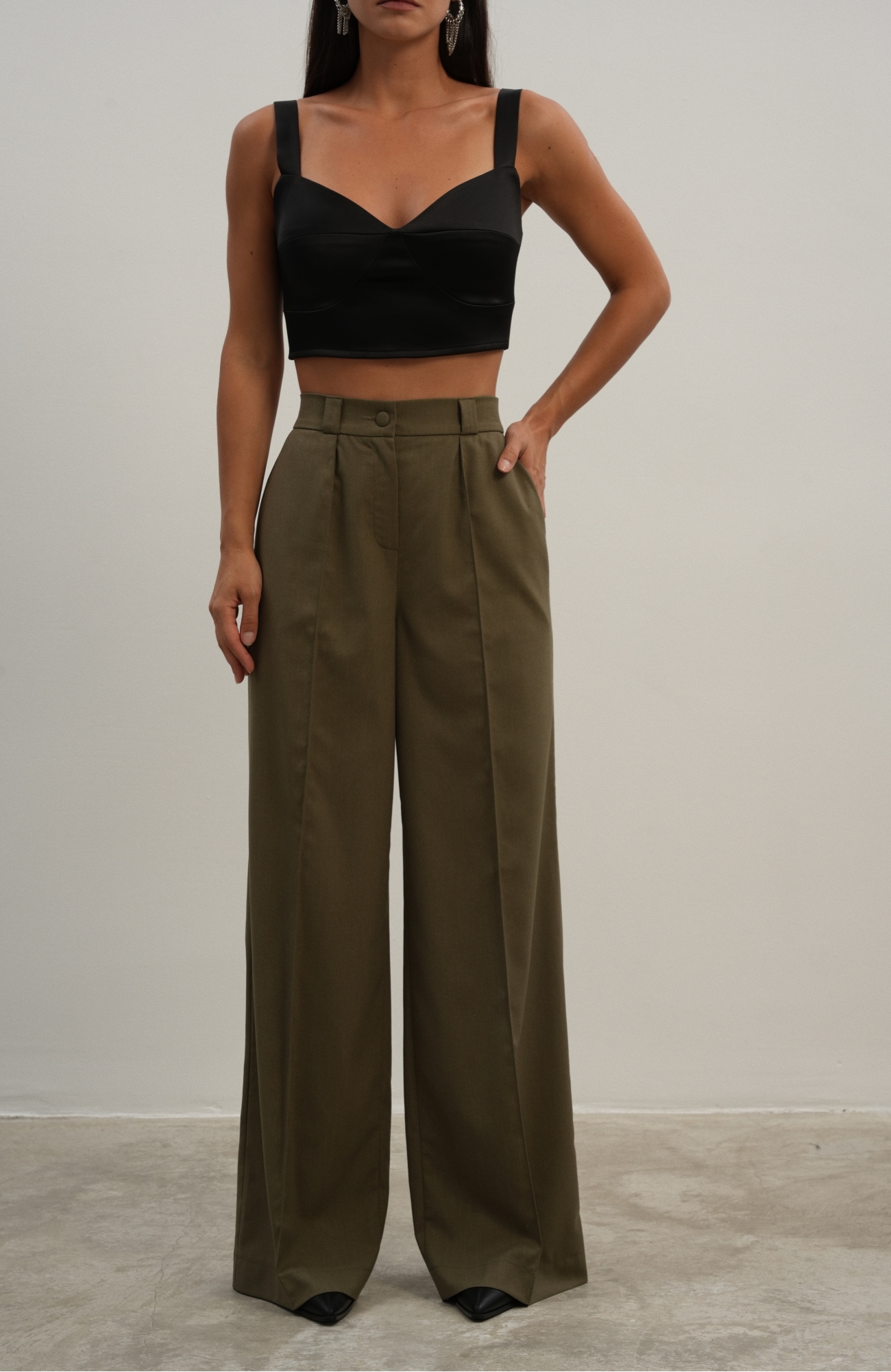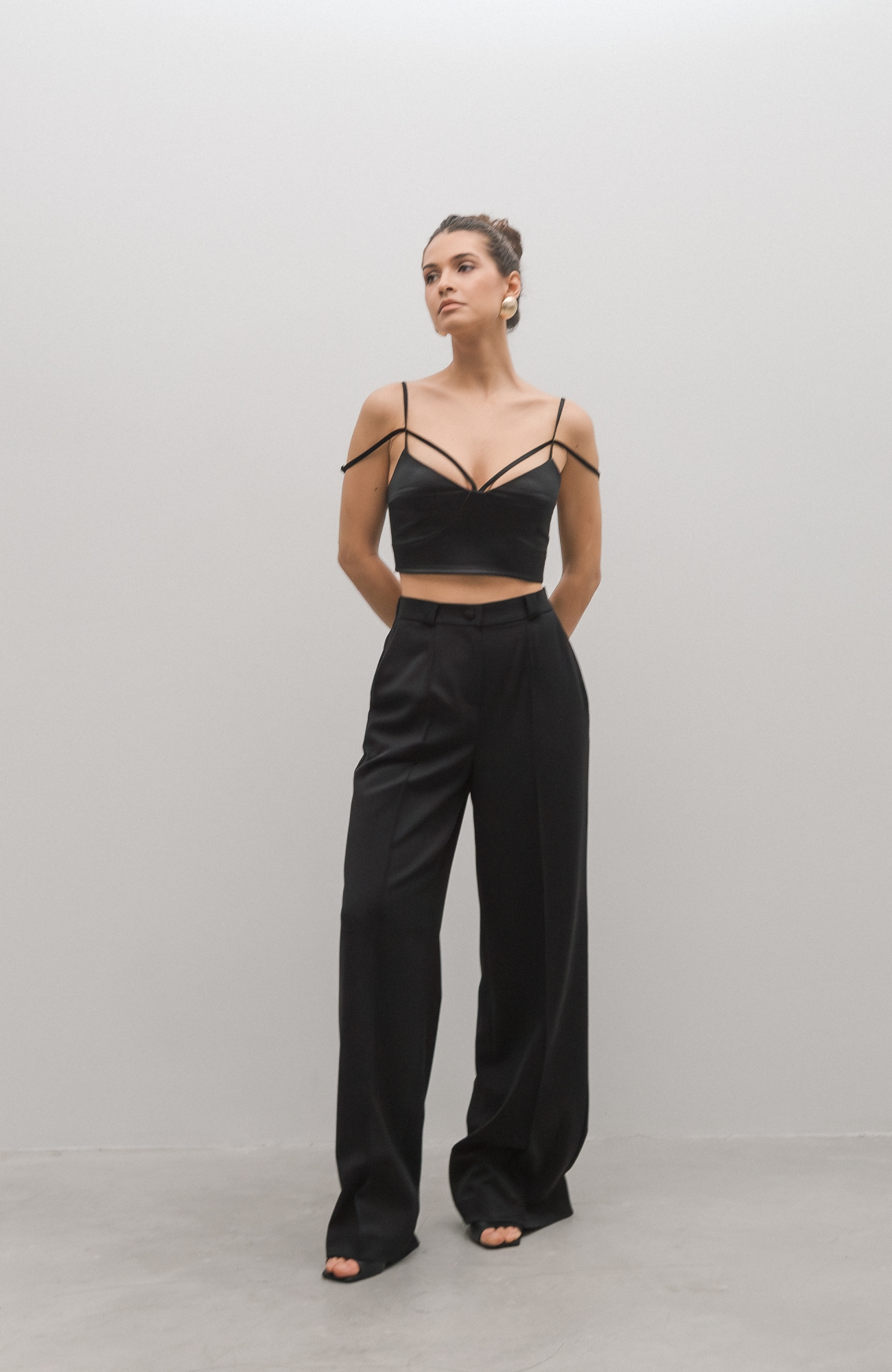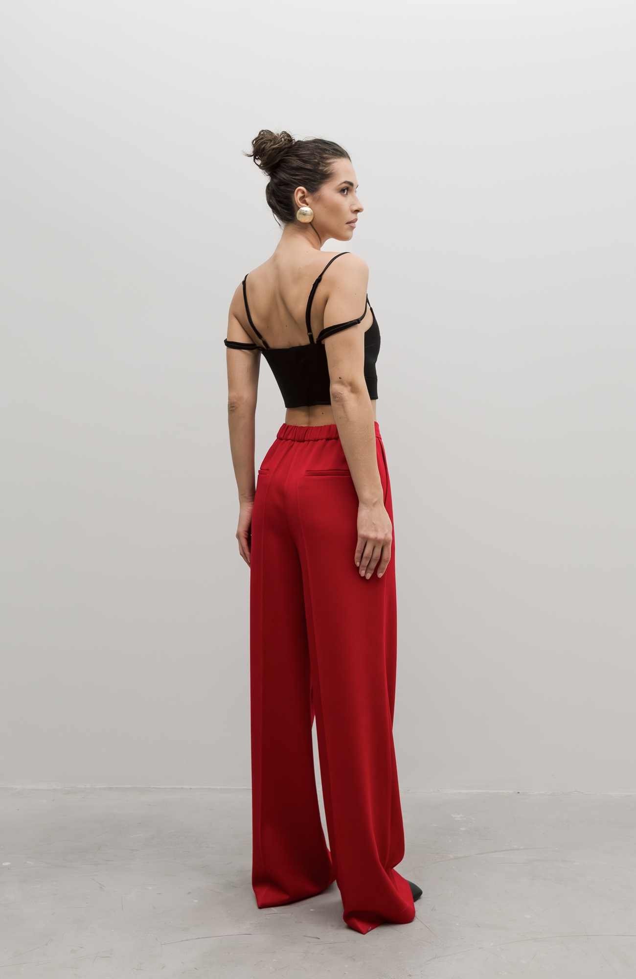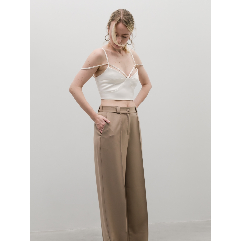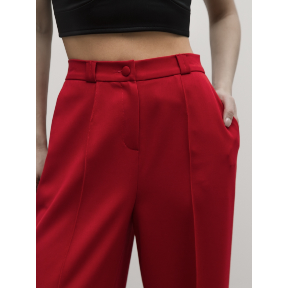 Брюки палаццо выполнены из поливискозной мягкой костюмной ткани. Модель имеет застроченную стрелку. Застегиваются на молнию и пуговицу. Сзади на линии талии расположена резинка для комфортной посадки. В боковых швах имеют два глубоких боковых кармана и два декоративных кармана-обманки на спинке изделия.