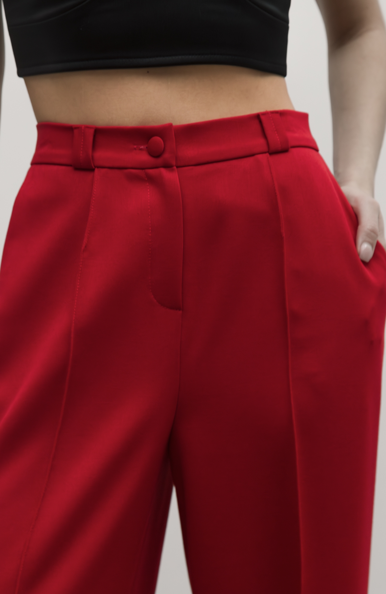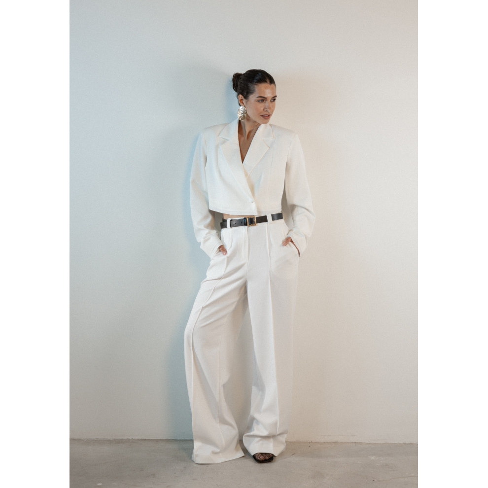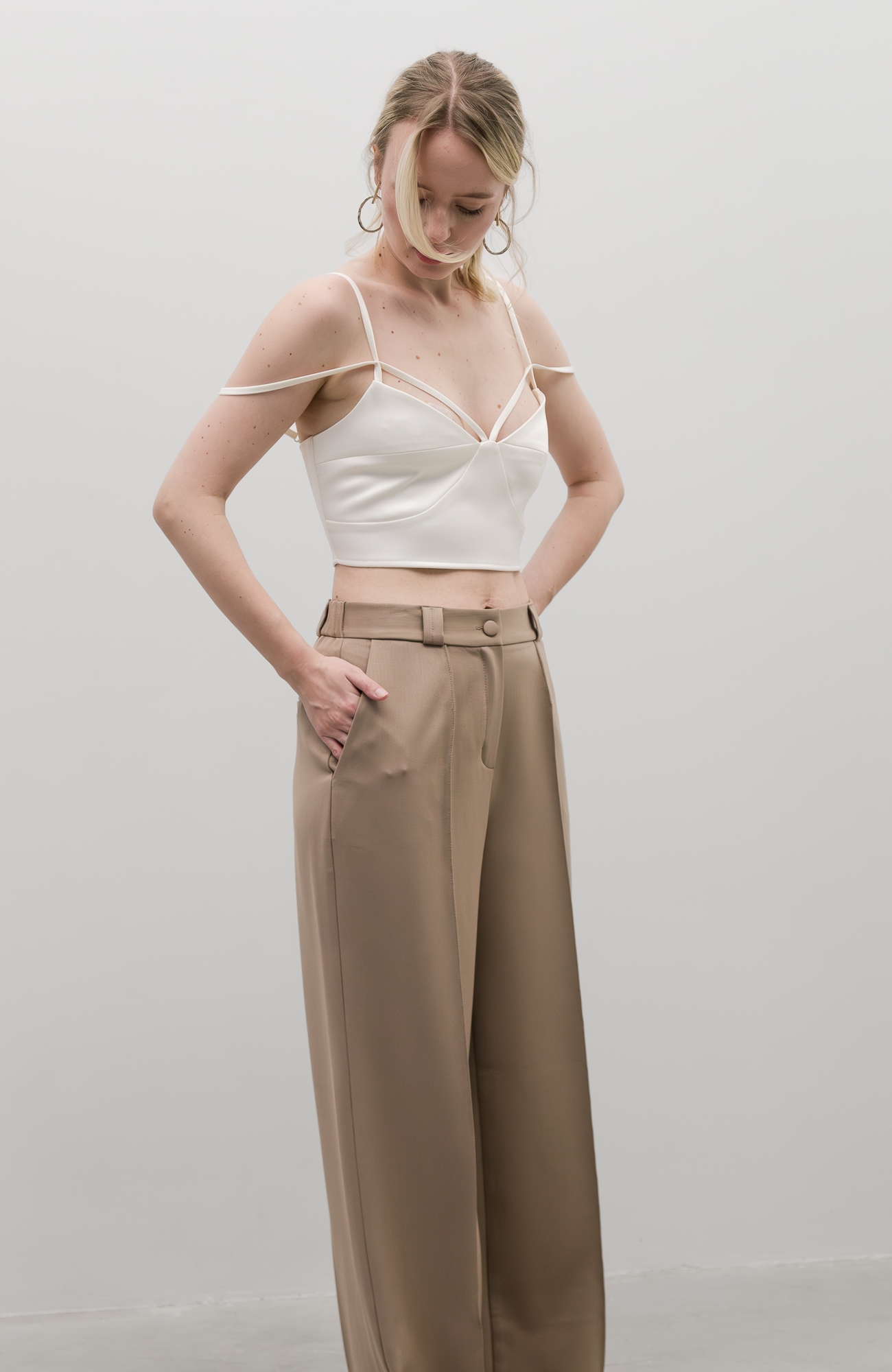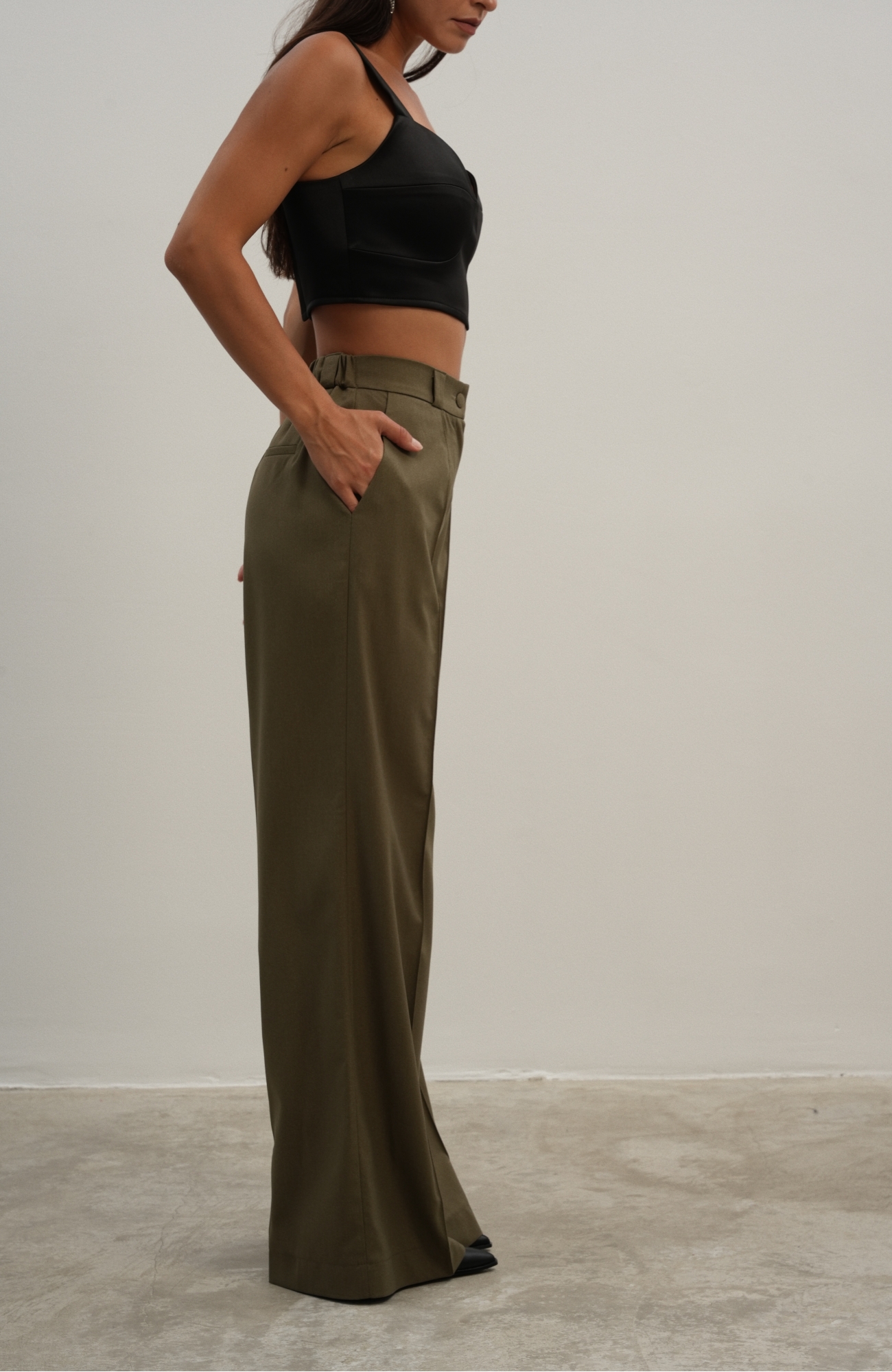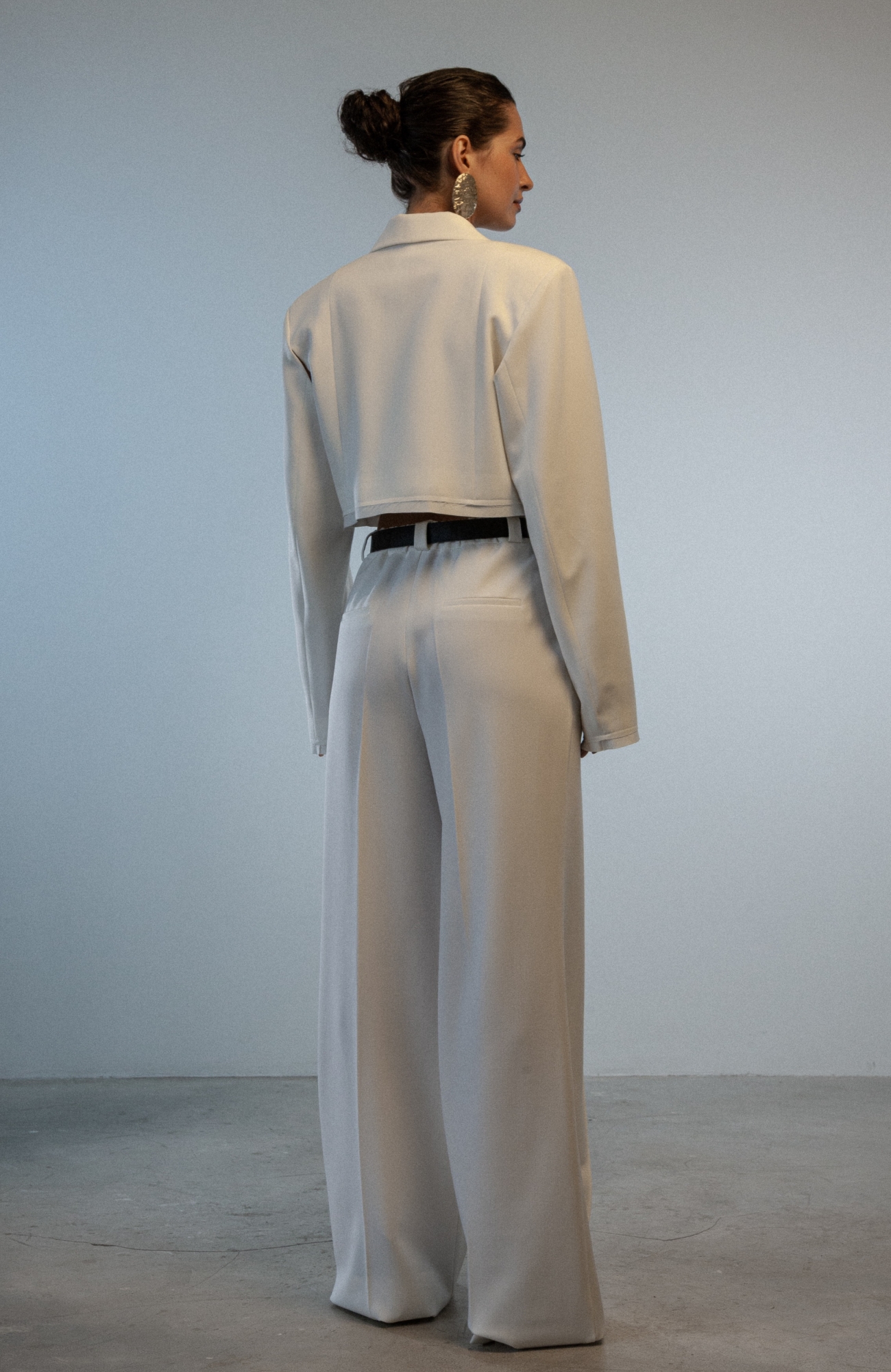 Брюки палаццо выполнены из поливискозной мягкой костюмной ткани. Модель имеет застроченную стрелку. Застегиваются на молнию и пуговицу. Сзади на линии талии расположена резинка для комфортной посадки. В боковых швах имеют два глубоких боковых кармана и два декоративных кармана-обманки на спинке изделия.
