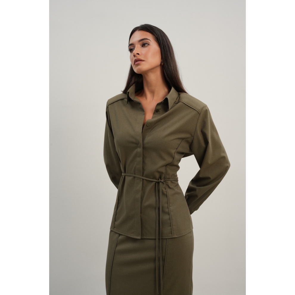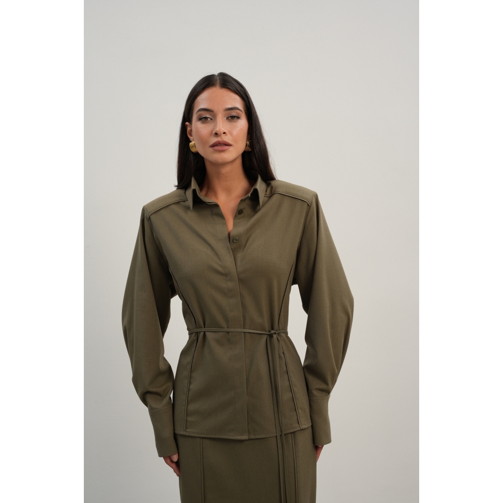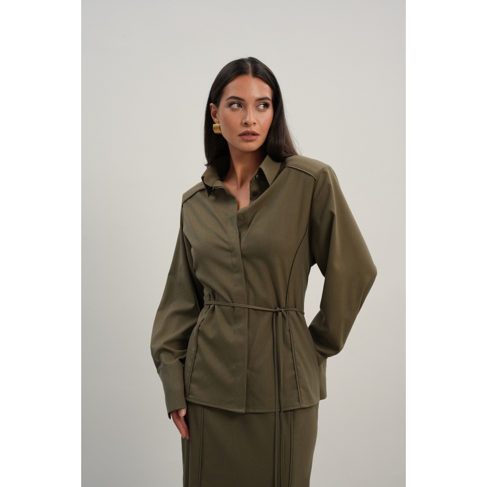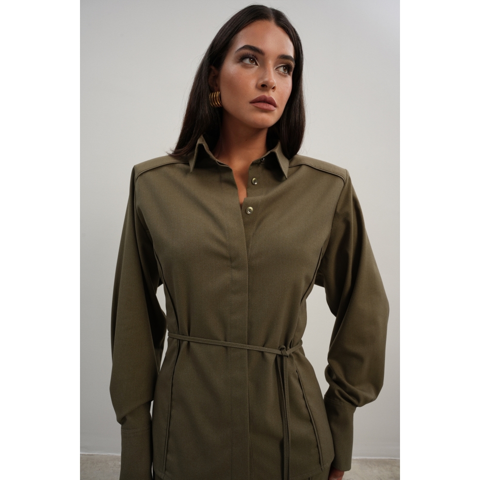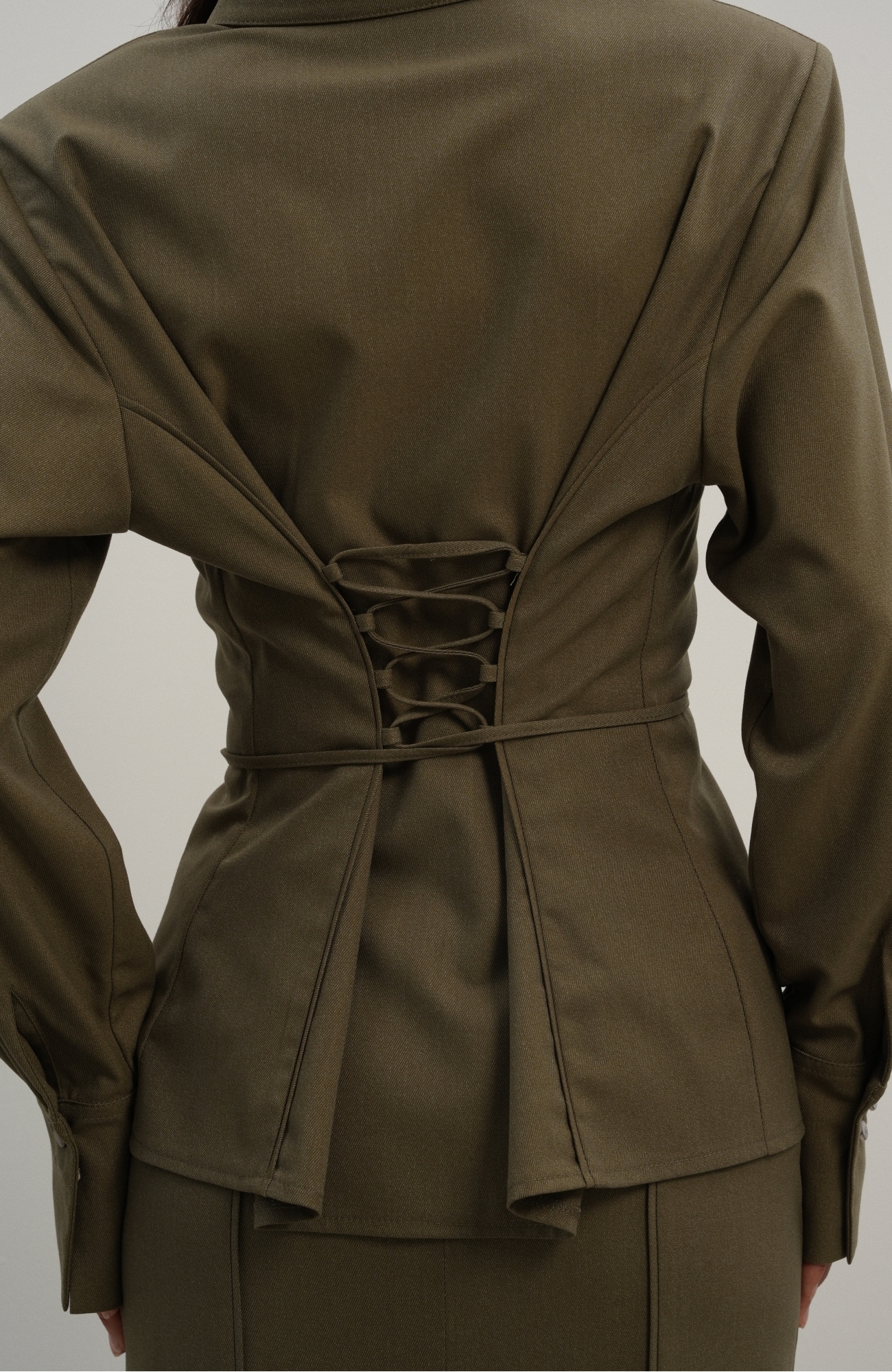 Рубашка с акцентными плечами приталенного силуэта с рельефами. Сзади по спинке расположена шнуровка, которая позволяет регулировать ширину изделия на талии.